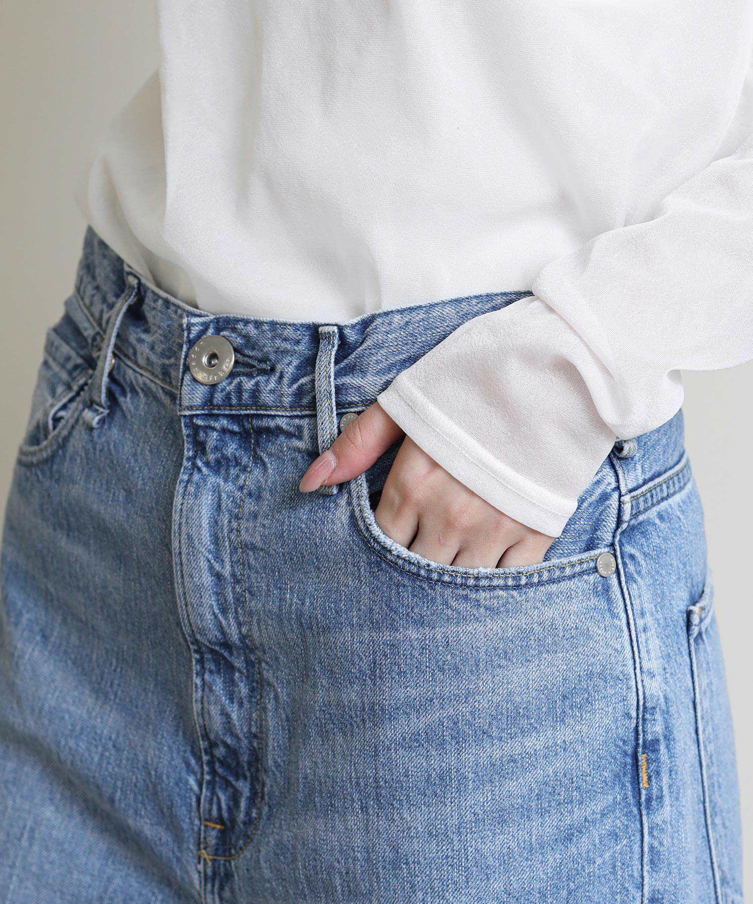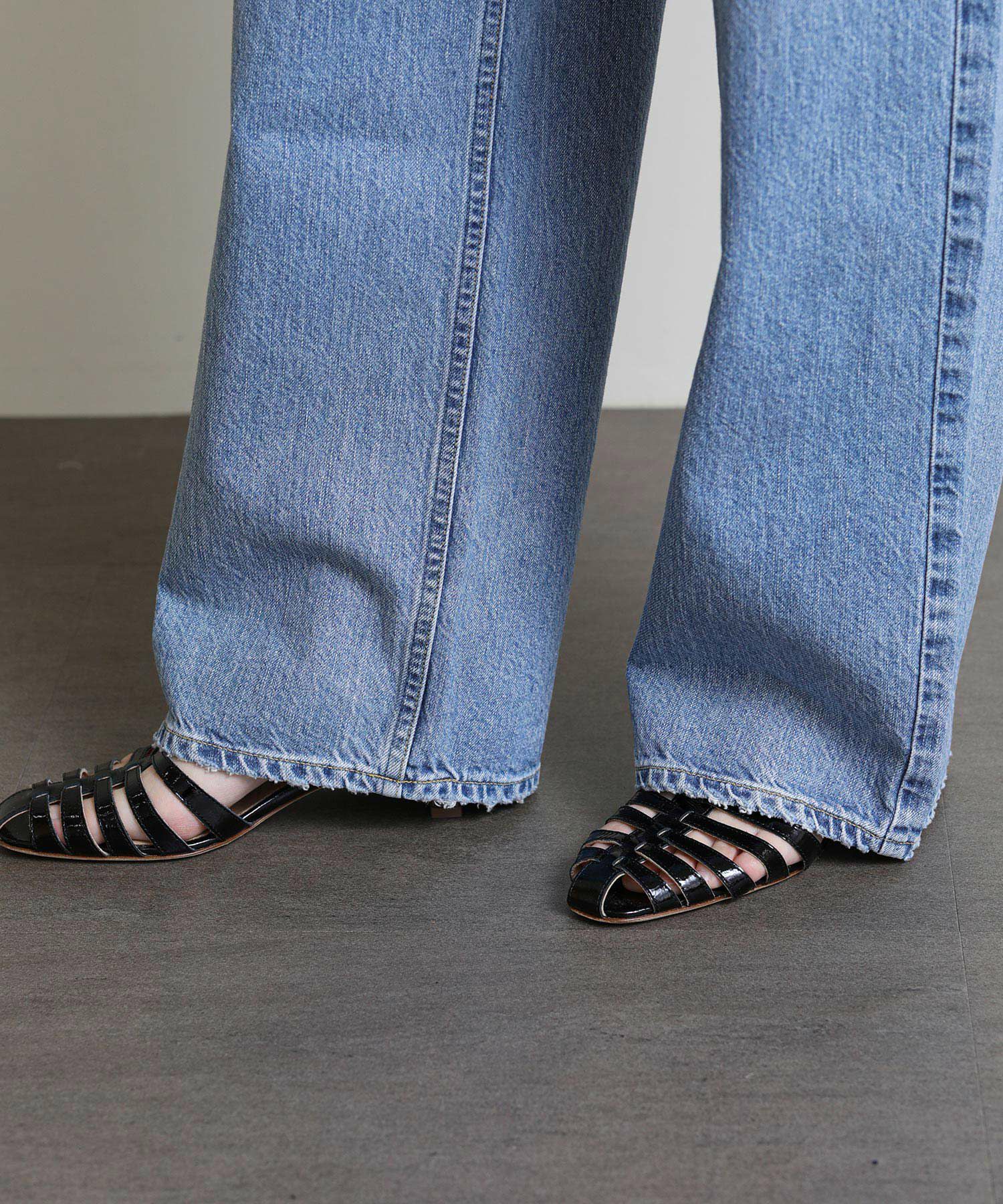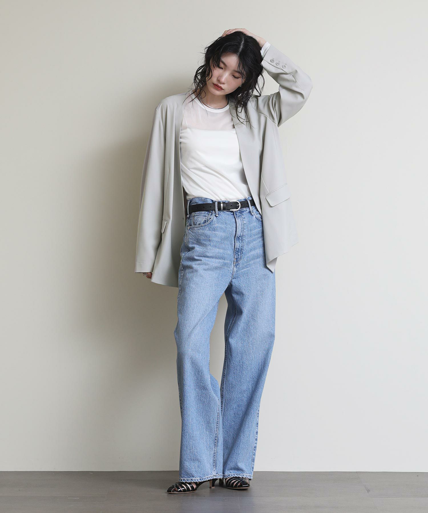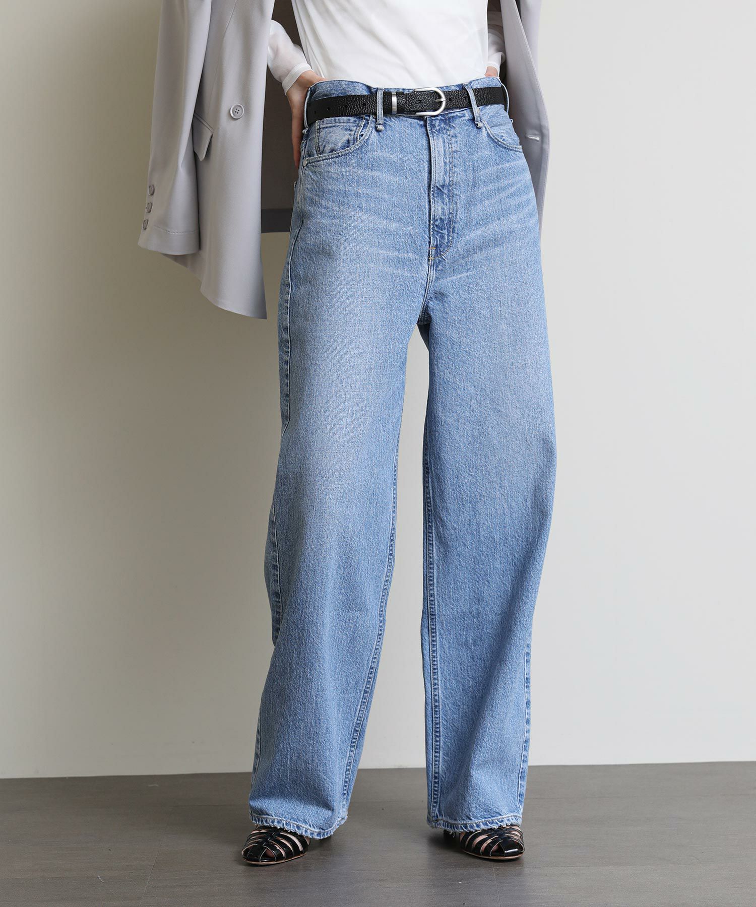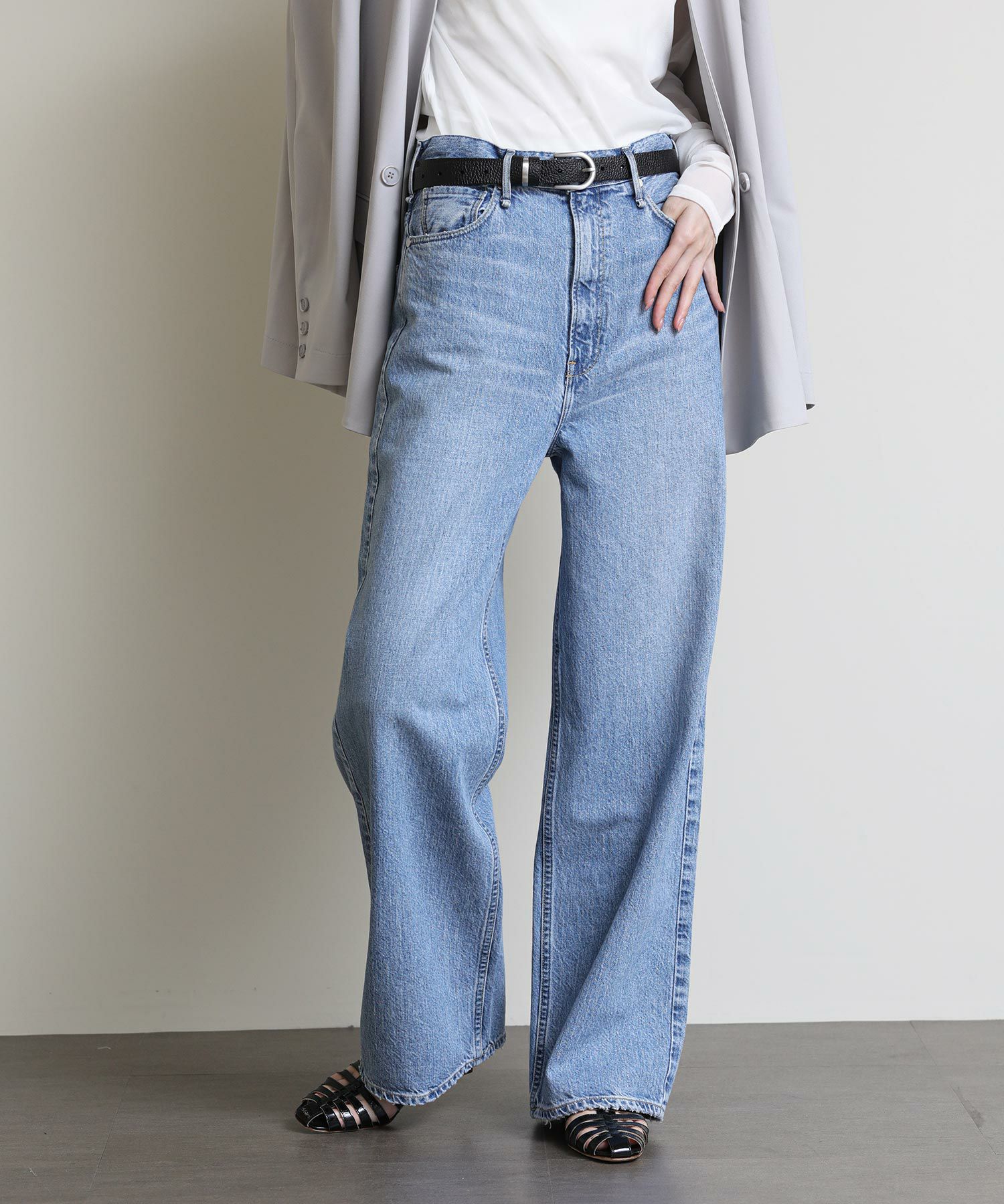 ウエスト周りはすっきりとさせたハイライズ、膝や裾は大きく取ったワイドストレートデニム。腰位置が高く見え、脚長効果抜群の1本。あえて腰履きをし、裾にクッションを持たせルーズに履く履き方もお勧めです。