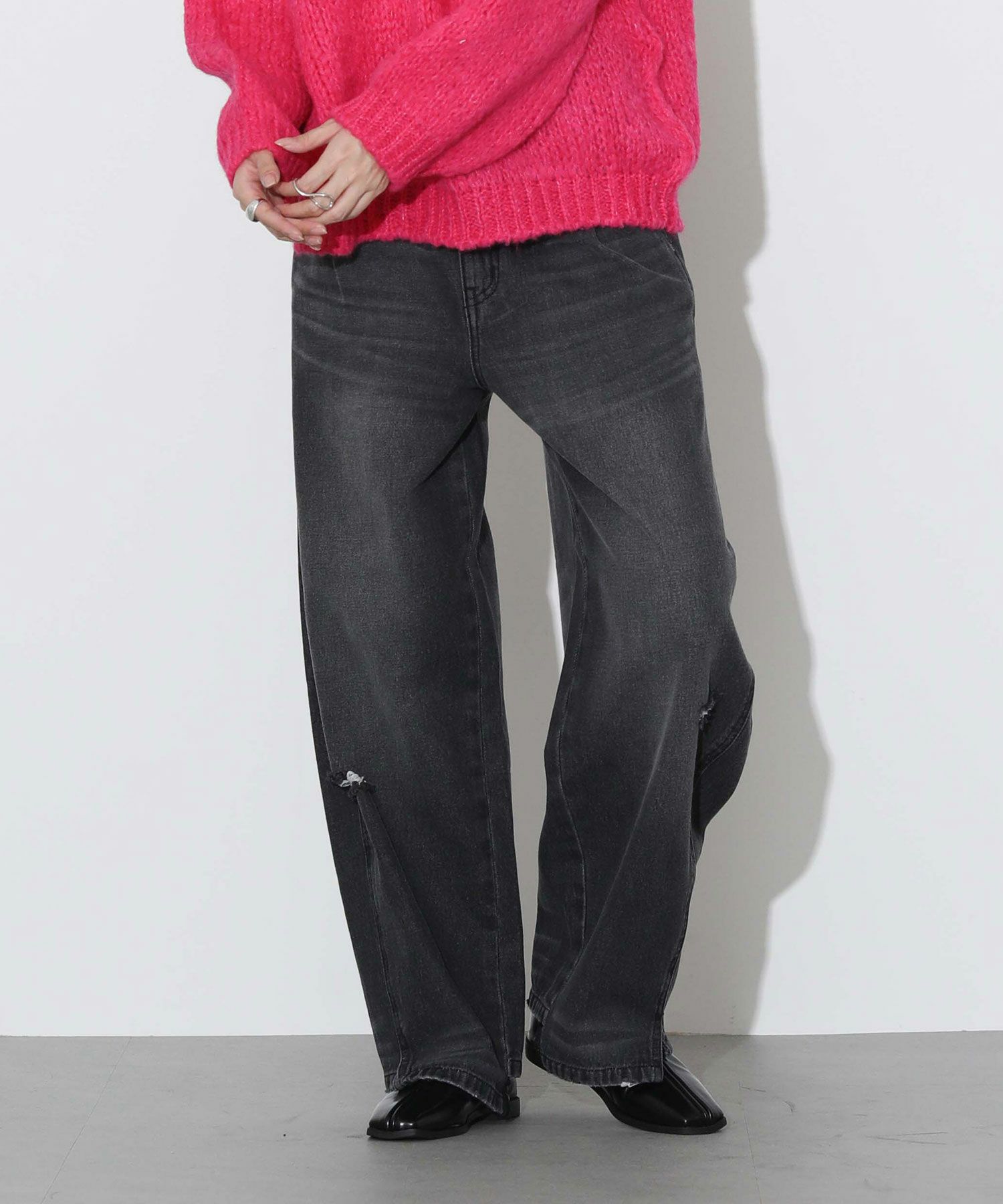 正面に向かってカーブを描くことで、膝辺りで膨らむ自然なコクーンシルエットになるように設計されたユニークなデニム