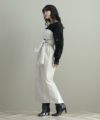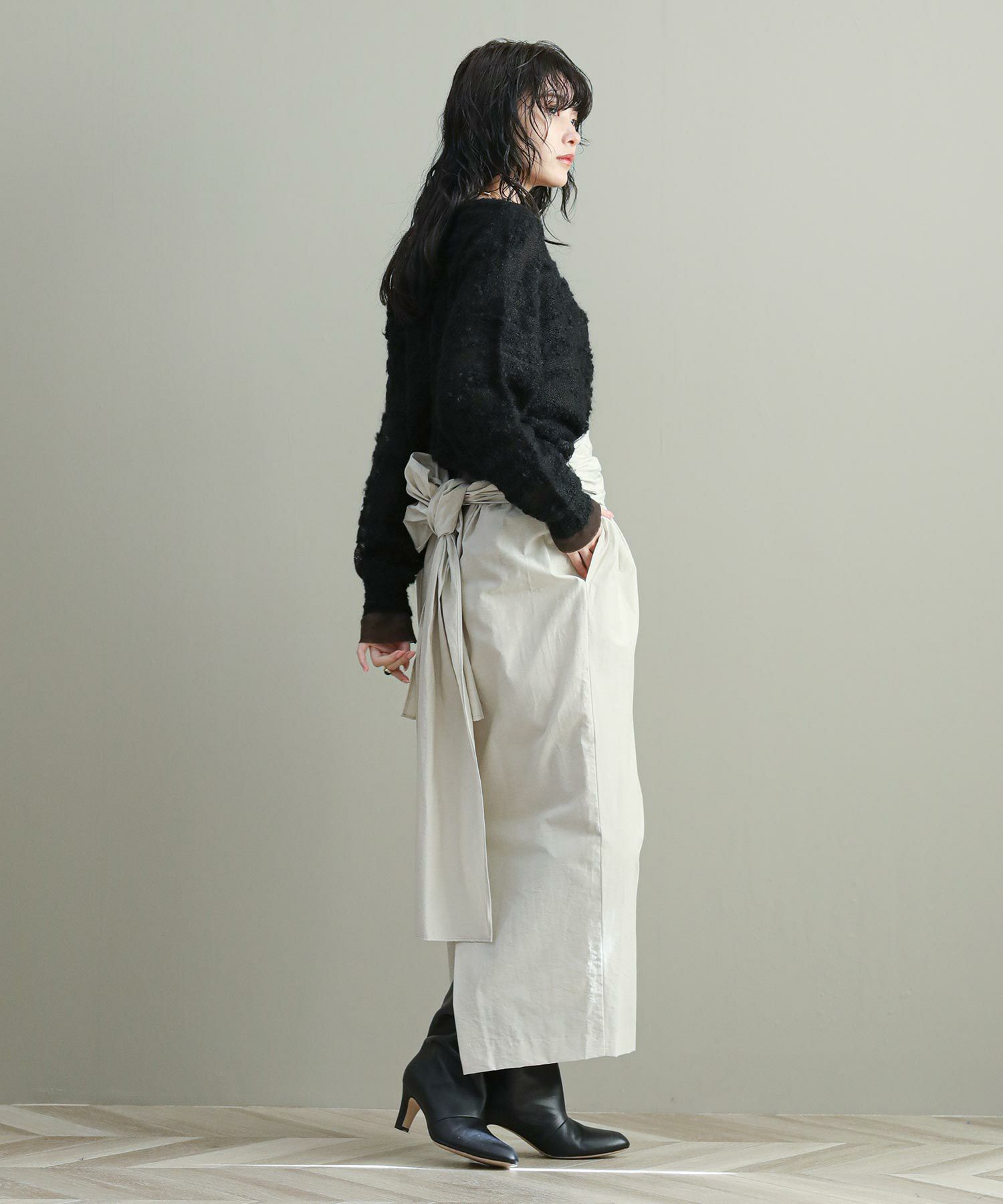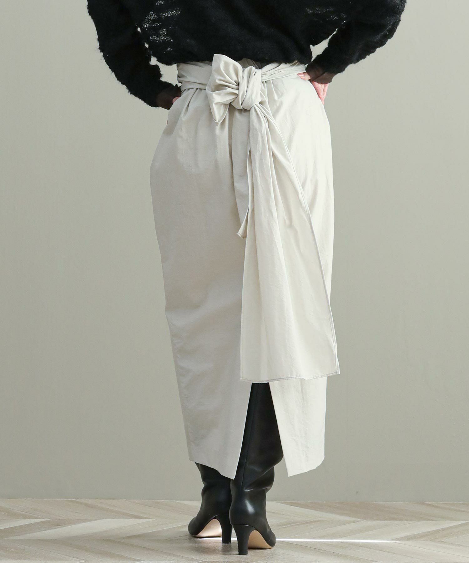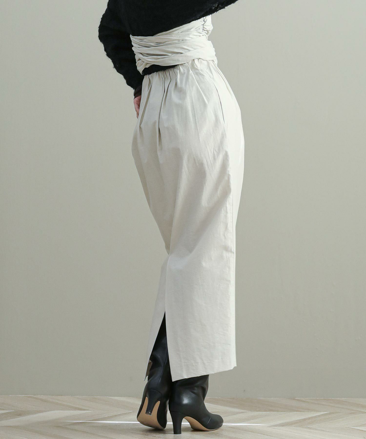 ナローシルエットのスカートは、ウエスト部分のタックが立体感をプラス。ウエストまわりもカバーしつつゴム仕様なので履き心地もストレスフリー。