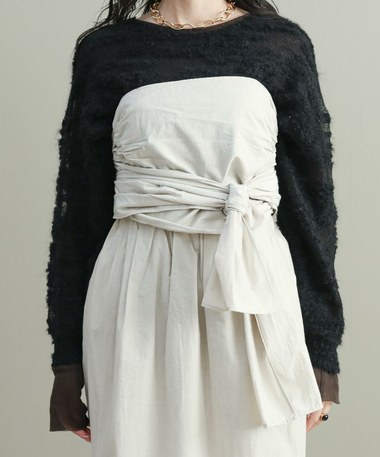 ビスチェは、ウエストに巻きつけてもスタイリング可能。スカートのウエスト部分にボタンが付いているのでズレてきてしまうこともなく安心。