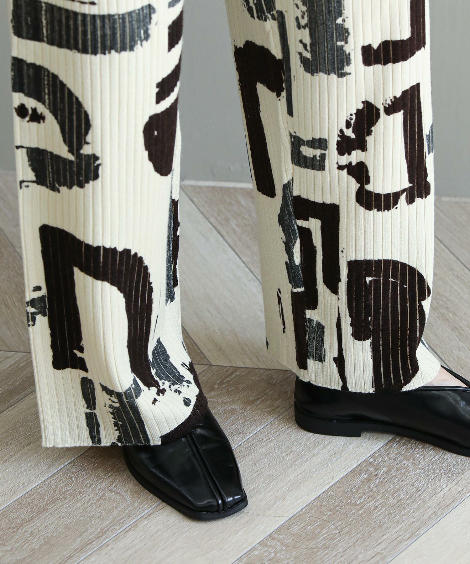 3色の内、1色は箔プリントが施されています。適度な落ち感を重視し、重みのない軽やかな履き心地が特徴です 。ニットパンツでは珍しいサイドポケットが付いており、ウエストはゴム仕様も嬉しい。編地と柄の配色が目を惹くリブニットパンツです。