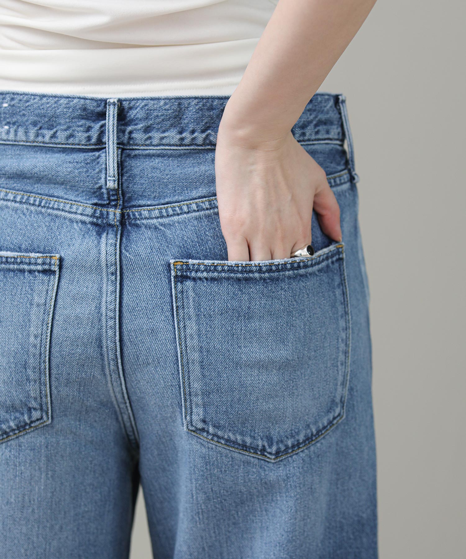 リヨセル混のため、通常のデニムよりも落ち感があり柔らかい「FEATHER JEANS」シリーズです。全体的にゆるっとしたシルエット&ミドルライズで今っぽく穿ける1枚。素材は重厚感のあるシボ顔と相反して軽やかで柔らかいupper hightsオリジナル素材を採用。緯糸にオープンエンド糸を使用することで、肌に当たる面は清涼感のあるドライタッチに。盛夏でも快適に着られるデニムです。