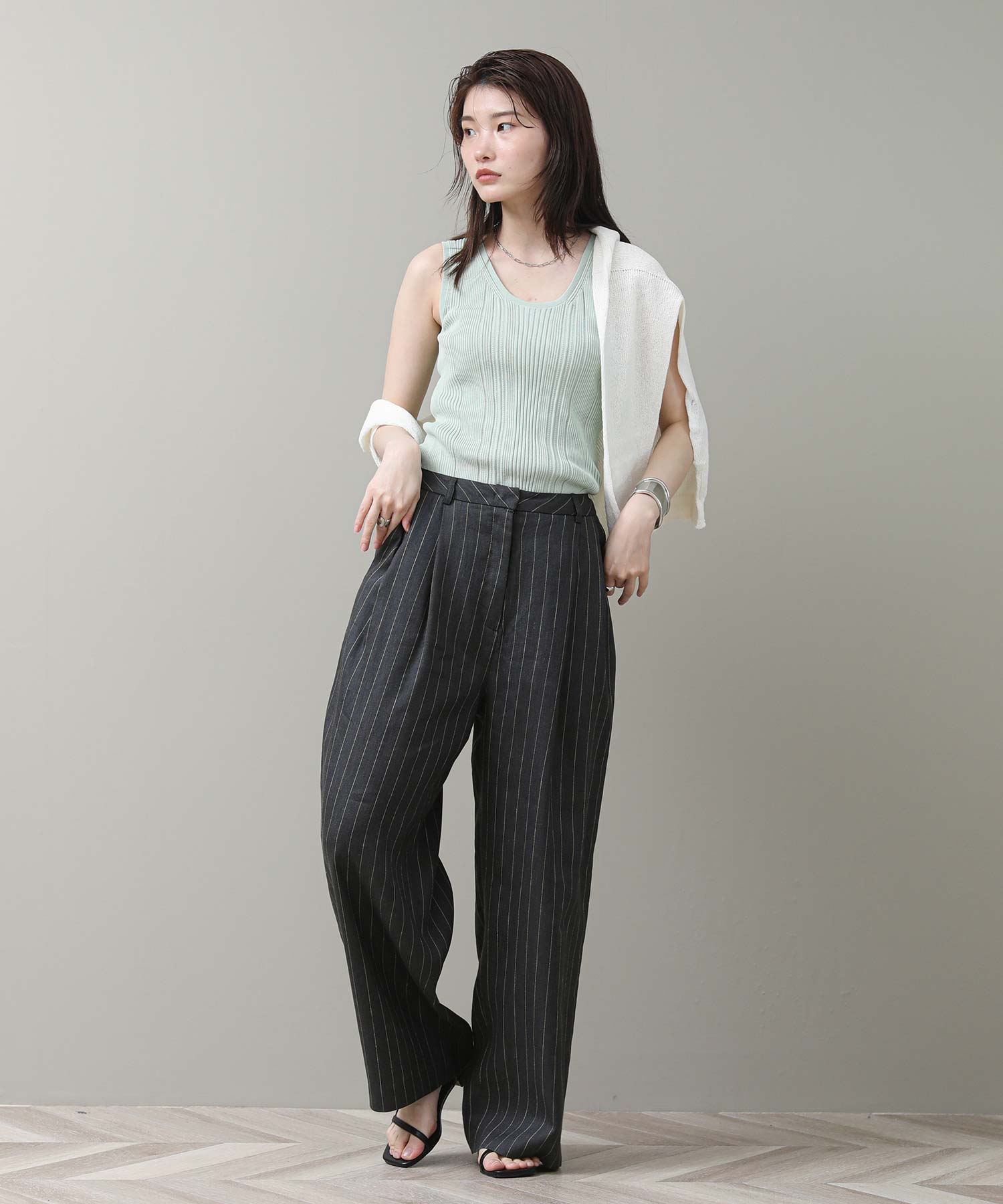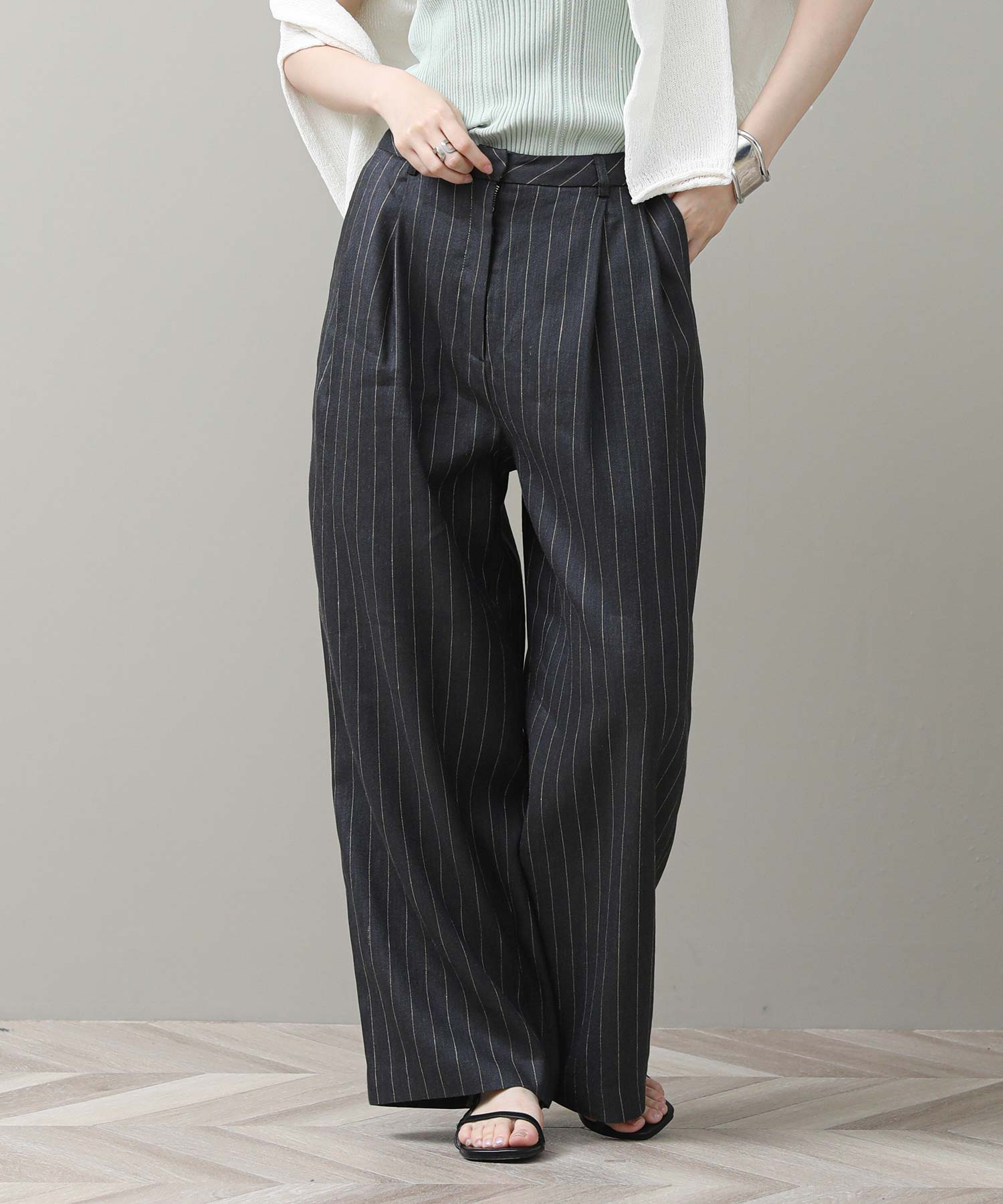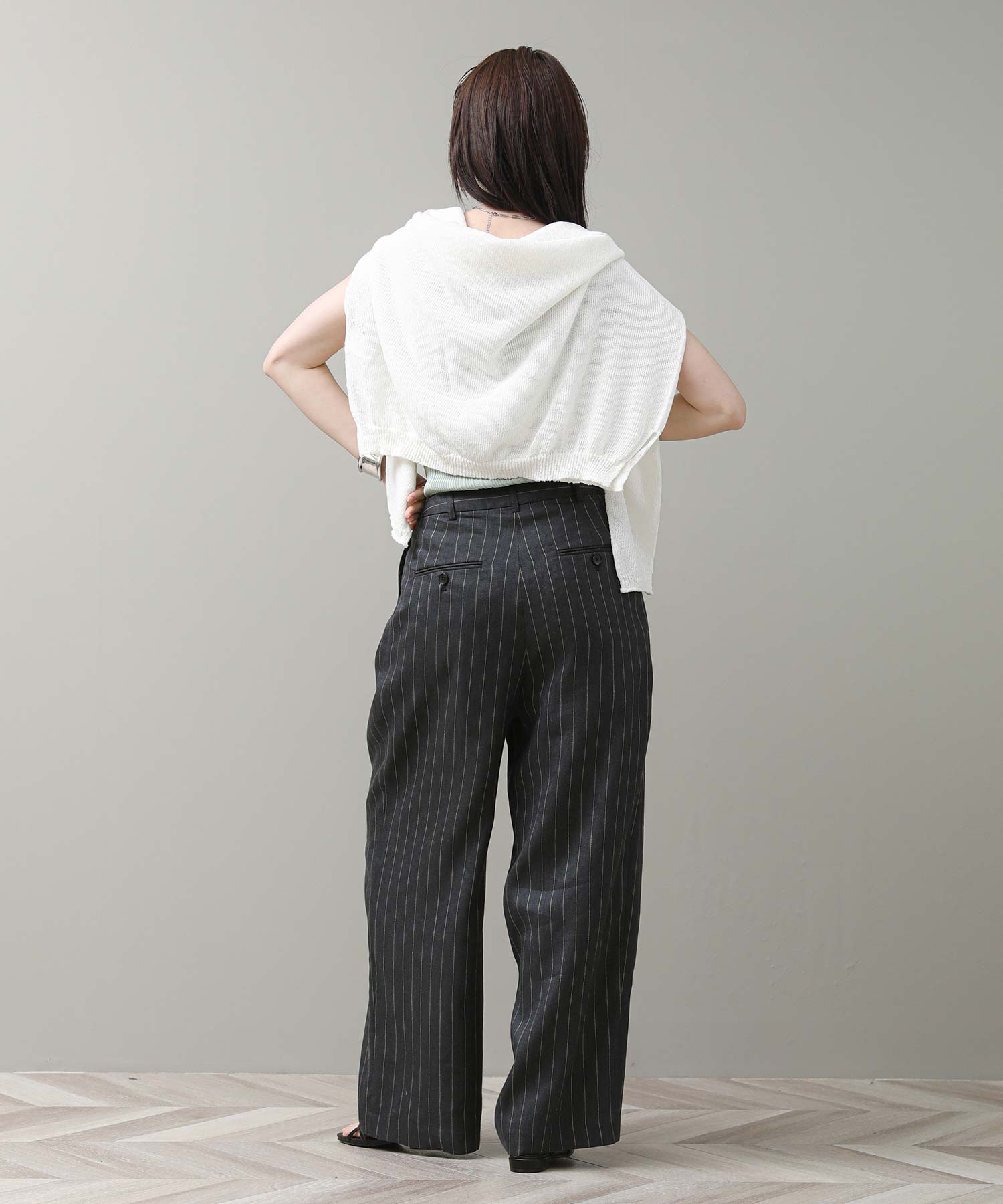 オリジナルで織り上げた薄手の軽やかなリネン素材。タックを2本入れ、ルーズに仕上げたシルエットは、履くだけでこなれ感の出る1本。合わせやすいカラーリングながら、シンプルなトップスに合わせるだけで、シャレ感が出るのも魅力。同素材のジャケットとセットアップで合わせた、マニッシュな着こなしもおすすめです。