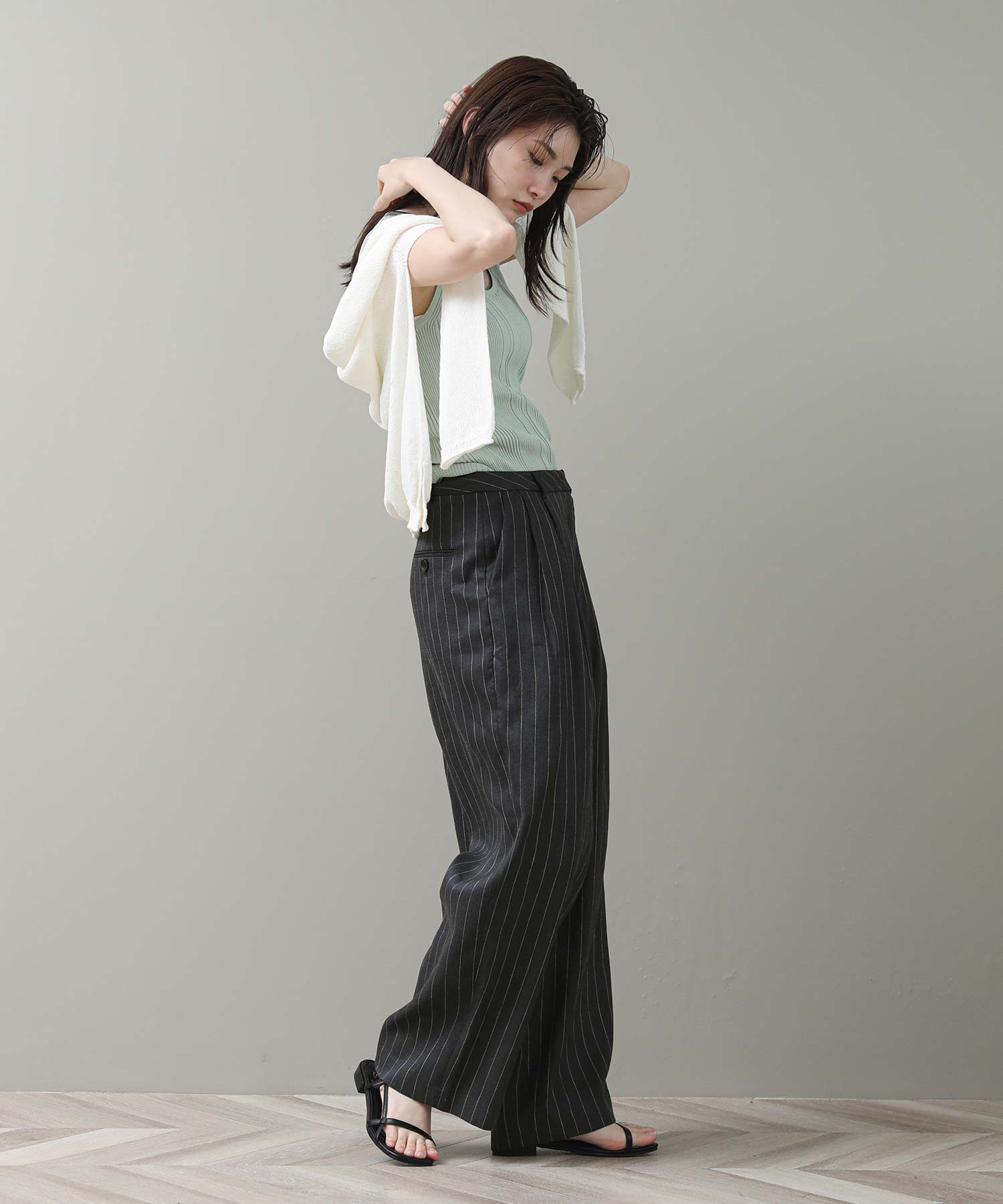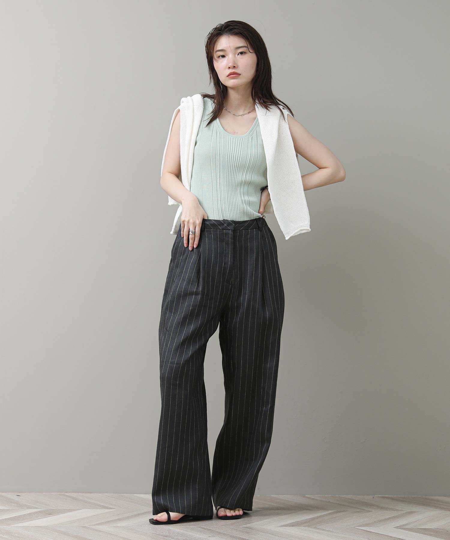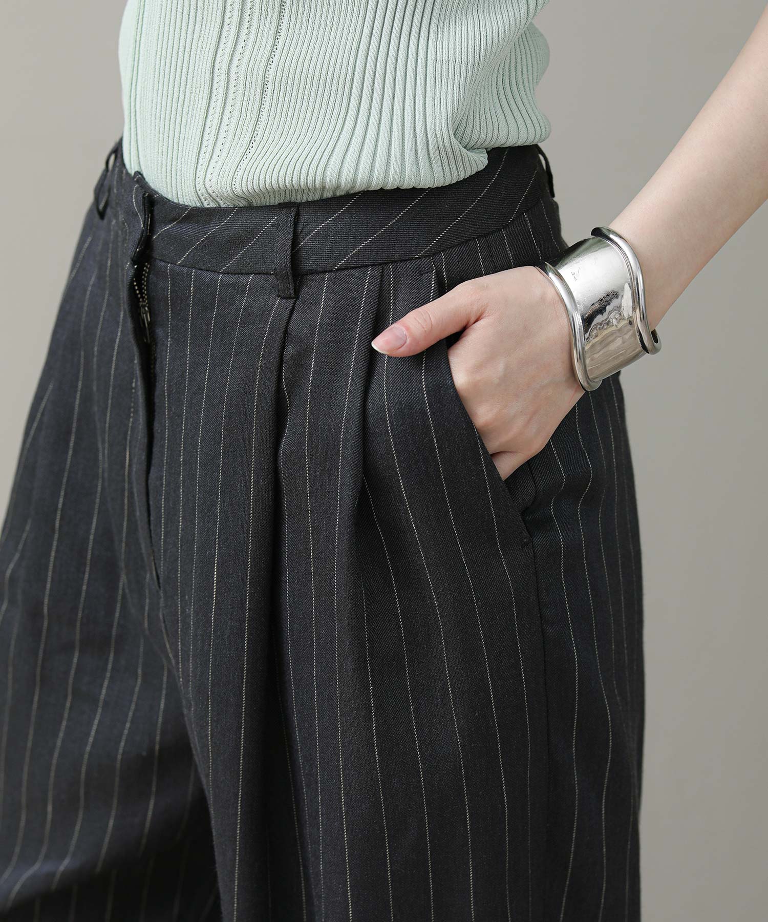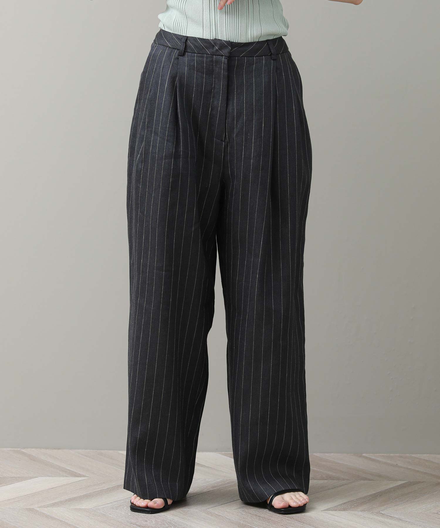 オリジナルで織り上げた薄手の軽やかなリネン素材。タックを2本入れ、ルーズに仕上げたシルエットは、履くだけでこなれ感の出る1本。合わせやすいカラーリングながら、シンプルなトップスに合わせるだけで、シャレ感が出るのも魅力。同素材のジャケットとセットアップで合わせた、マニッシュな着こなしもおすすめです。