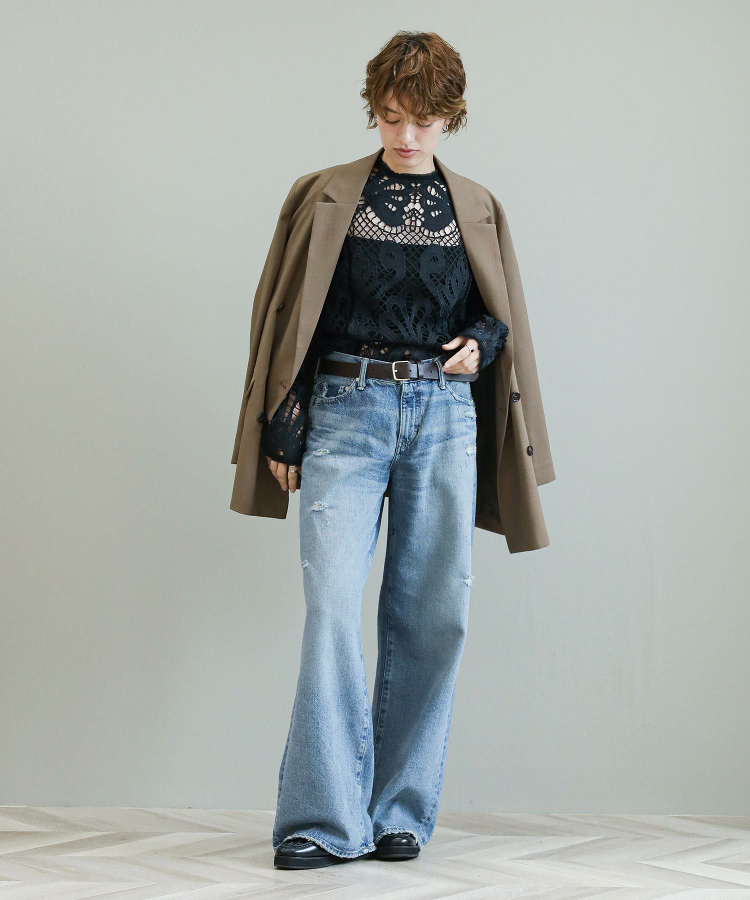 The rejoiceの別注デザインです。ヴィンテージライクな風合いやダメージのバランスに拘っています。ヒップにかけてコンパクトな設計になっている為、ワイドながらルーズさはなく上品なシルエットが特徴。さりげないダメージ感がどんなアイテムにもマッチし飽きないデザイン。今のムードにぴったりのローライズもポイントです。