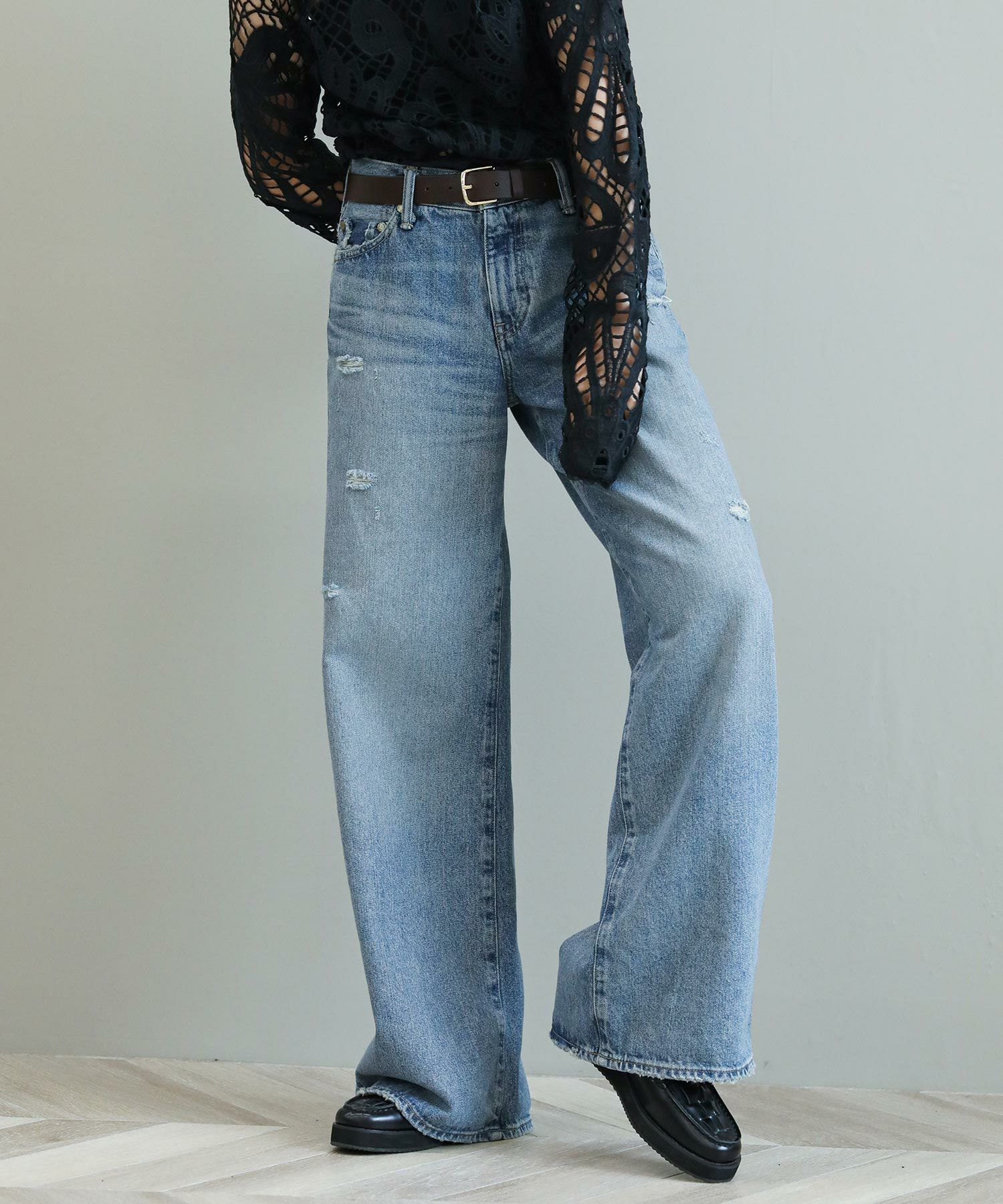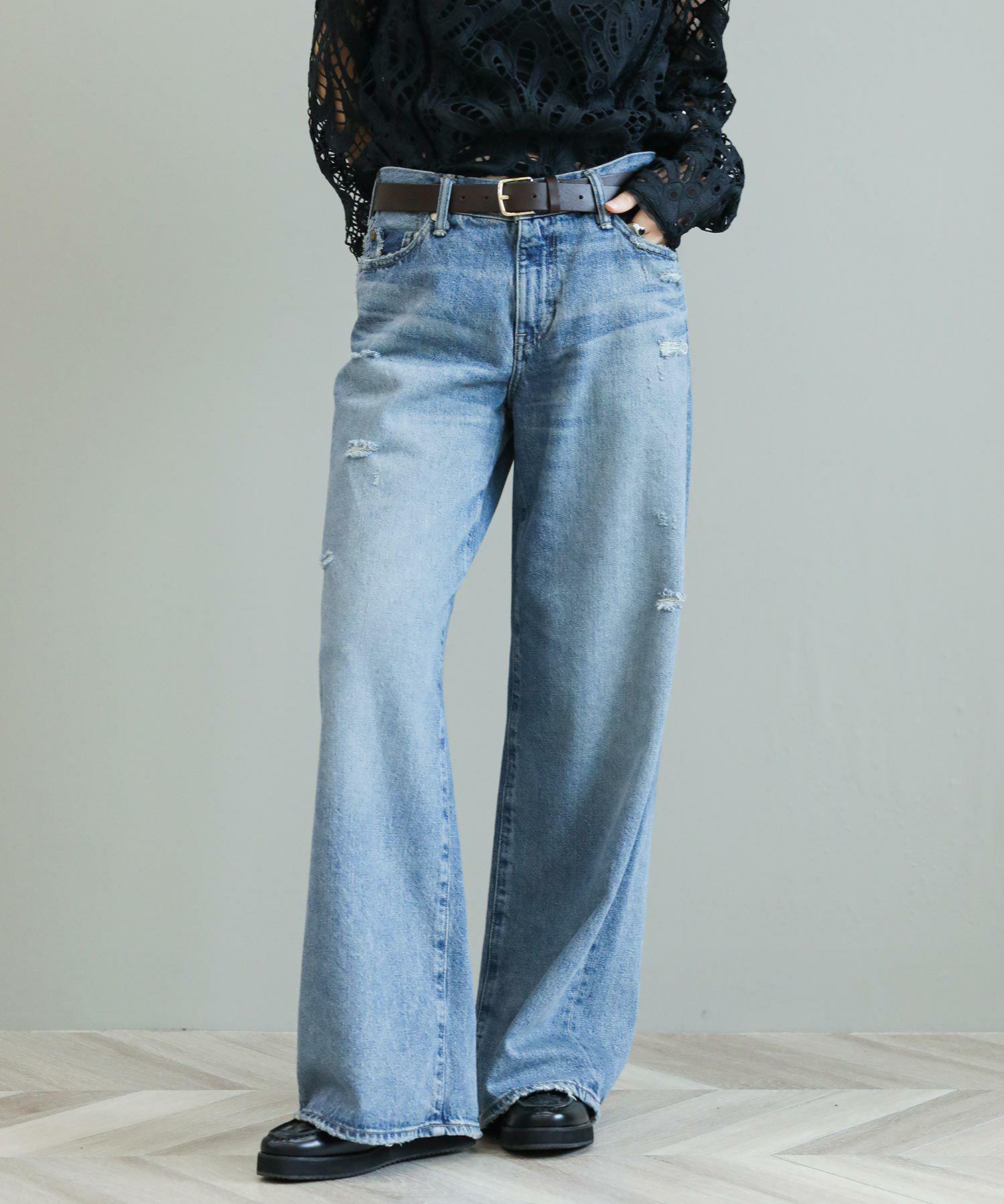 The rejoiceの別注デザインです。ヴィンテージライクな風合いやダメージのバランスに拘っています。ヒップにかけてコンパクトな設計になっている為、ワイドながらルーズさはなく上品なシルエットが特徴。さりげないダメージ感がどんなアイテムにもマッチし飽きないデザイン。今のムードにぴったりのローライズもポイントです。