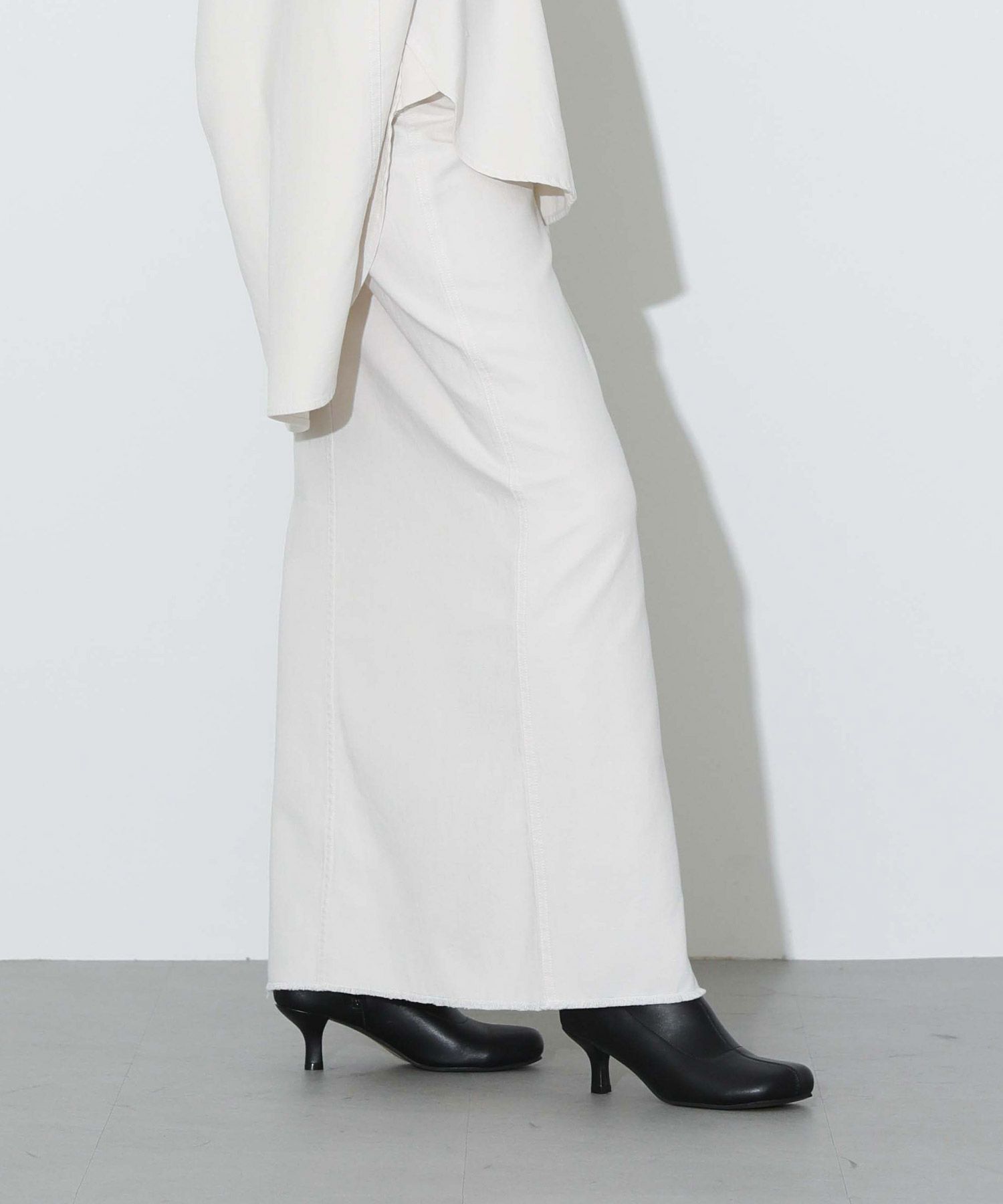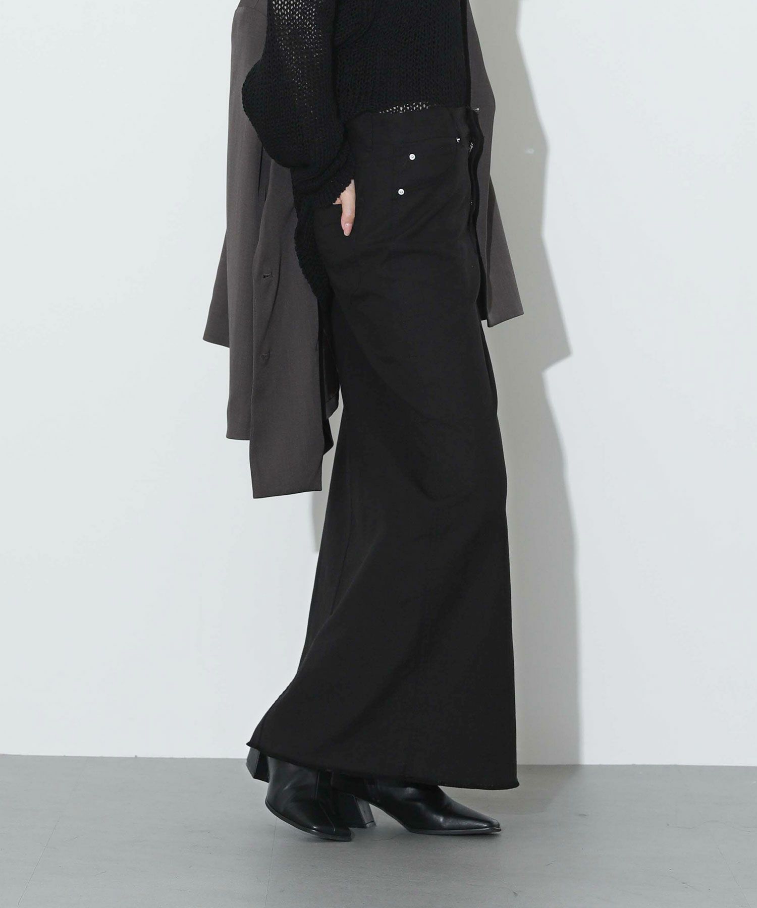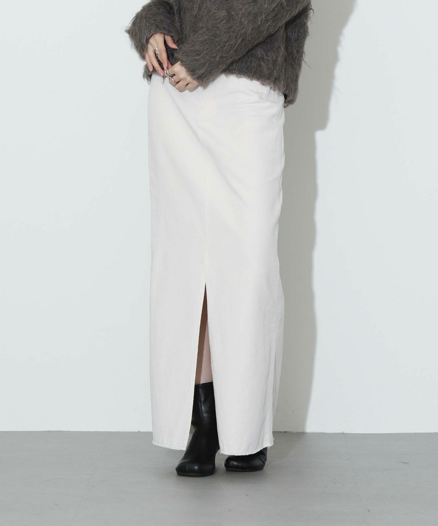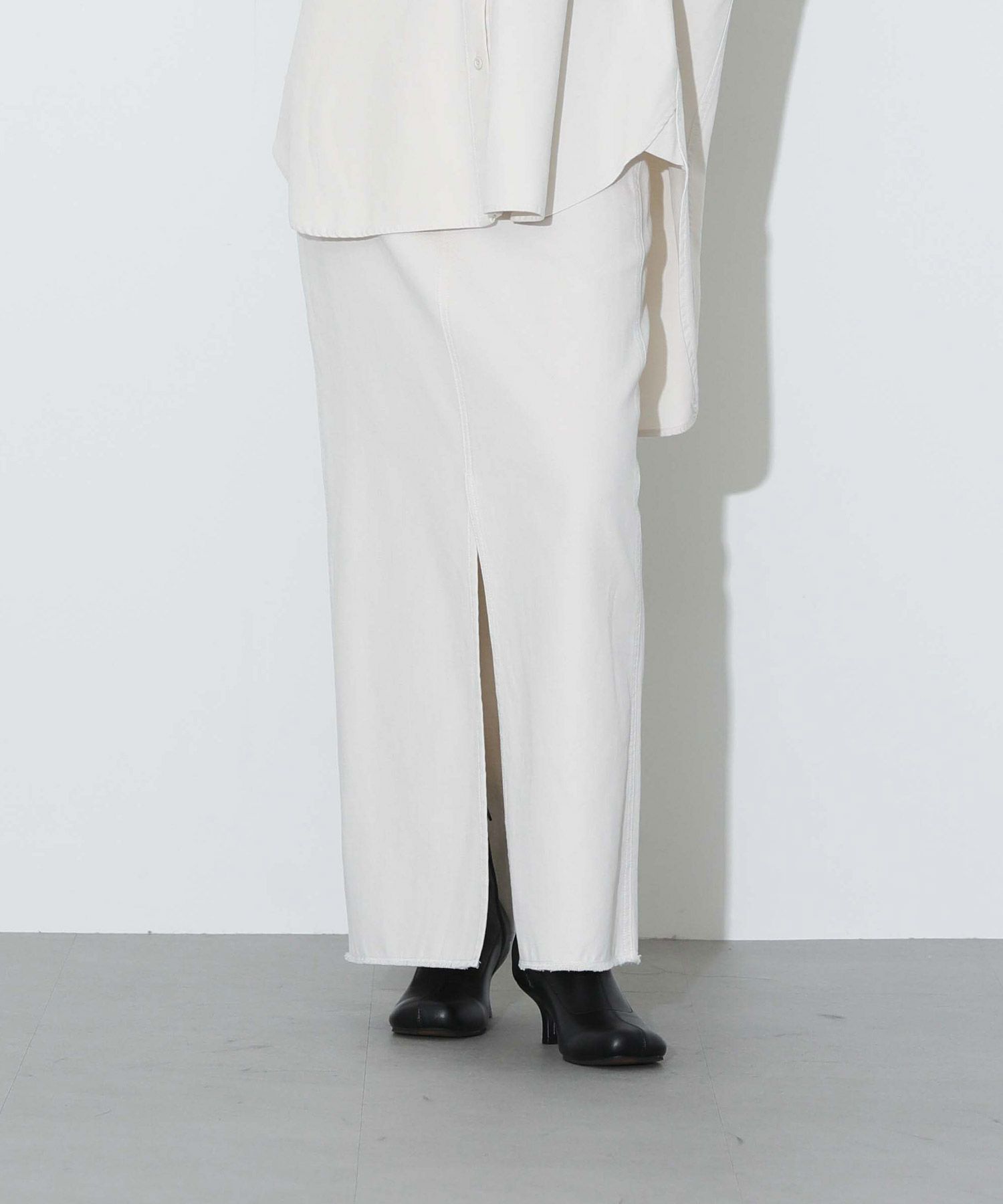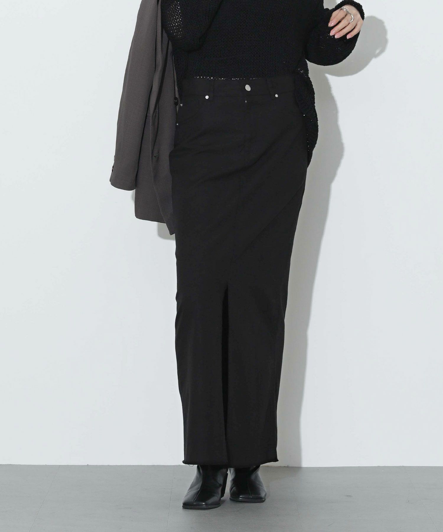 デニムのように経年変化を楽しめる加工感のある生地を使用。ハイウエストはスタイルアップを叶え、ラインを拾わないタイトなシルエットが女性らしい◎前のスリットで足捌きもよく、脚が綺麗に見えるスリットの深さで設定しています。これからのシーズンはブーツと合わせて着用するとバランスが◎