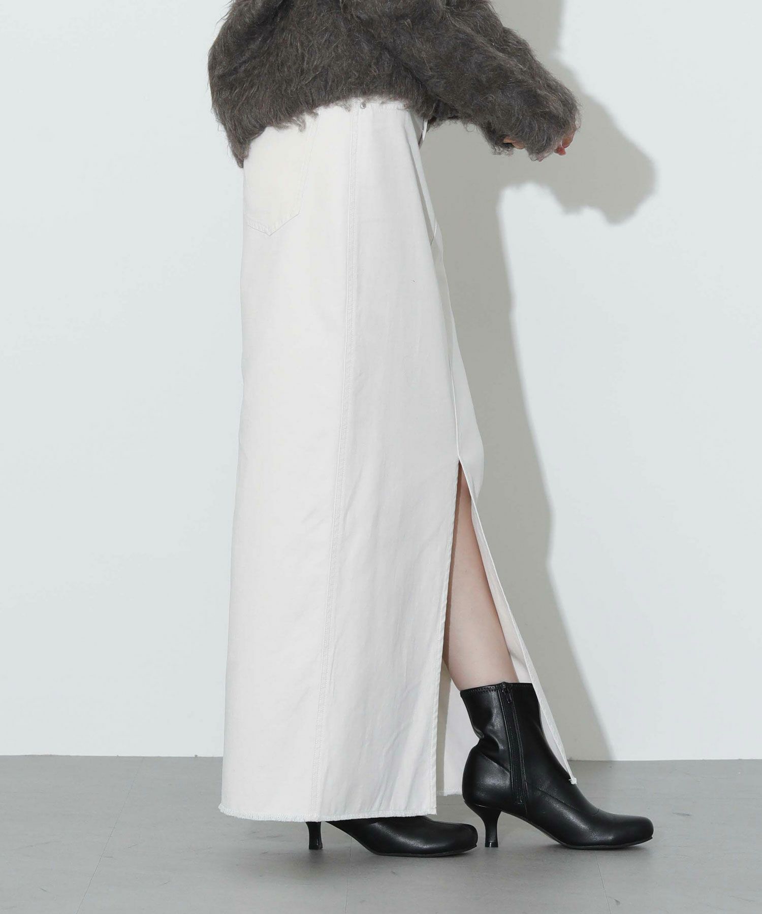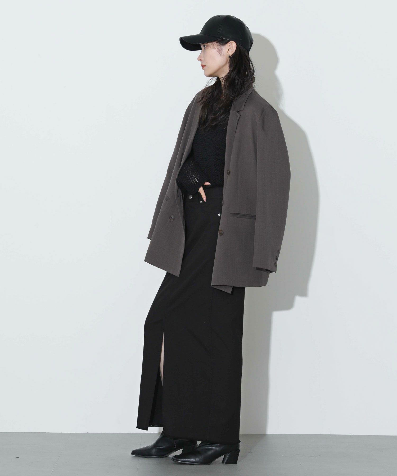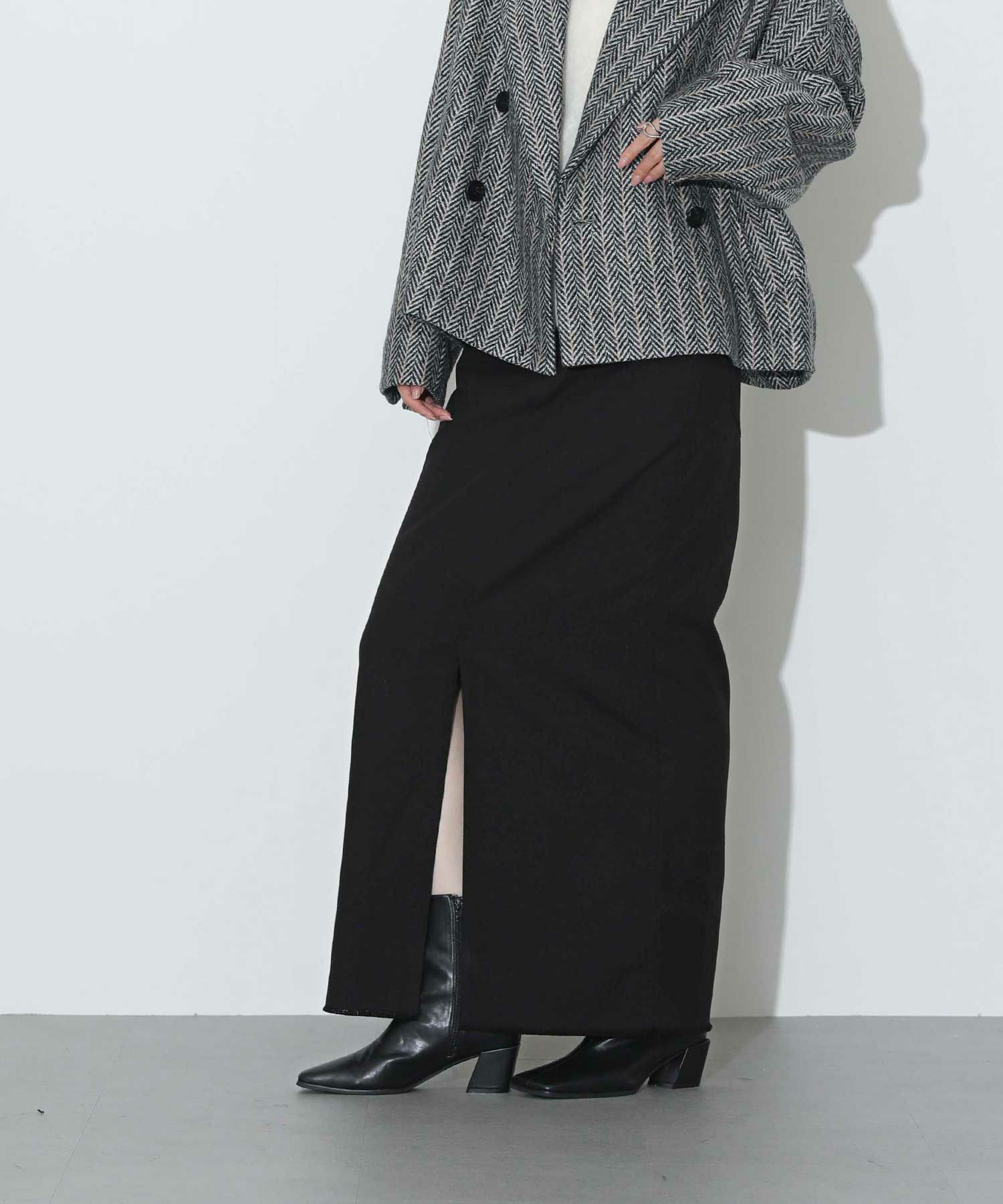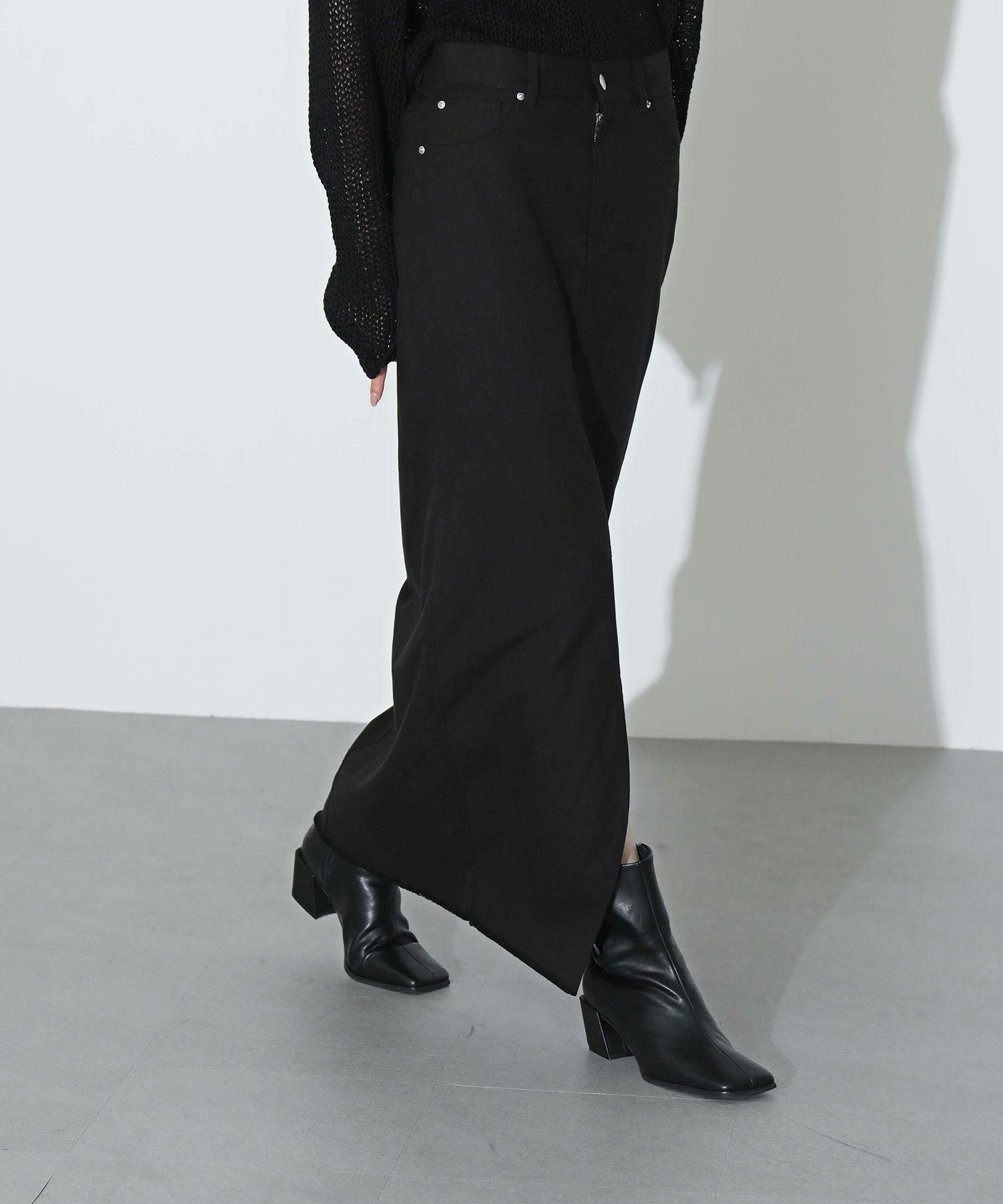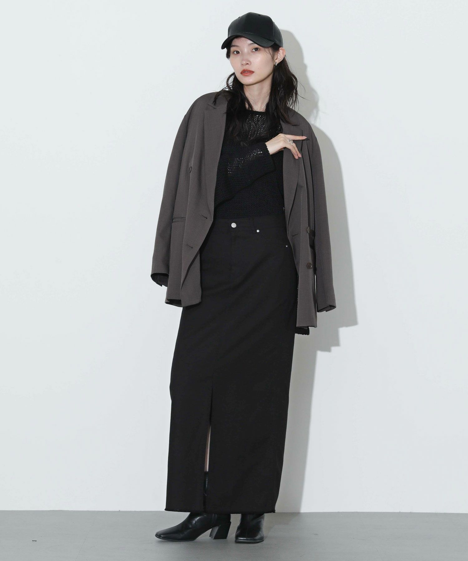デニムのように経年変化を楽しめる加工感のある生地を使用。ハイウエストはスタイルアップを叶え、ラインを拾わないタイトなシルエットが女性らしい◎前のスリットで足捌きもよく、脚が綺麗に見えるスリットの深さで設定しています。これからのシーズンはブーツと合わせて着用するとバランスが◎
