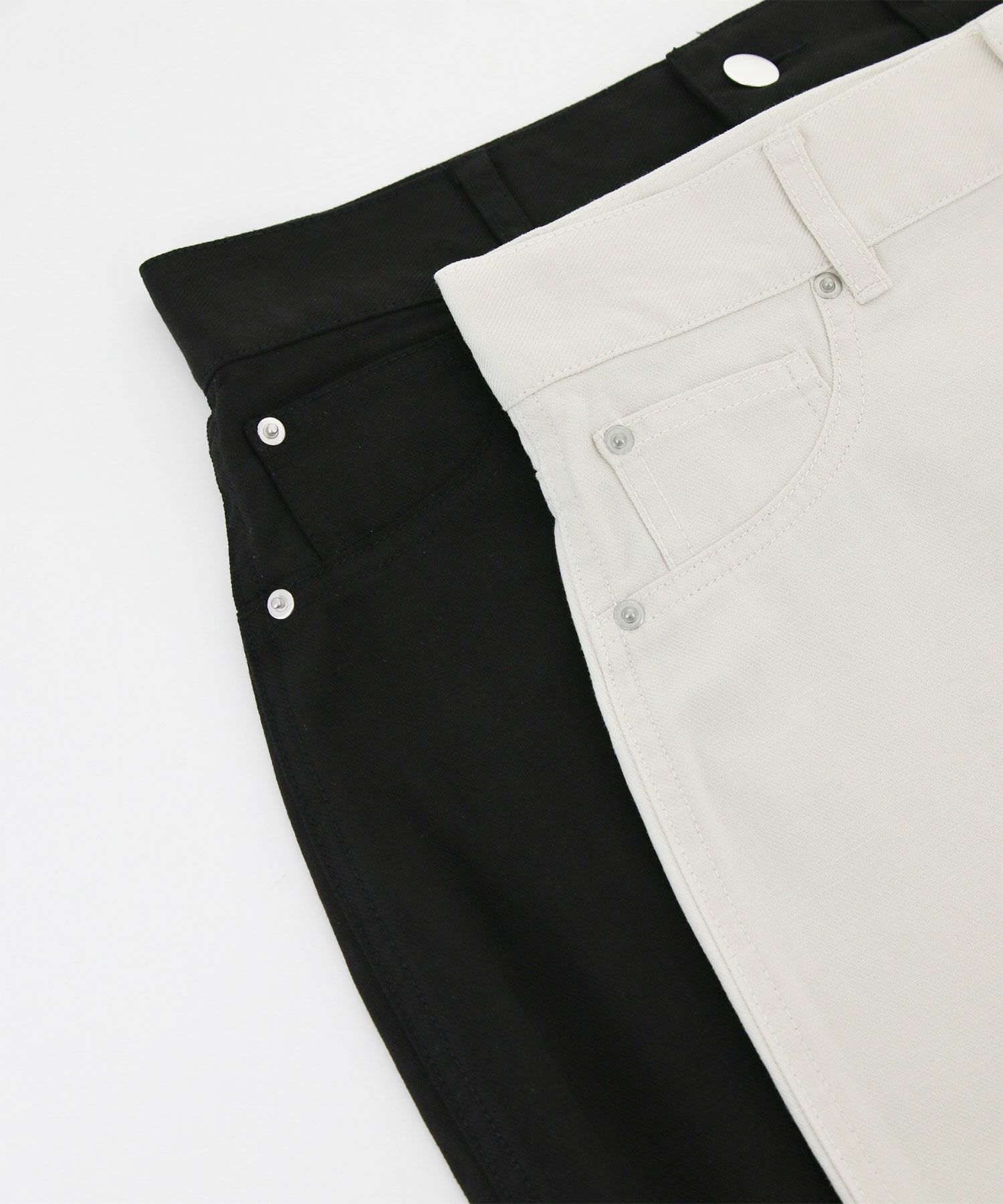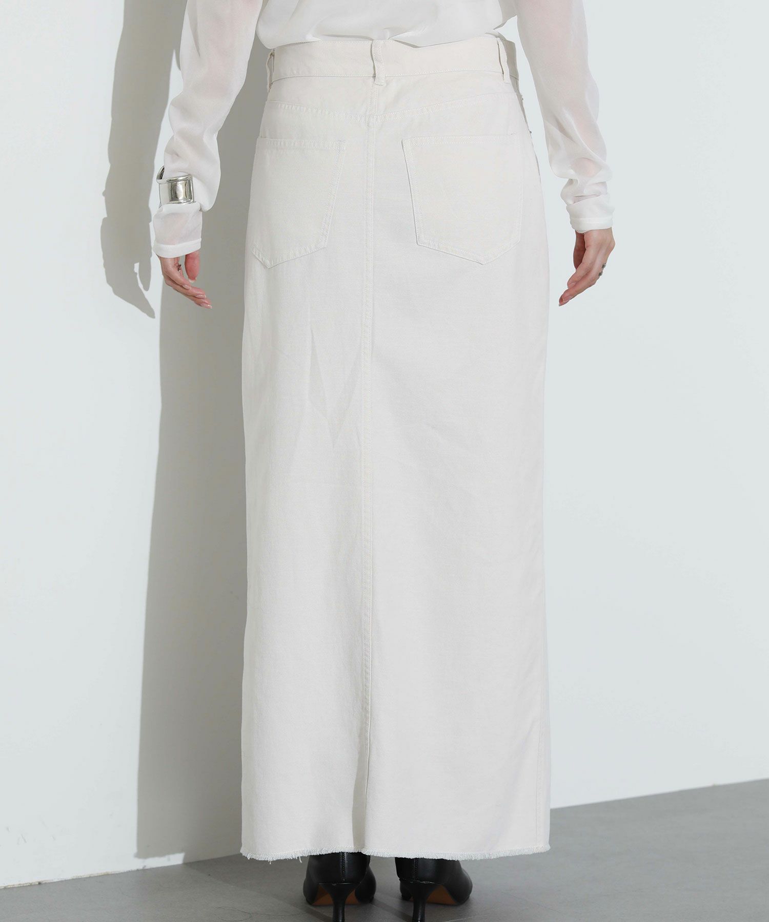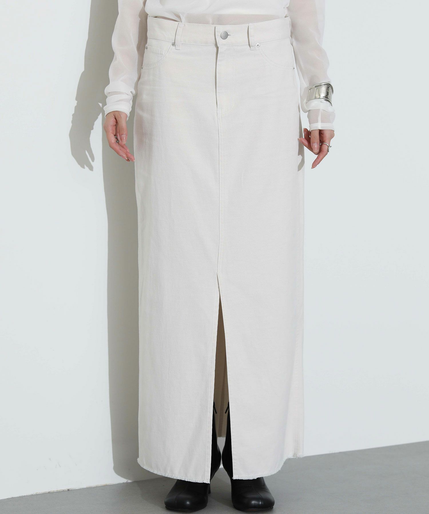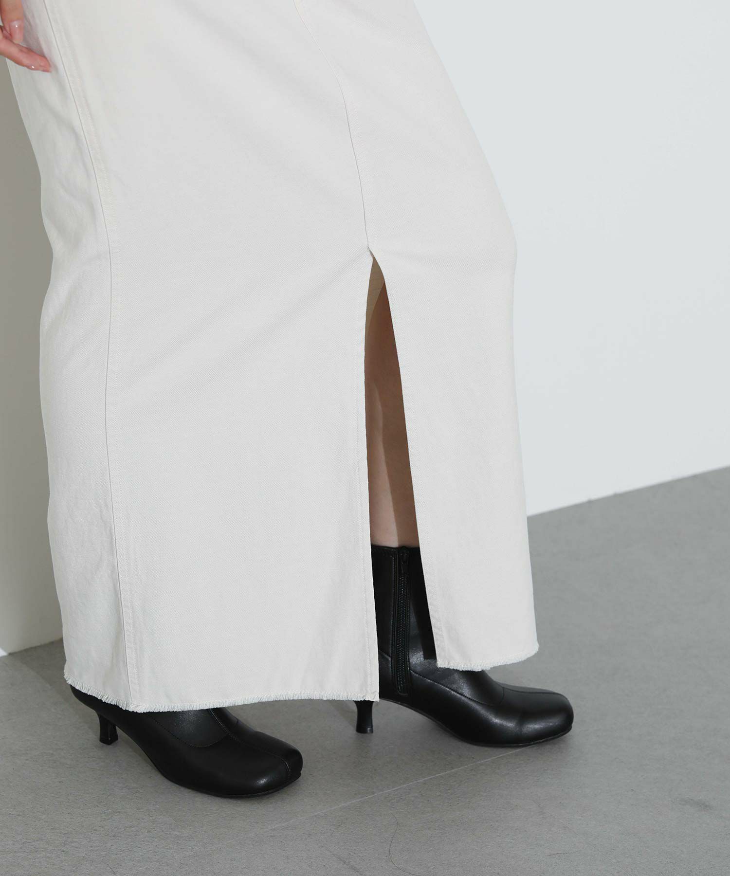 デニムのように経年変化を楽しめる加工感のある生地を使用。ハイウエストはスタイルアップを叶え、ラインを拾わないタイトなシルエットが女性らしい◎前のスリットで足捌きもよく、脚が綺麗に見えるスリットの深さで設定しています。これからのシーズンはブーツと合わせて着用するとバランスが◎