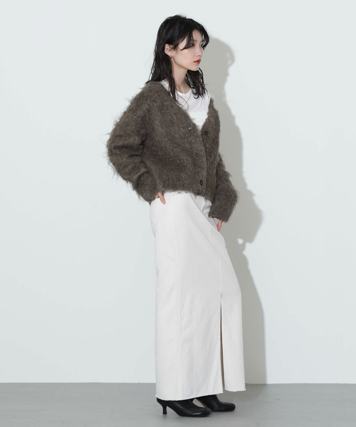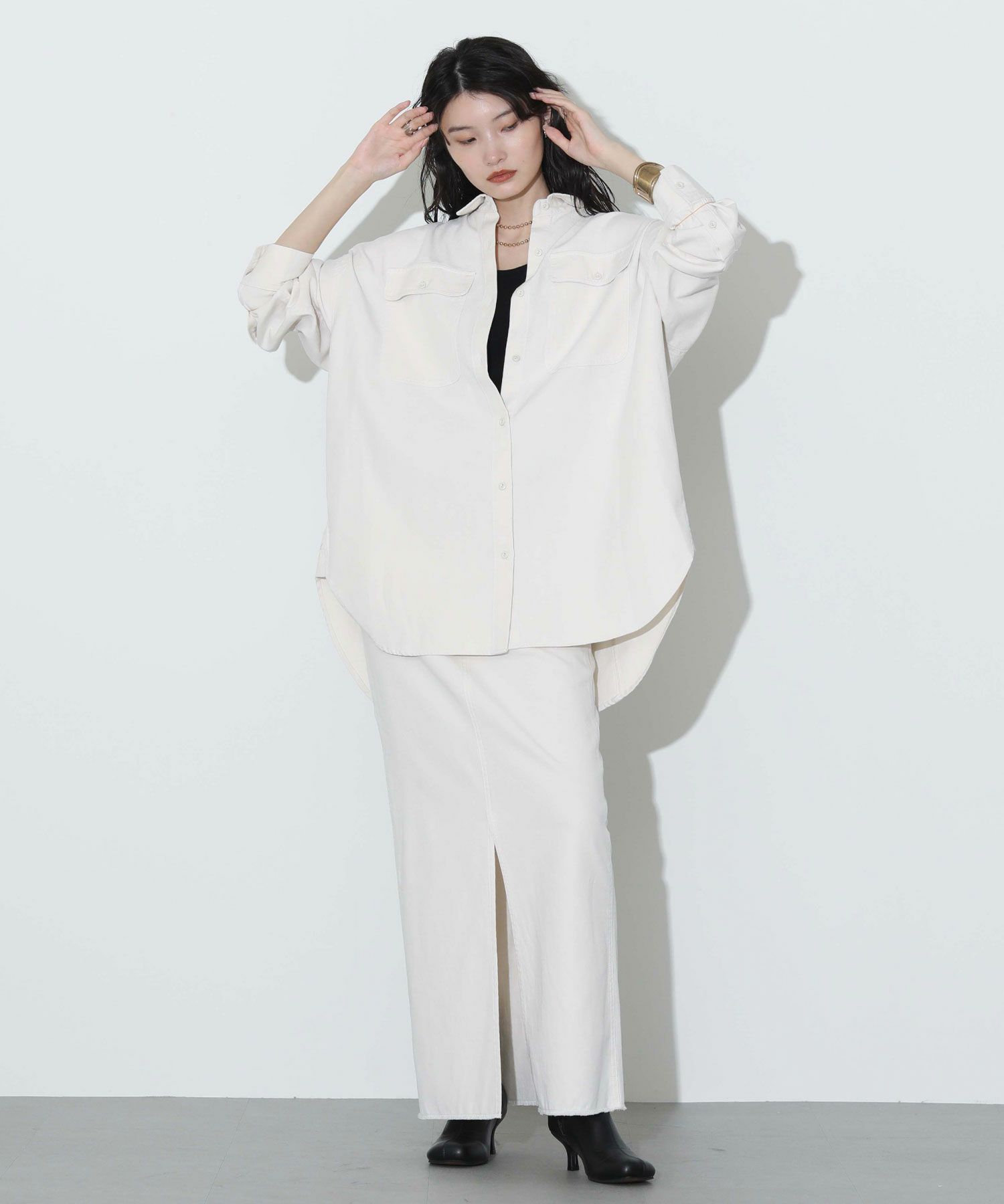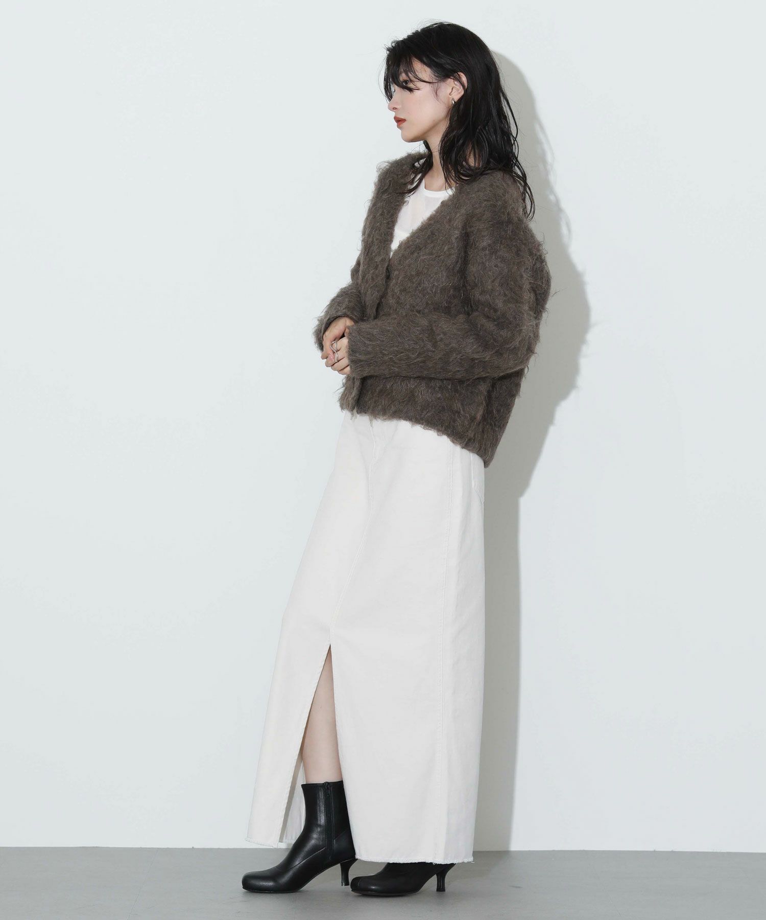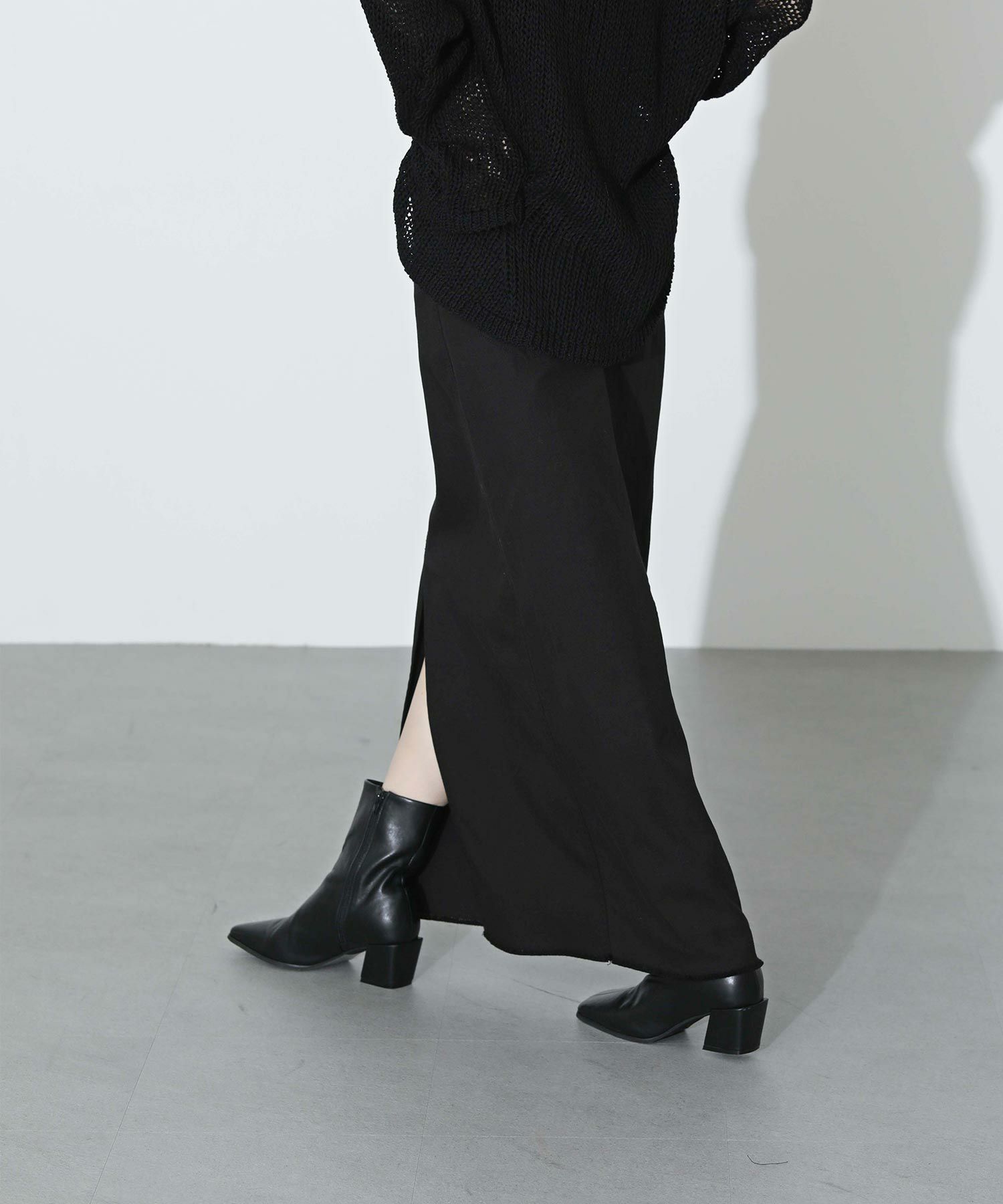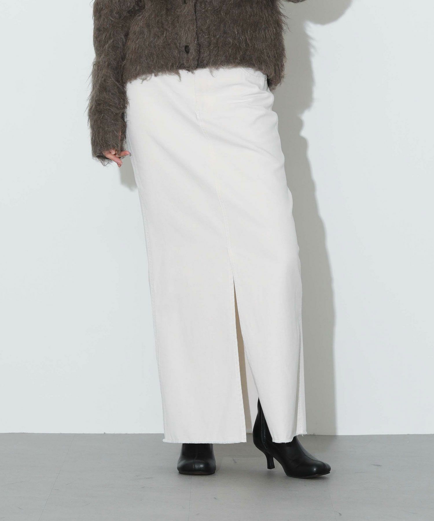 デニムのように経年変化を楽しめる加工感のある生地を使用。ハイウエストはスタイルアップを叶え、ラインを拾わないタイトなシルエットが女性らしい◎前のスリットで足捌きもよく、脚が綺麗に見えるスリットの深さで設定しています。これからのシーズンはブーツと合わせて着用するとバランスが◎