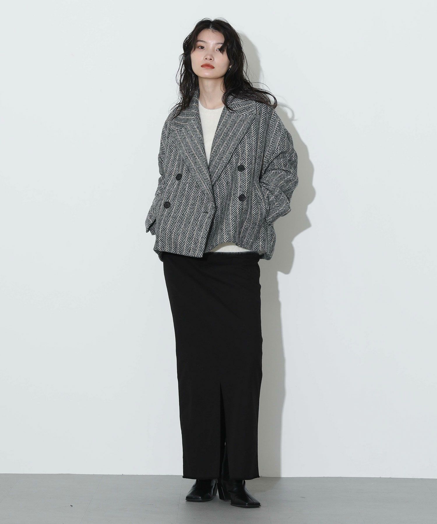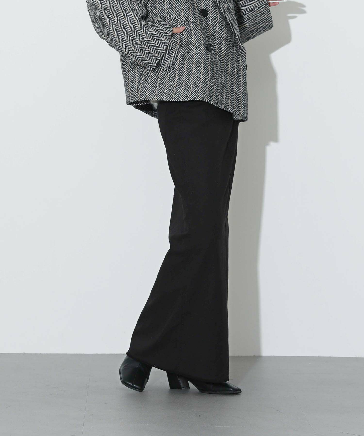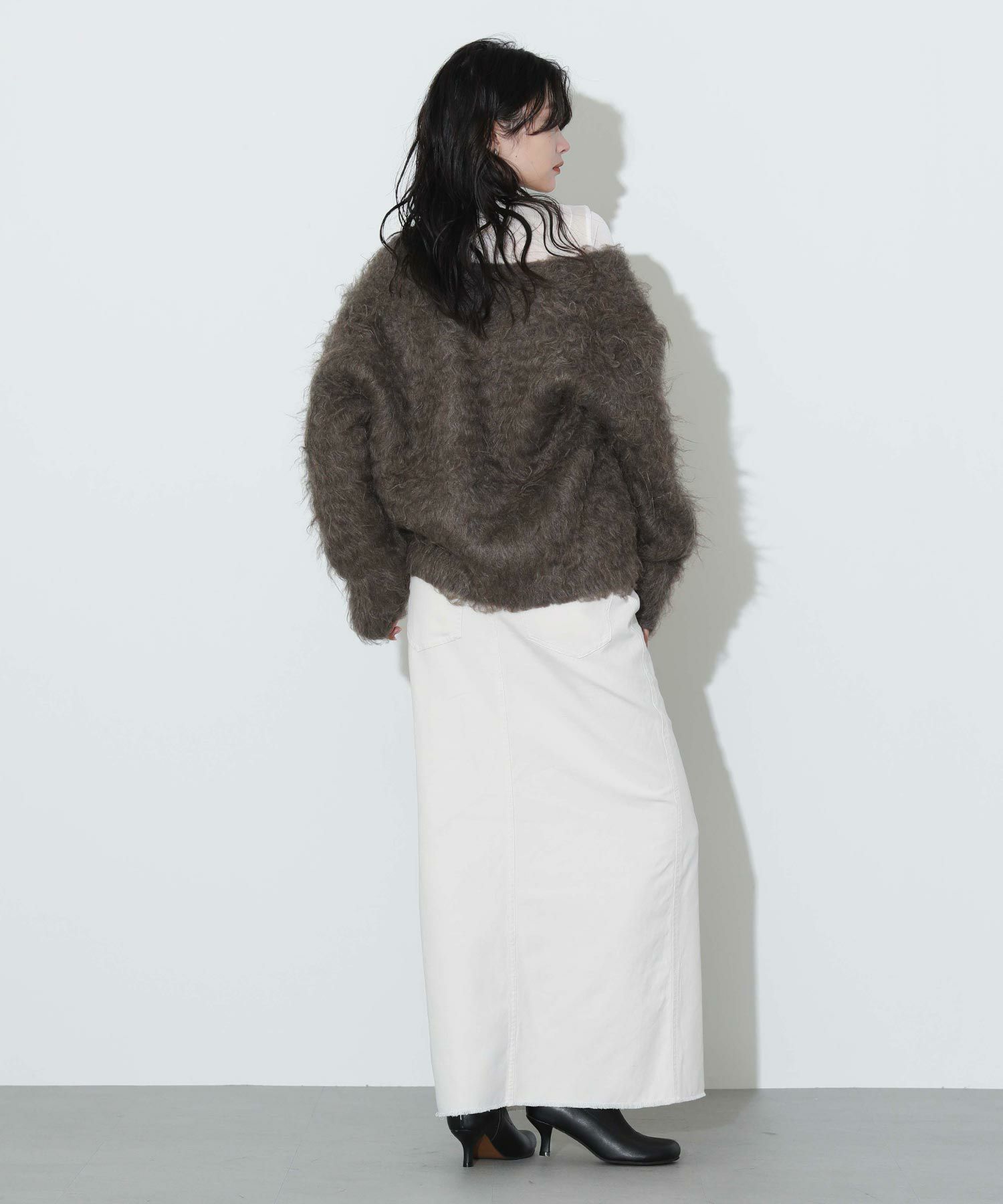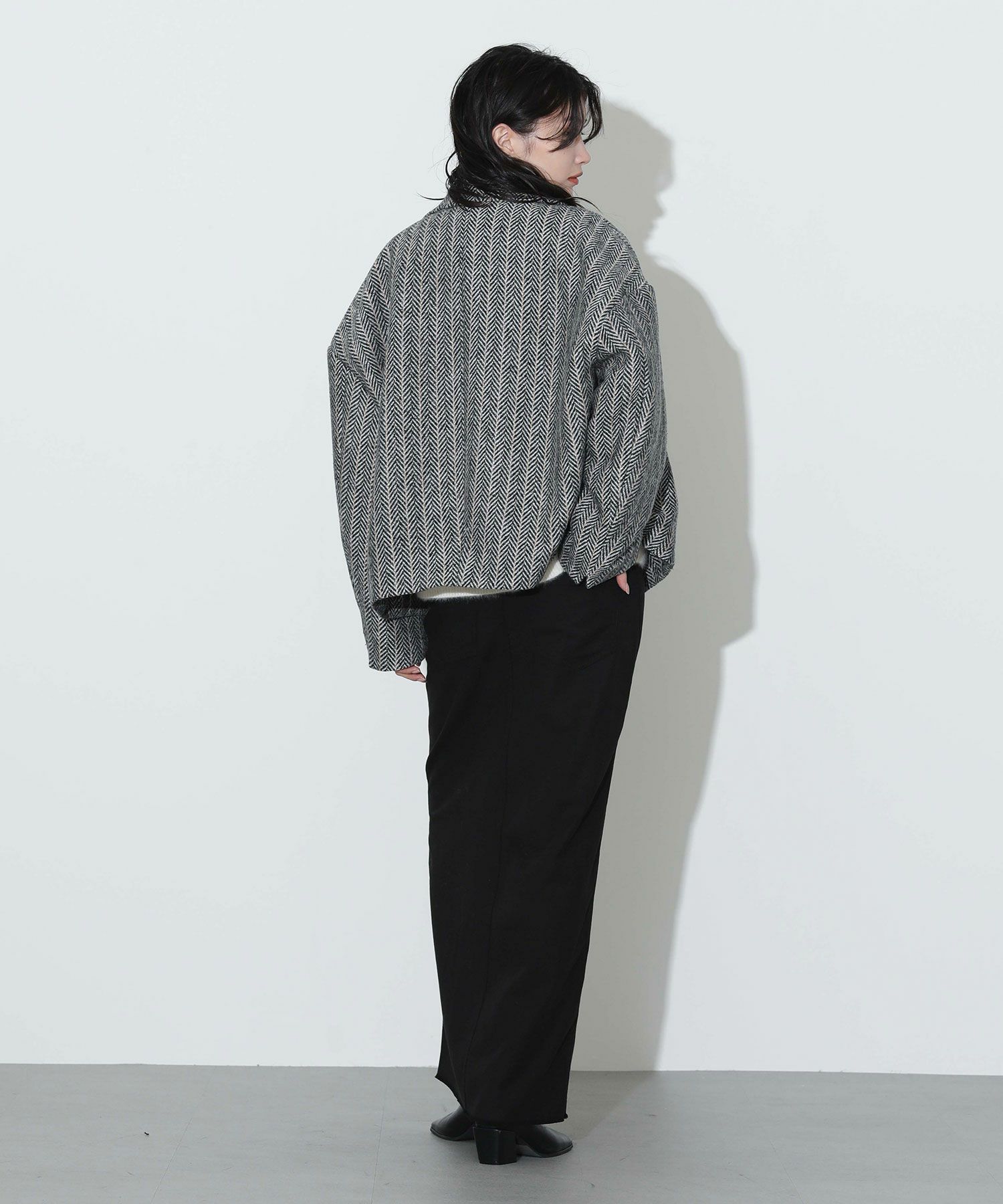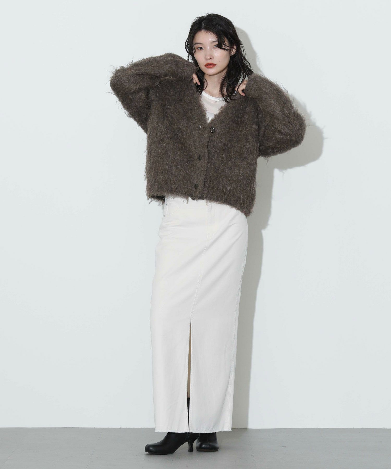 デニムのように経年変化を楽しめる加工感のある生地を使用。ハイウエストはスタイルアップを叶え、ラインを拾わないタイトなシルエットが女性らしい◎前のスリットで足捌きもよく、脚が綺麗に見えるスリットの深さで設定しています。これからのシーズンはブーツと合わせて着用するとバランスが◎