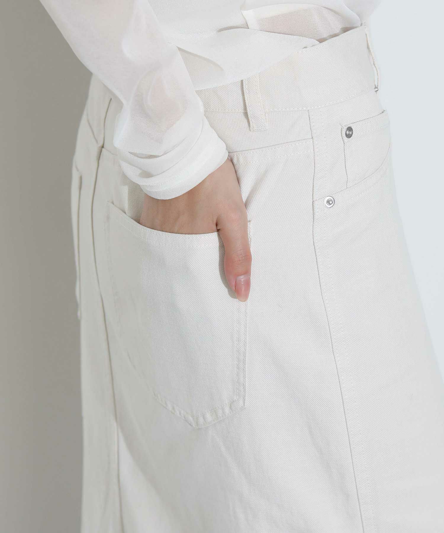 デニムのように経年変化を楽しめる加工感のある生地を使用。ハイウエストはスタイルアップを叶え、ラインを拾わないタイトなシルエットが女性らしい◎前のスリットで足捌きもよく、脚が綺麗に見えるスリットの深さで設定しています。これからのシーズンはブーツと合わせて着用するとバランスが◎