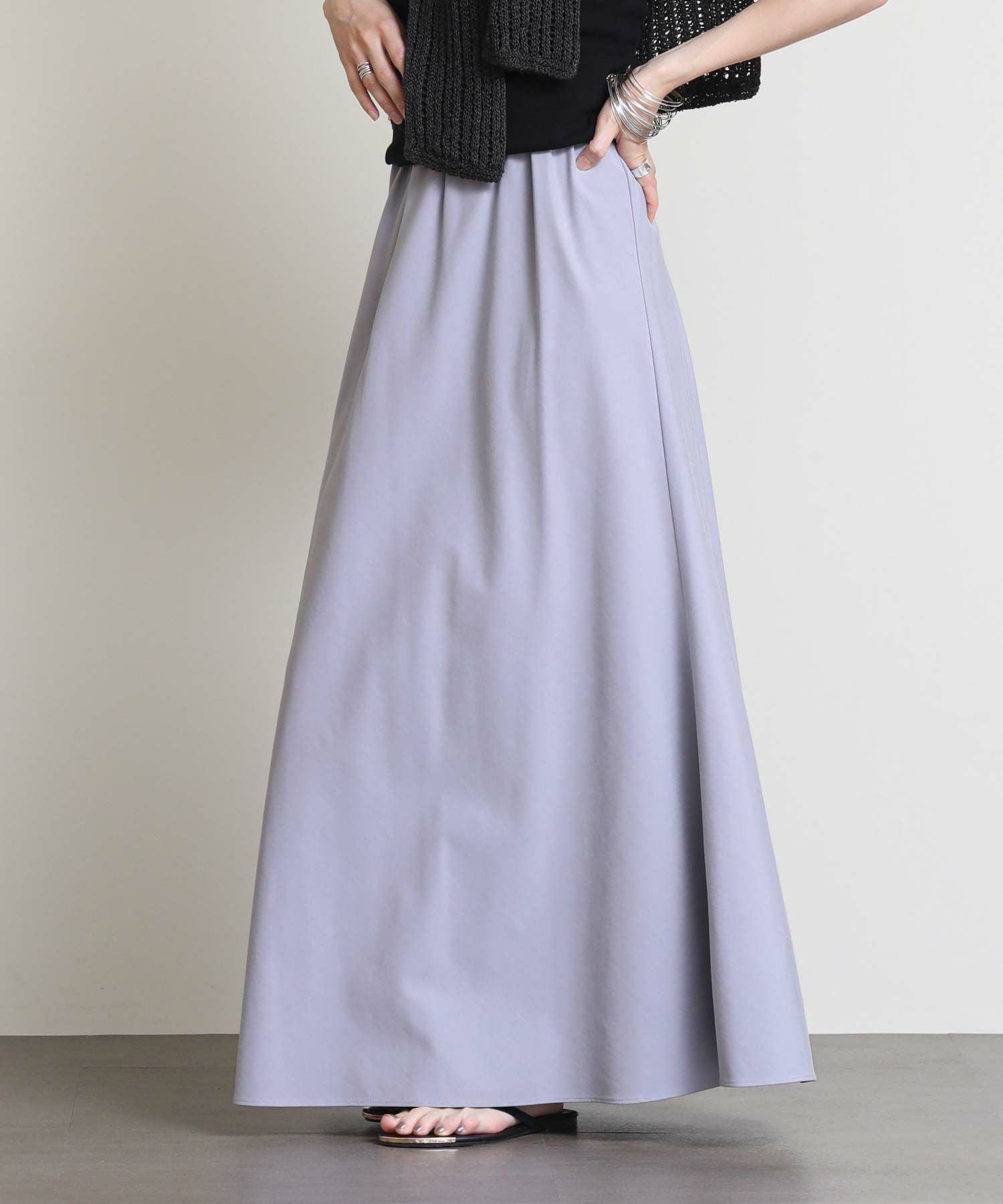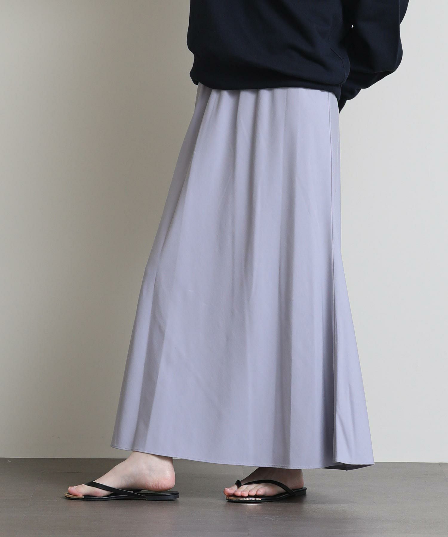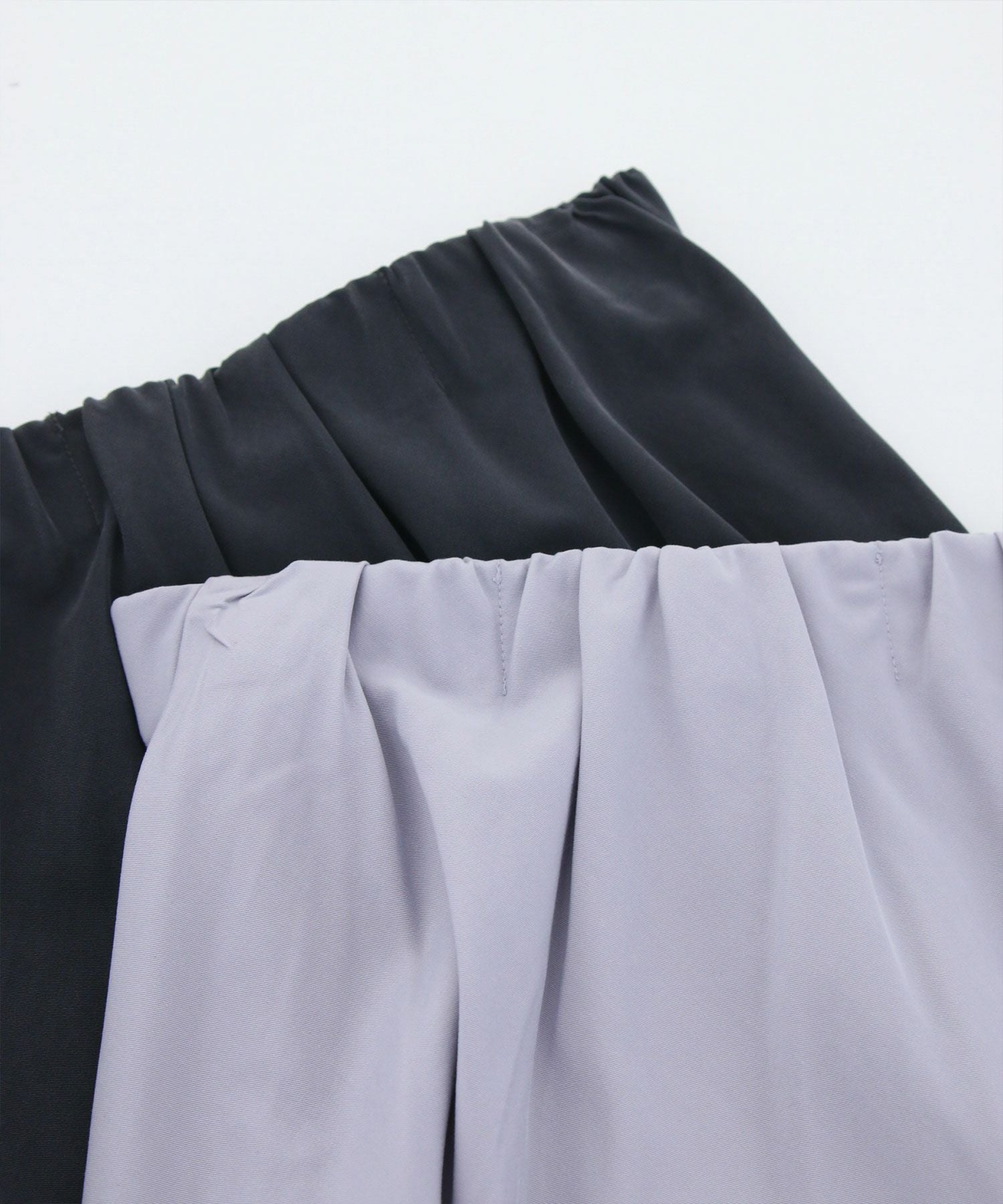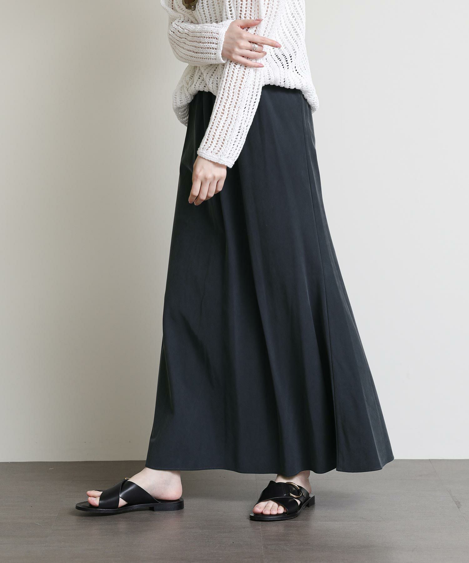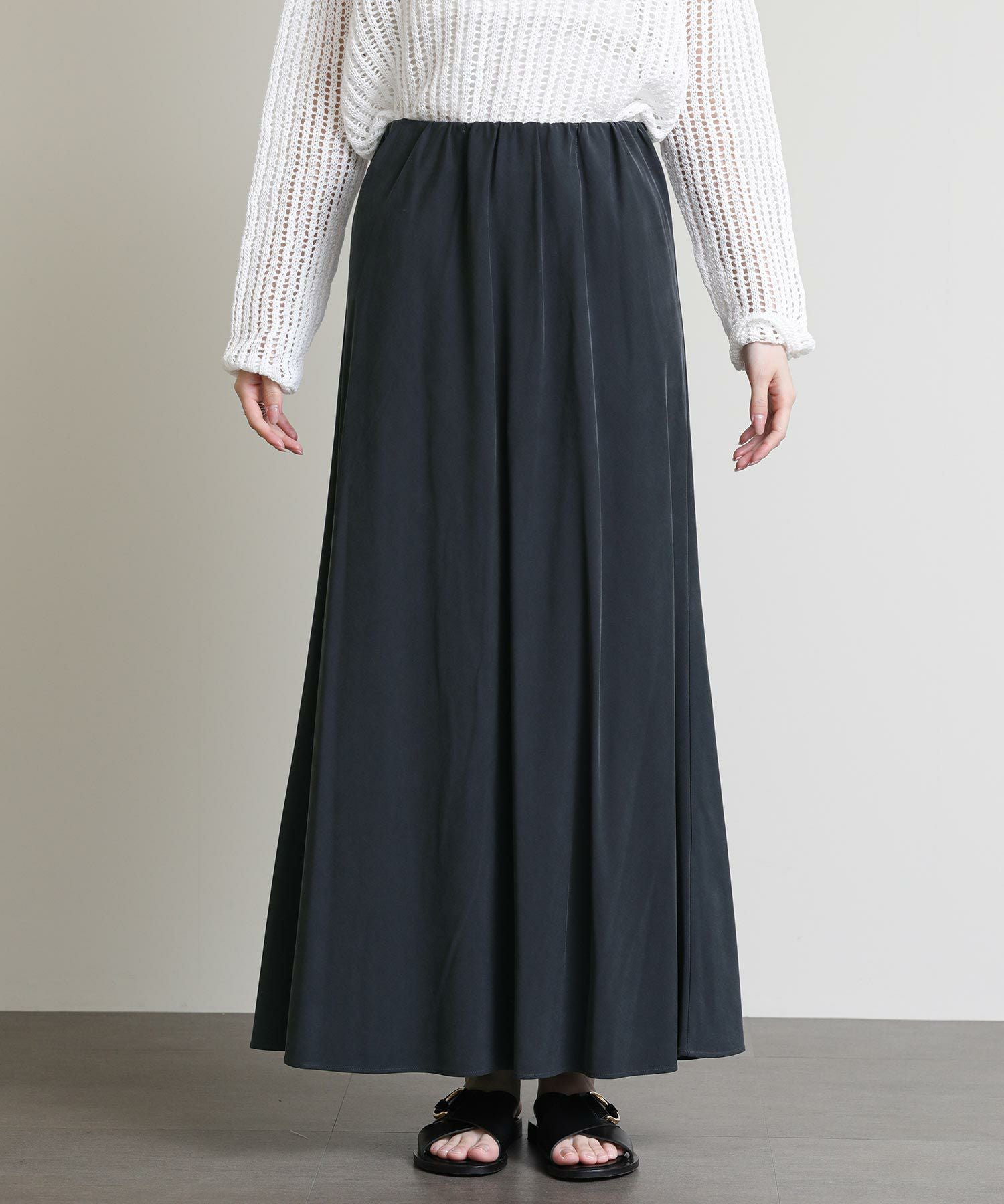 環境に配慮した再生繊維を使用したツイルは上品な光沢感が魅力。裾に広がるフレアのシルエットは足さばきしやすく、ウエストはゴム仕様でストレスフリーな履き心地。Tシャツなどカジュアルなアイテムとの相性も◎