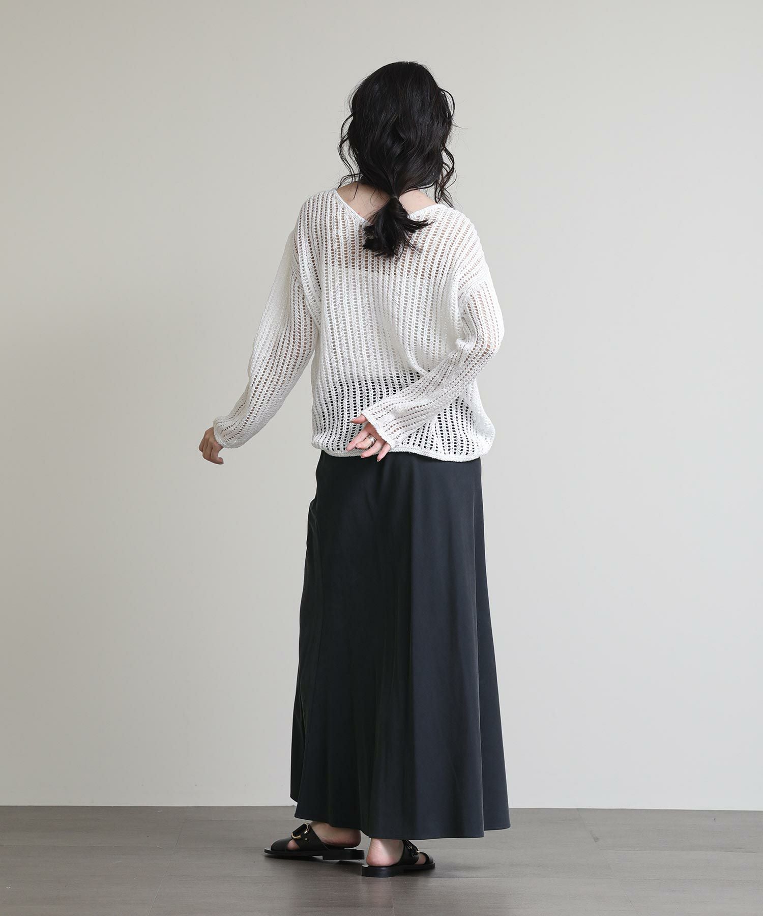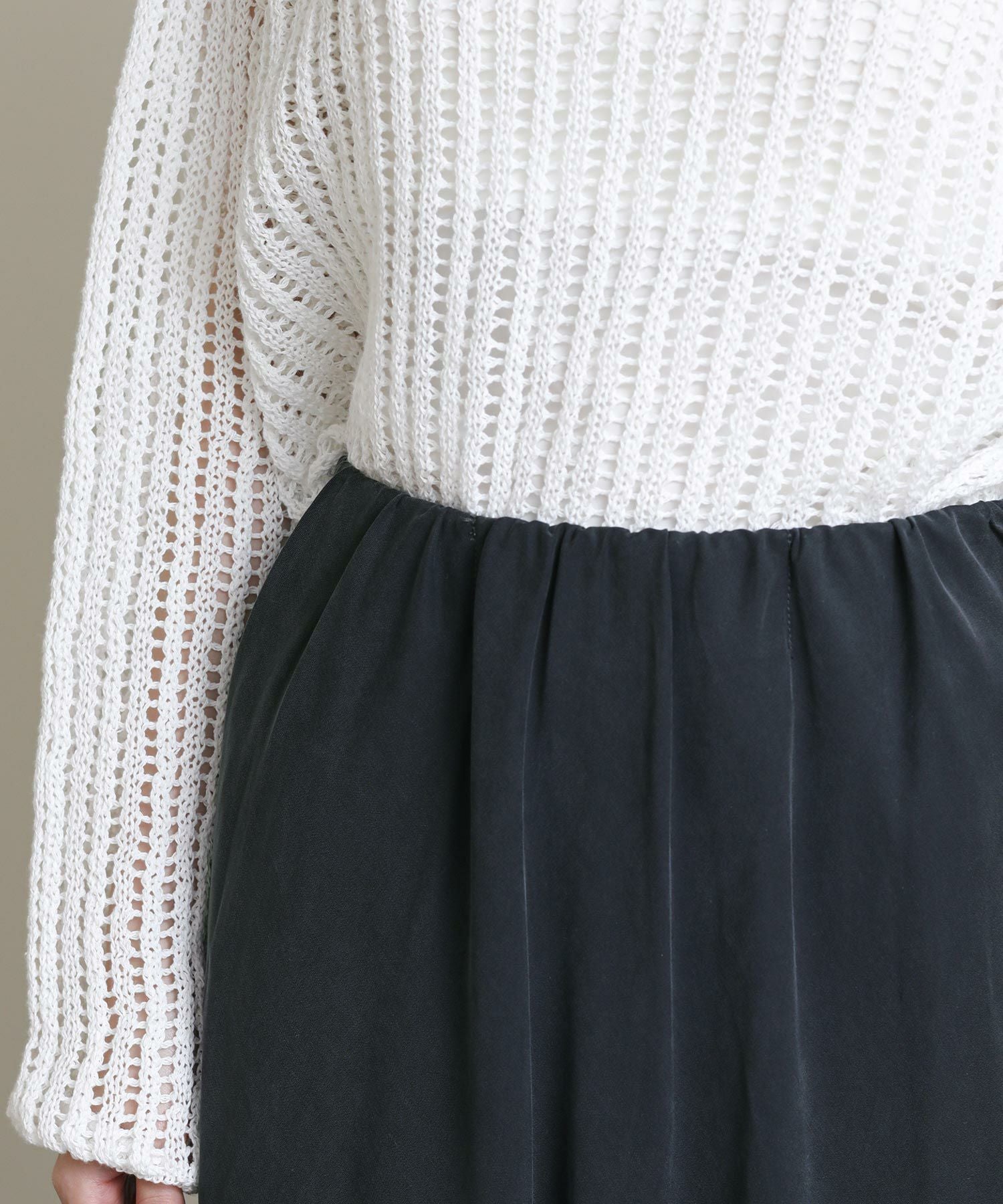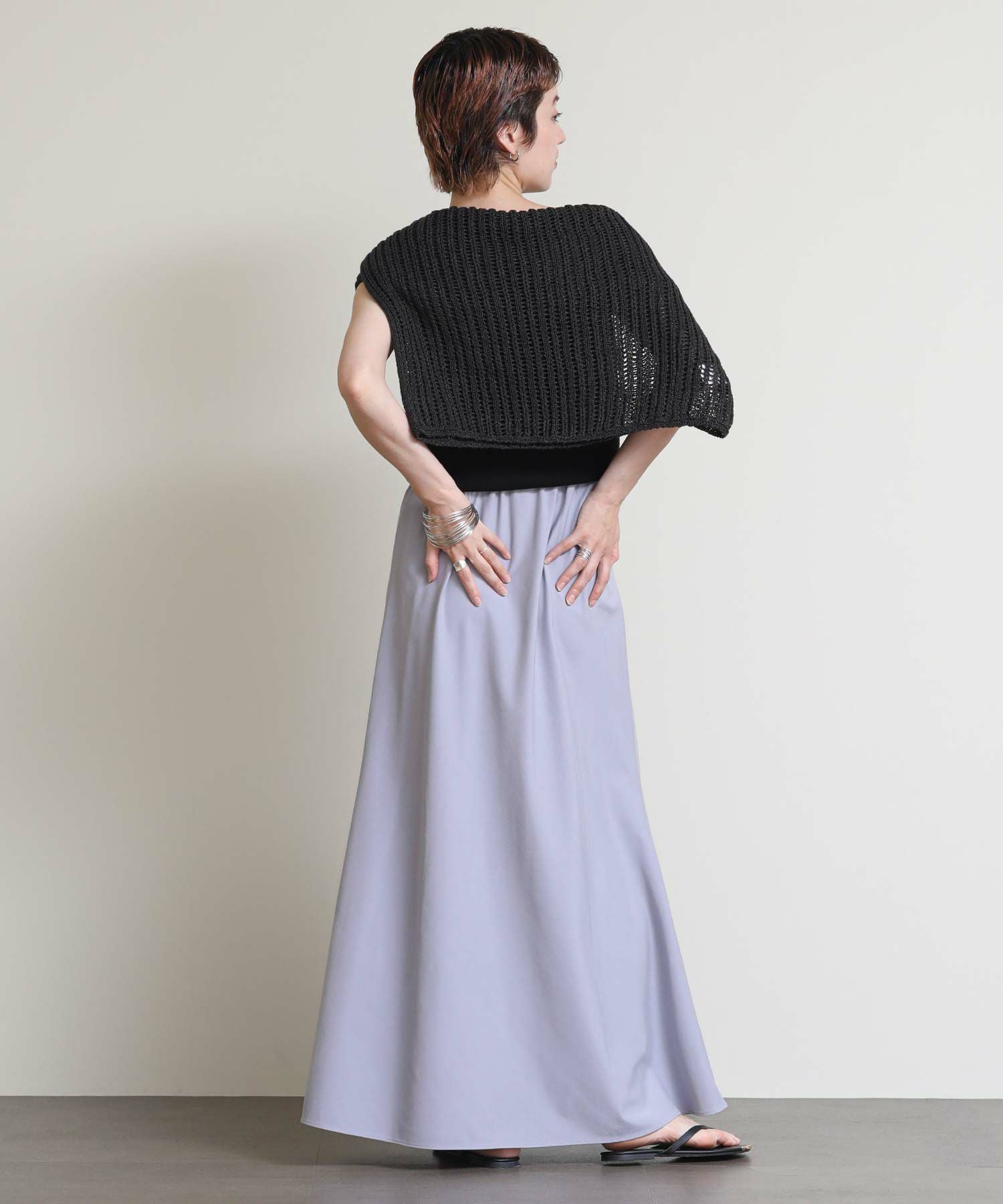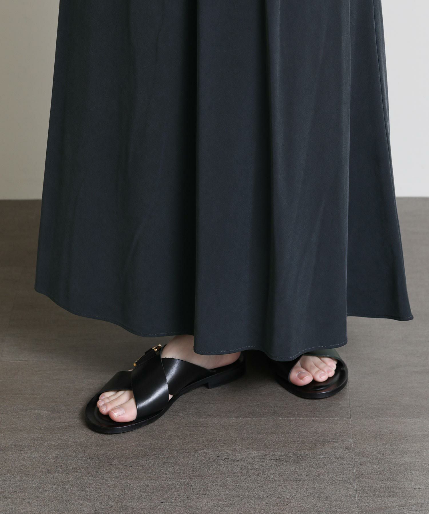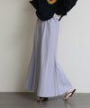 環境に配慮した再生繊維を使用したツイルは上品な光沢感が魅力。裾に広がるフレアのシルエットは足さばきしやすく、ウエストはゴム仕様でストレスフリーな履き心地。Tシャツなどカジュアルなアイテムとの相性も◎