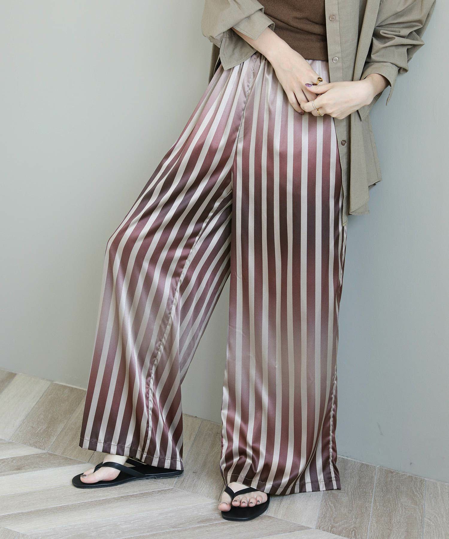 ストライプ柄がすっきりとした縦のラインを強調してくれます。柔らかくしなやかな素材感で脚のラインを自然に拾わないのも嬉しいポイント。上品な光沢感が際立ち女性らしい雰囲気を引き立ててくれます。着心地も良く、華やかなシーンにもデイリーにも使いやすい万能な生地感です。