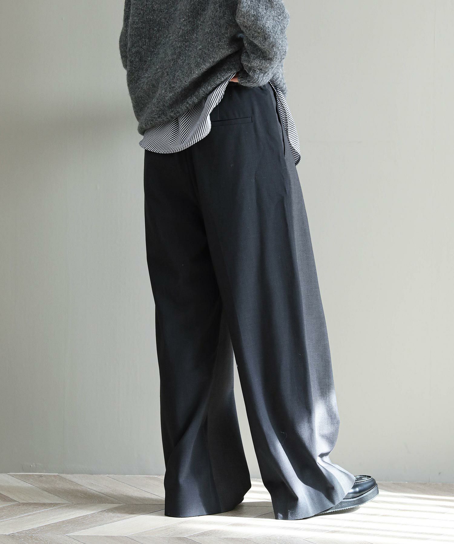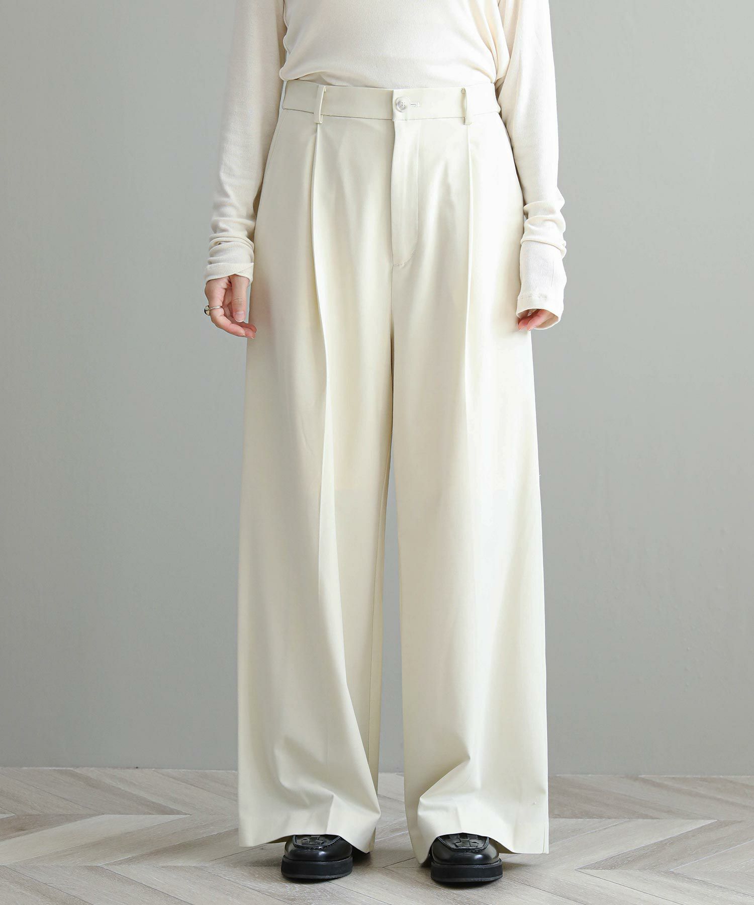 縦のラインが綺麗に出る足長効果◎のワイドパンツ。