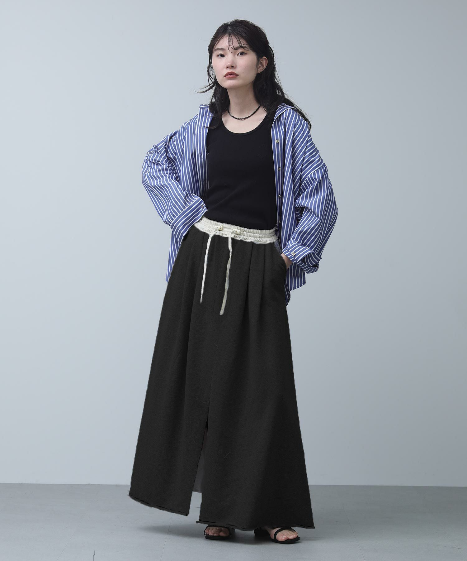 ウエストゴム仕様のラフな着心地でロングシーズン着用いただけます。広がりすぎないAラインシルエットが、身体のラインを拾わずストレスフリーな履き心地。一枚でこなれ感の出るアイテムです。