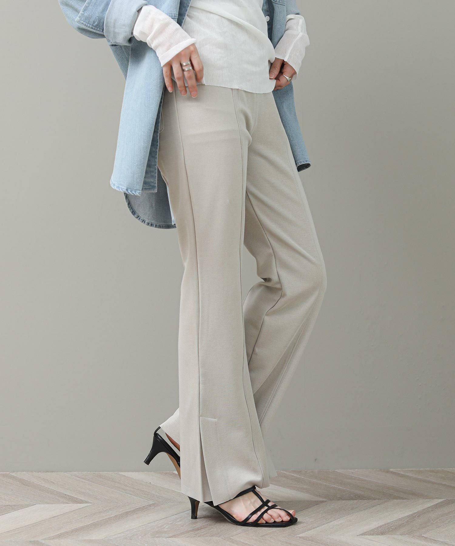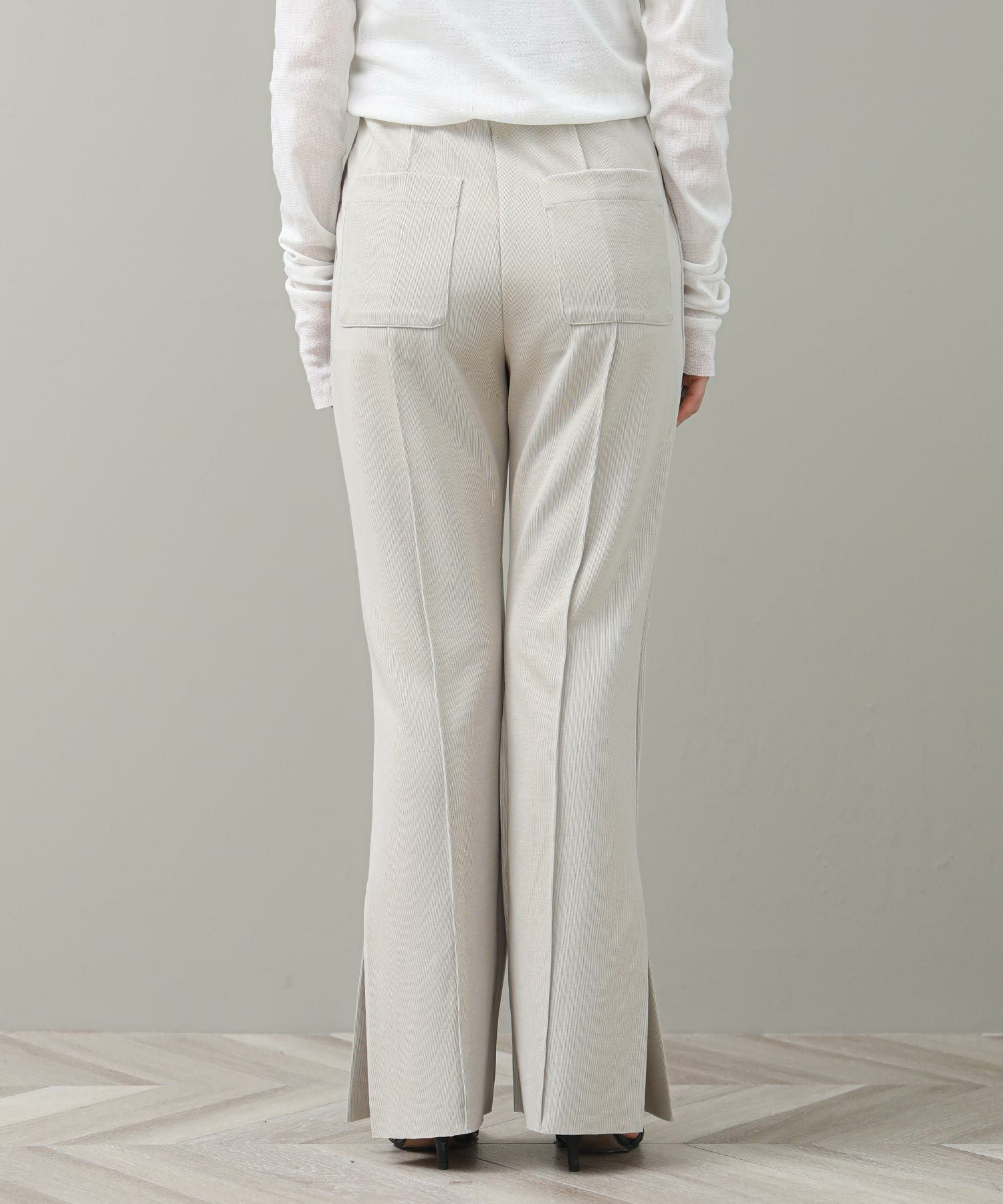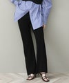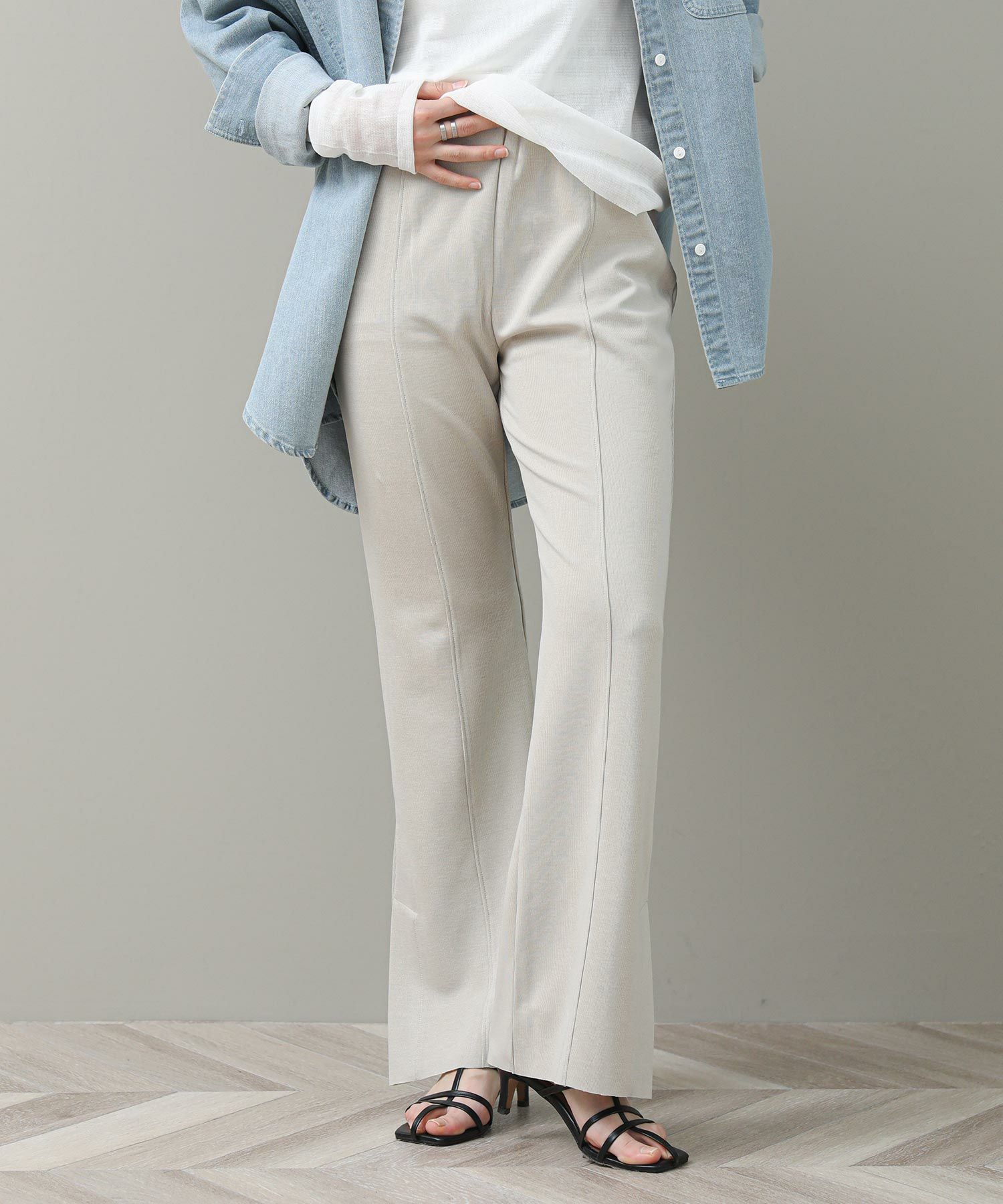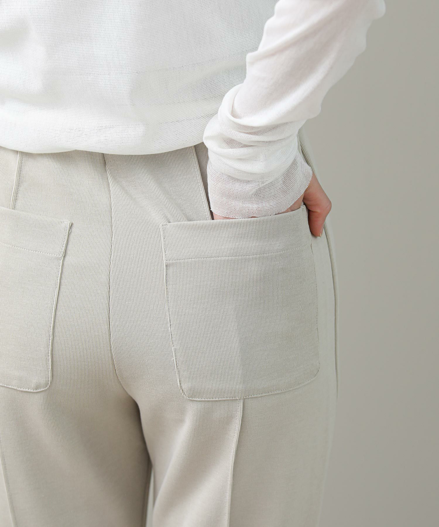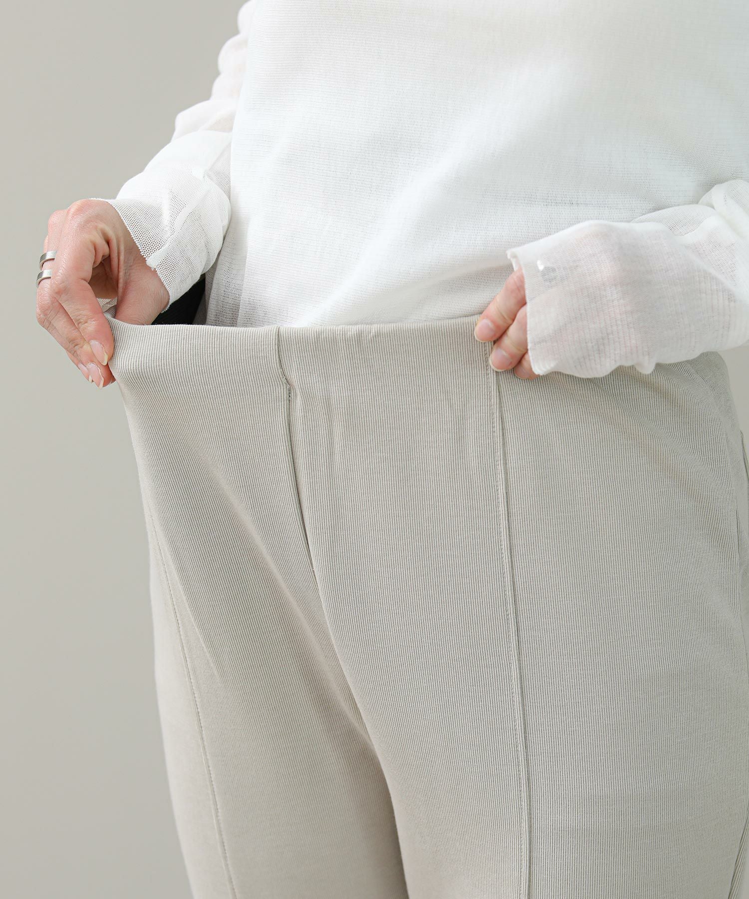 カジュアルな印象のあるリブですが、美しい落ち感と程よい光沢感できれいめな表情が魅力です。シルエットは、脚長効果を最大限に引き出すフレアライン。裾のサイドベンツが歩くたびに軽快な抜け感をプラスします。ウエストはインゴム仕様でリラックスして着用でき、ヒップポケットのデザインが、スパッツ感なく普段使いしやすいルックスを確立します。履いていることを忘れるほど楽ちんな着心地と、どんなトップスにもマッチする万能性は、レイヤードスタイルから主役使いまで幅広く対応でいる万能パンツです。