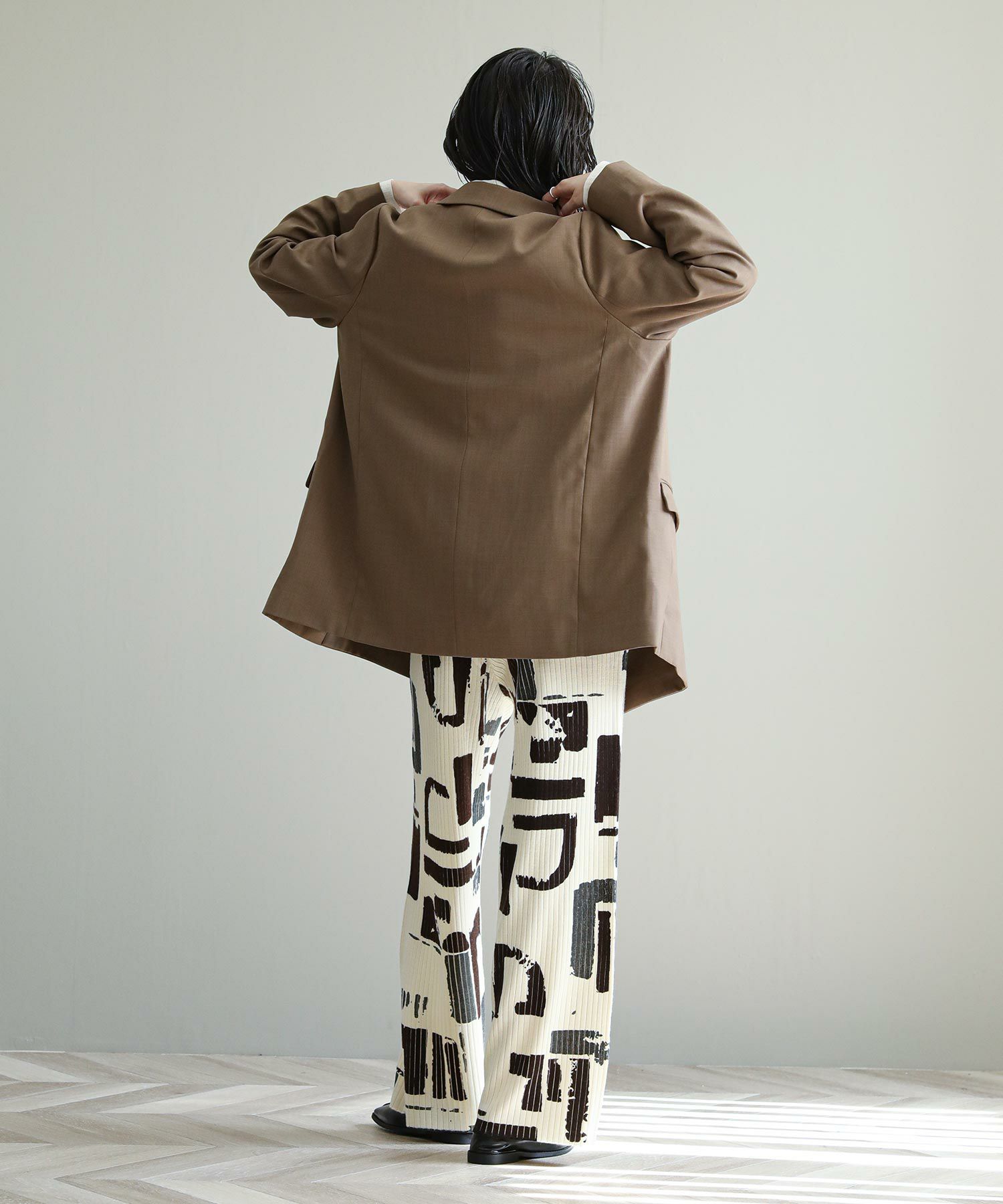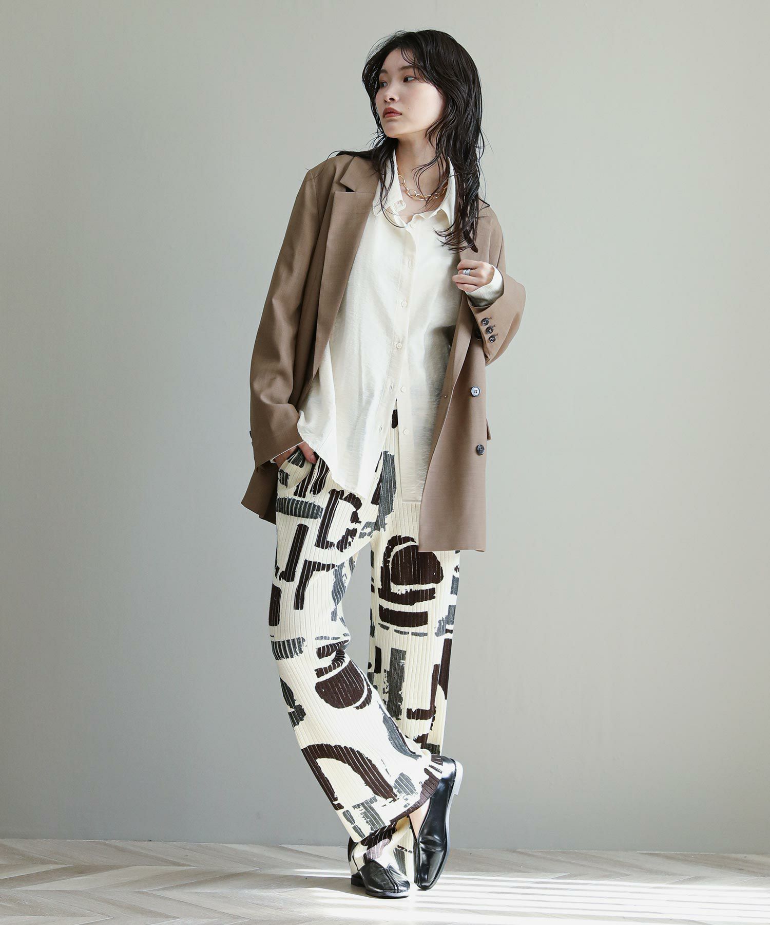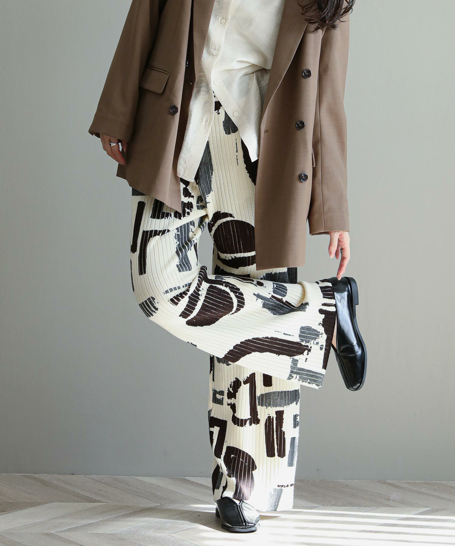 3色の内、1色は箔プリントが施されています。適度な落ち感を重視し、重みのない軽やかな履き心地が特徴です 。ニットパンツでは珍しいサイドポケットが付いており、ウエストはゴム仕様も嬉しい。編地と柄の配色が目を惹くリブニットパンツです。