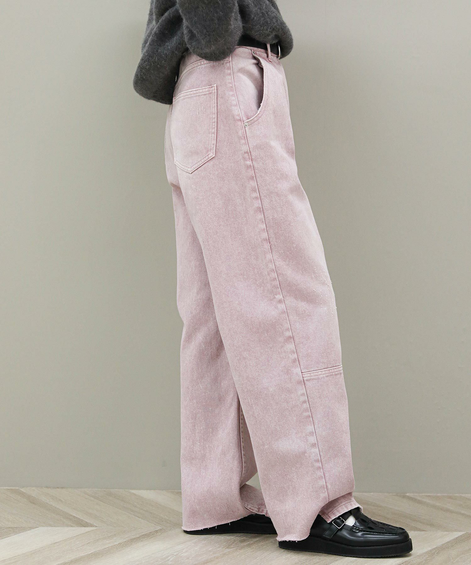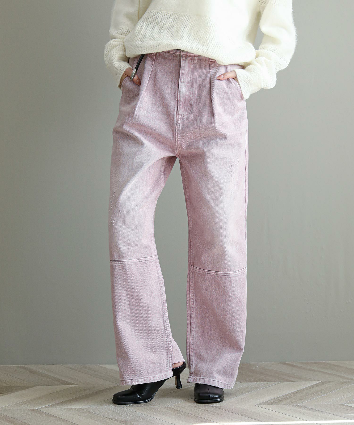 メンズライクな13.2オンスデニムを使用ししています。全体的にオーバーサイズなシルエットとウエスト位置がハイライズの設定に。タックを寄せてウエストを絞るデザインは、おなか周りが苦しくなくリラックスした穿き心地を叶えてくれます。裾は前が長く後が短い段違の設定にすることで裾を引きずりにくく、かつ足長効果を生むデザインに。前裾だけワンクッションできこなれ感もアップします。膝下にいれた切り替えデザインや、細部に施したさりげないダメージ加工など、こだわりのつまった1枚です。