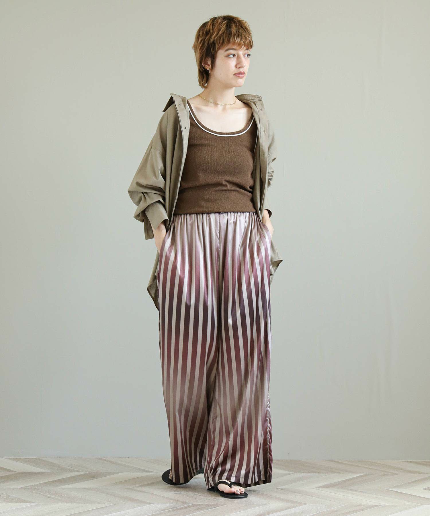 ストライプ柄がすっきりとした縦のラインを強調してくれます。柔らかくしなやかな素材感で脚のラインを自然に拾わないのも嬉しいポイント。上品な光沢感が際立ち女性らしい雰囲気を引き立ててくれます。着心地も良く、華やかなシーンにもデイリーにも使いやすい万能な生地感です。