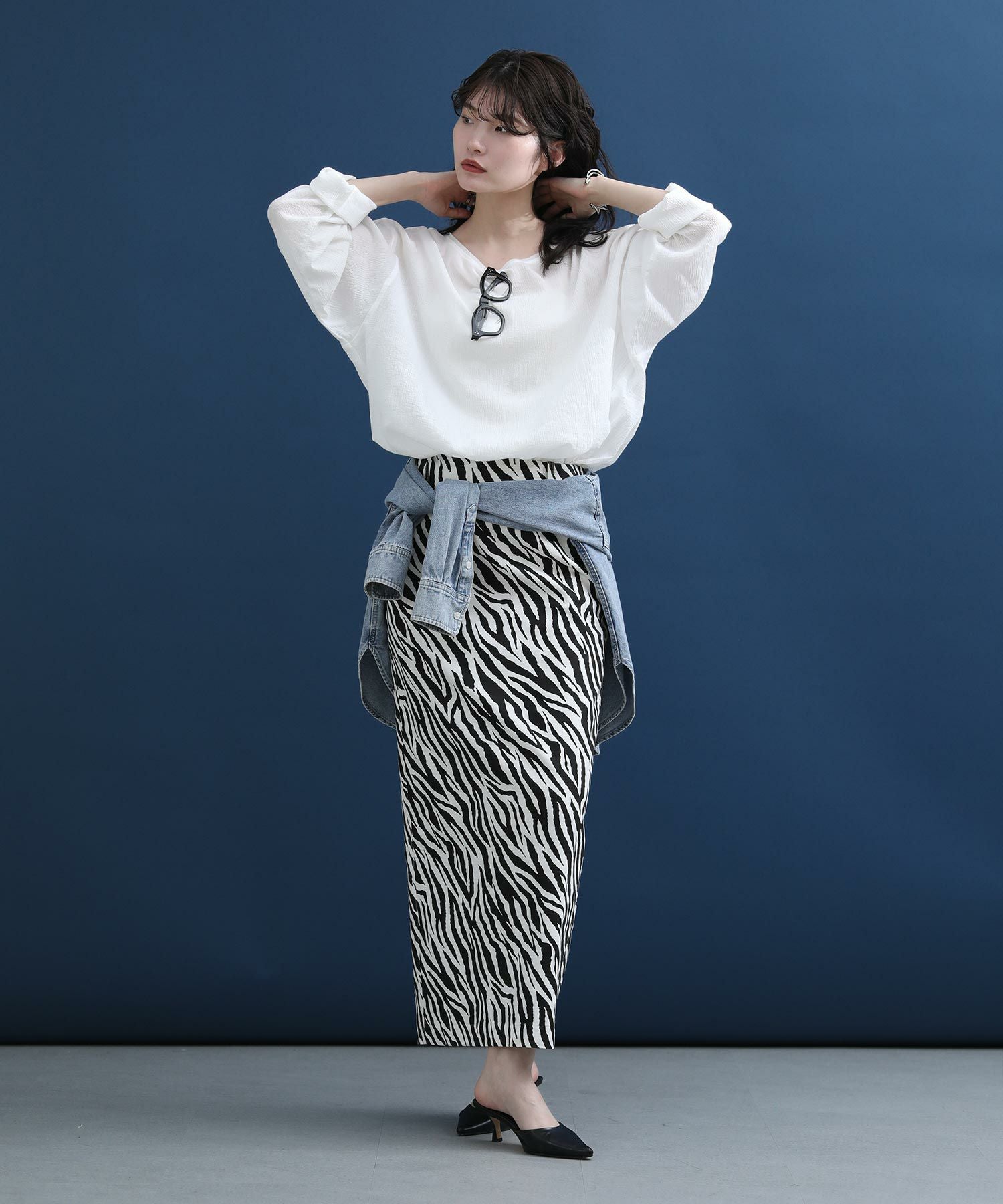 シンプルなトップスに合わせるだけで着こなしに鮮度が出る主役級のアイテムです。デニムシャツやスウェットなどカジュアルなアイテムと合わせると、こなれ感もアップ◎タイトシルエットですが、ハリのある素材感で足のラインを拾いません。”歩きやすさ”と”足が見えすぎない”を両立したスリットもポイントです。