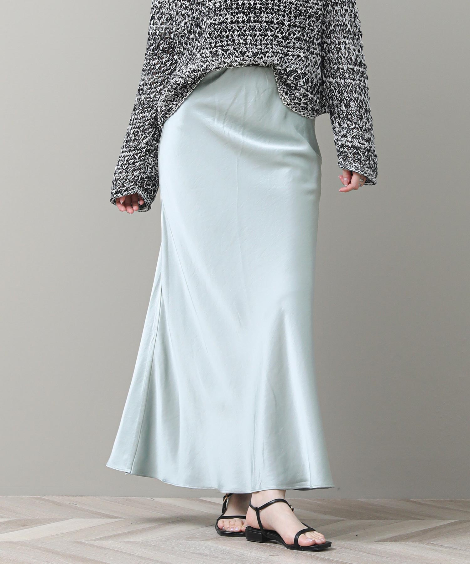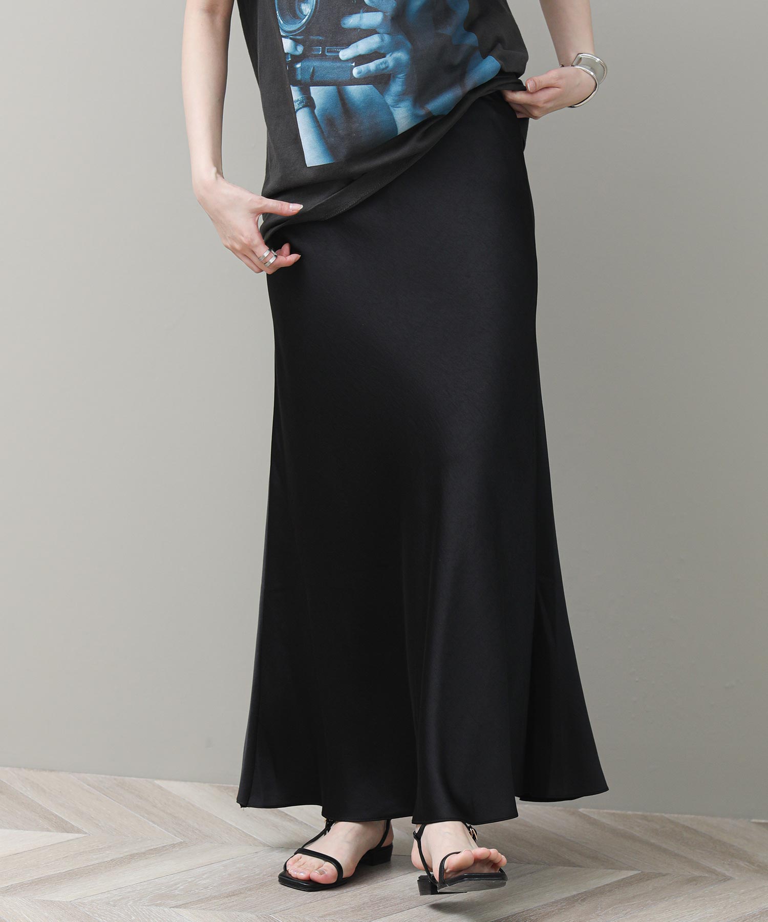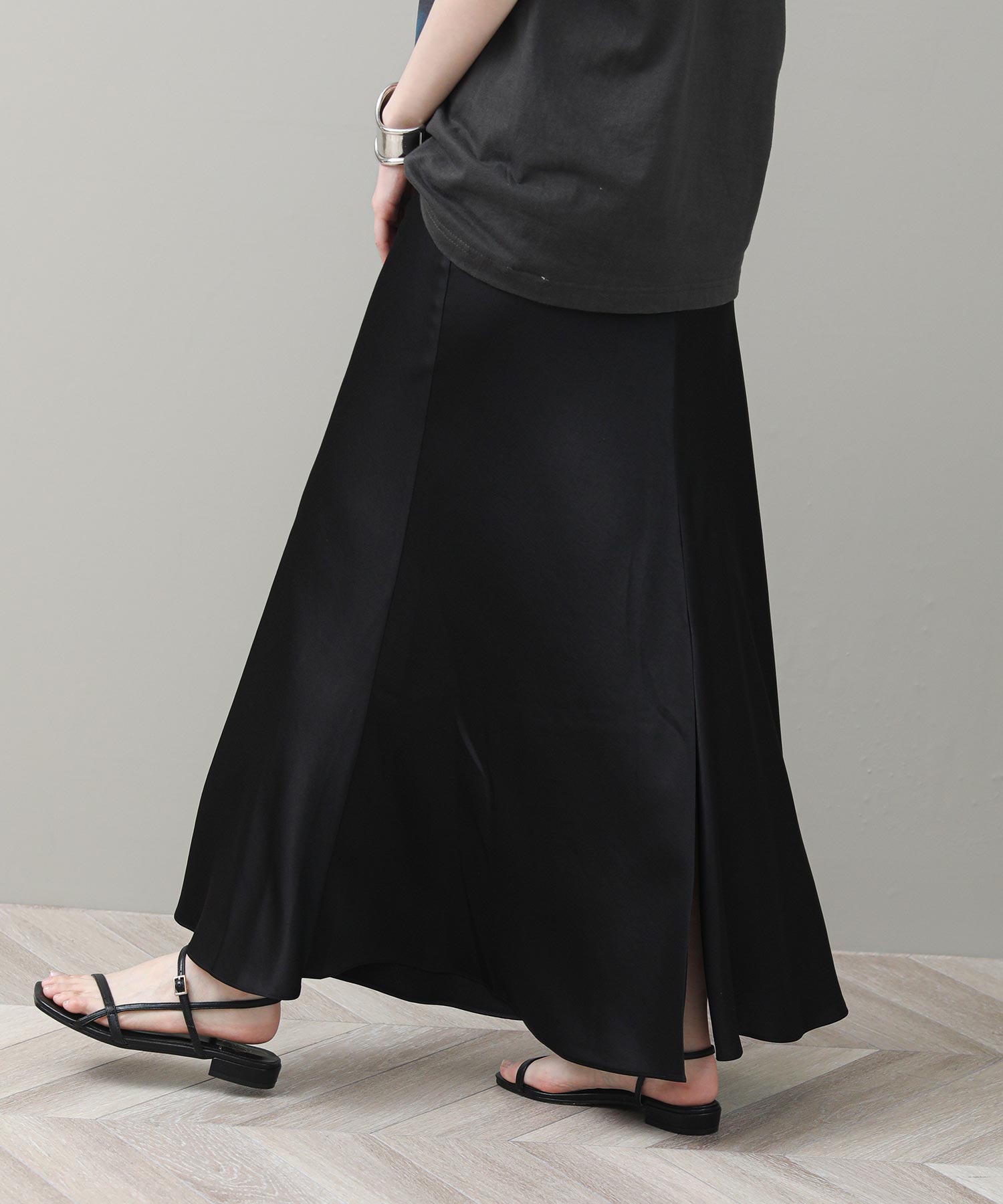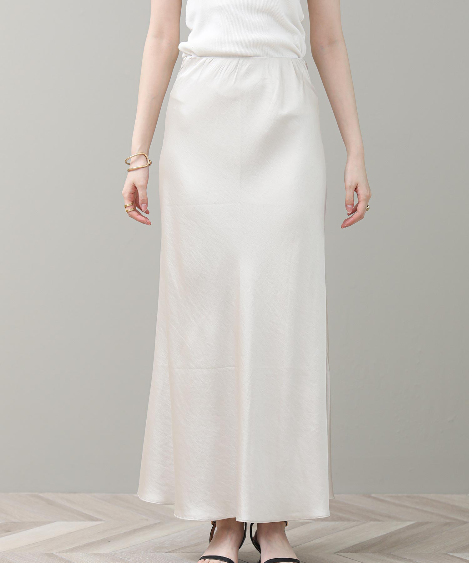 品のある光沢感が魅力のナロースカート。