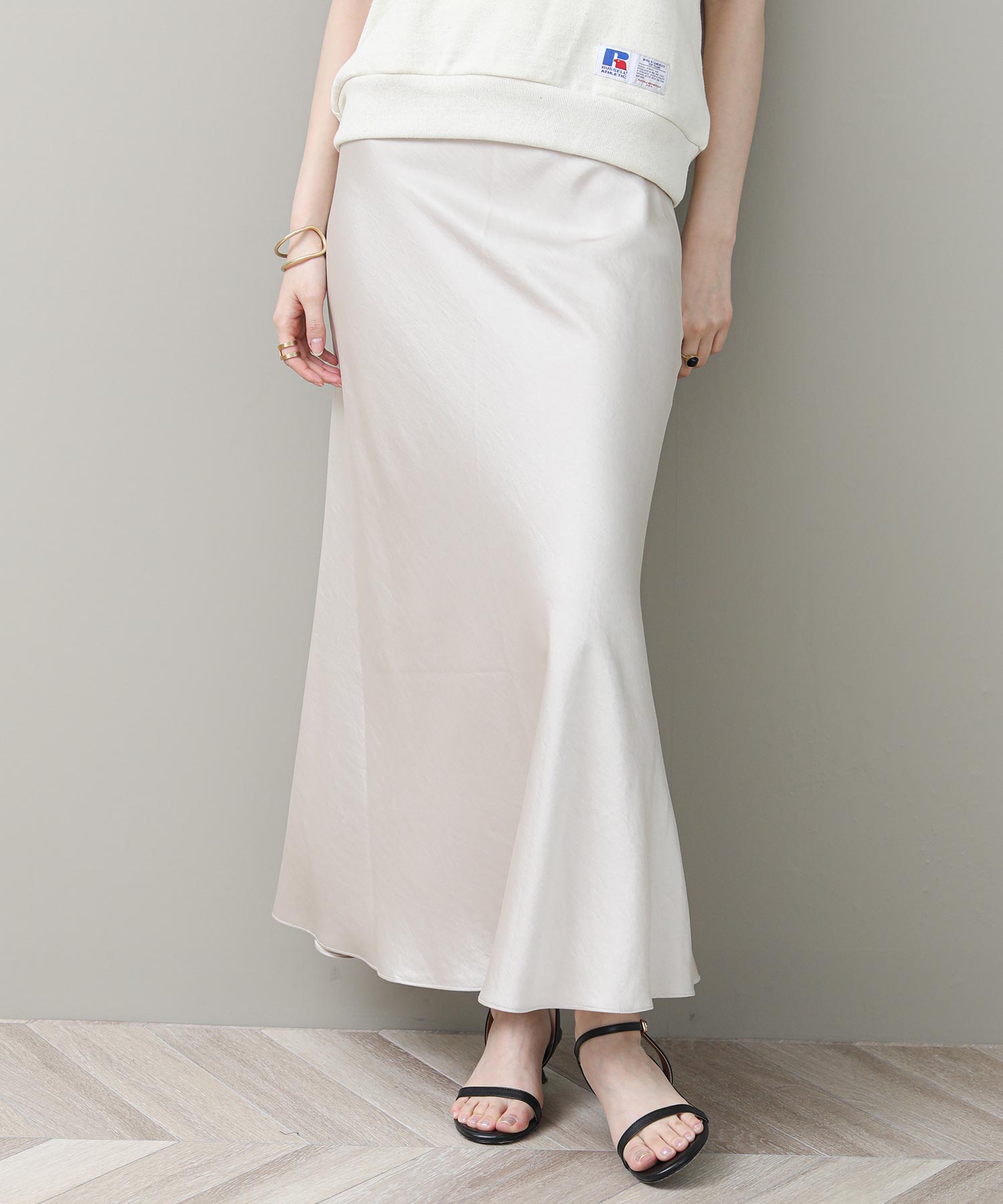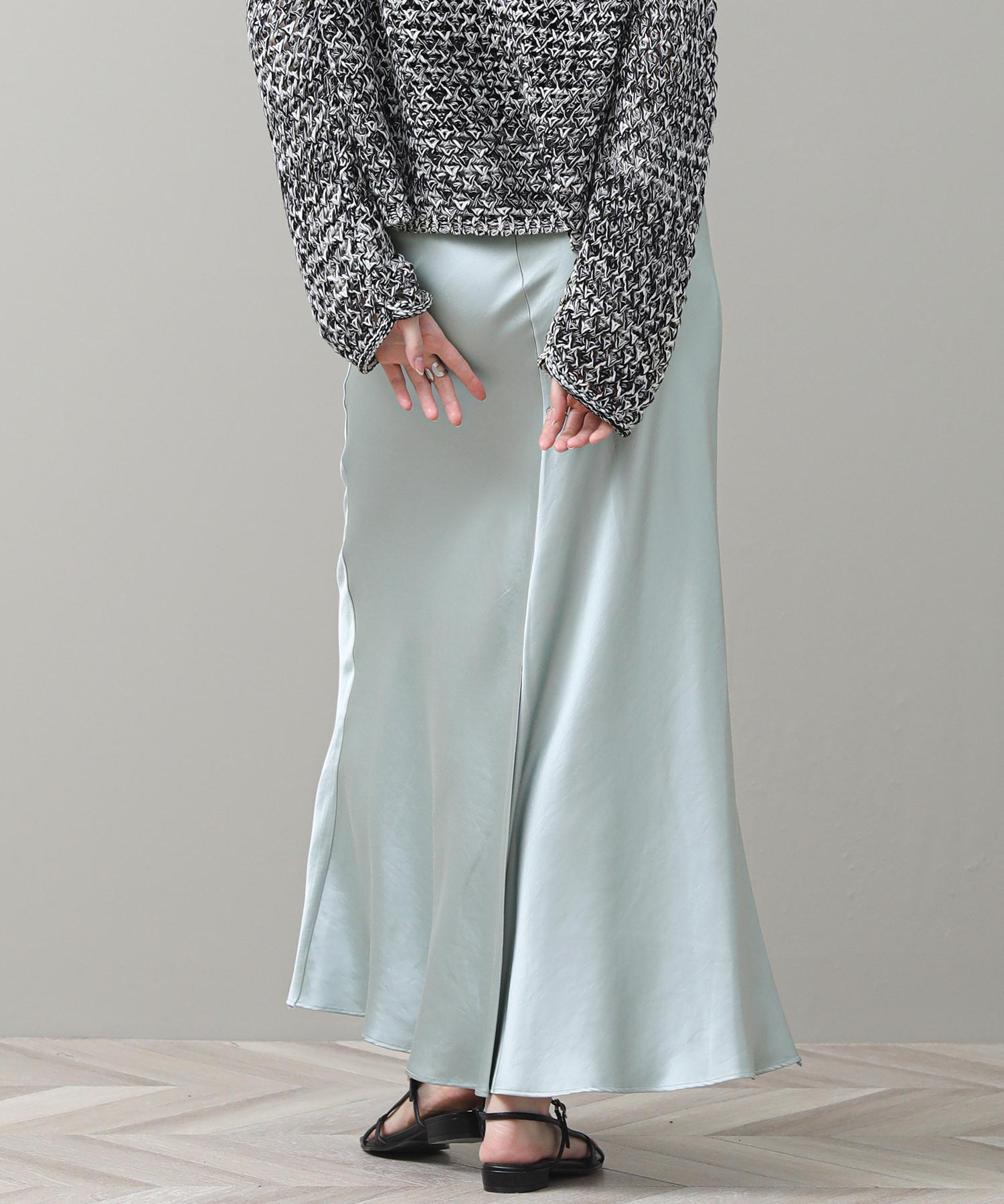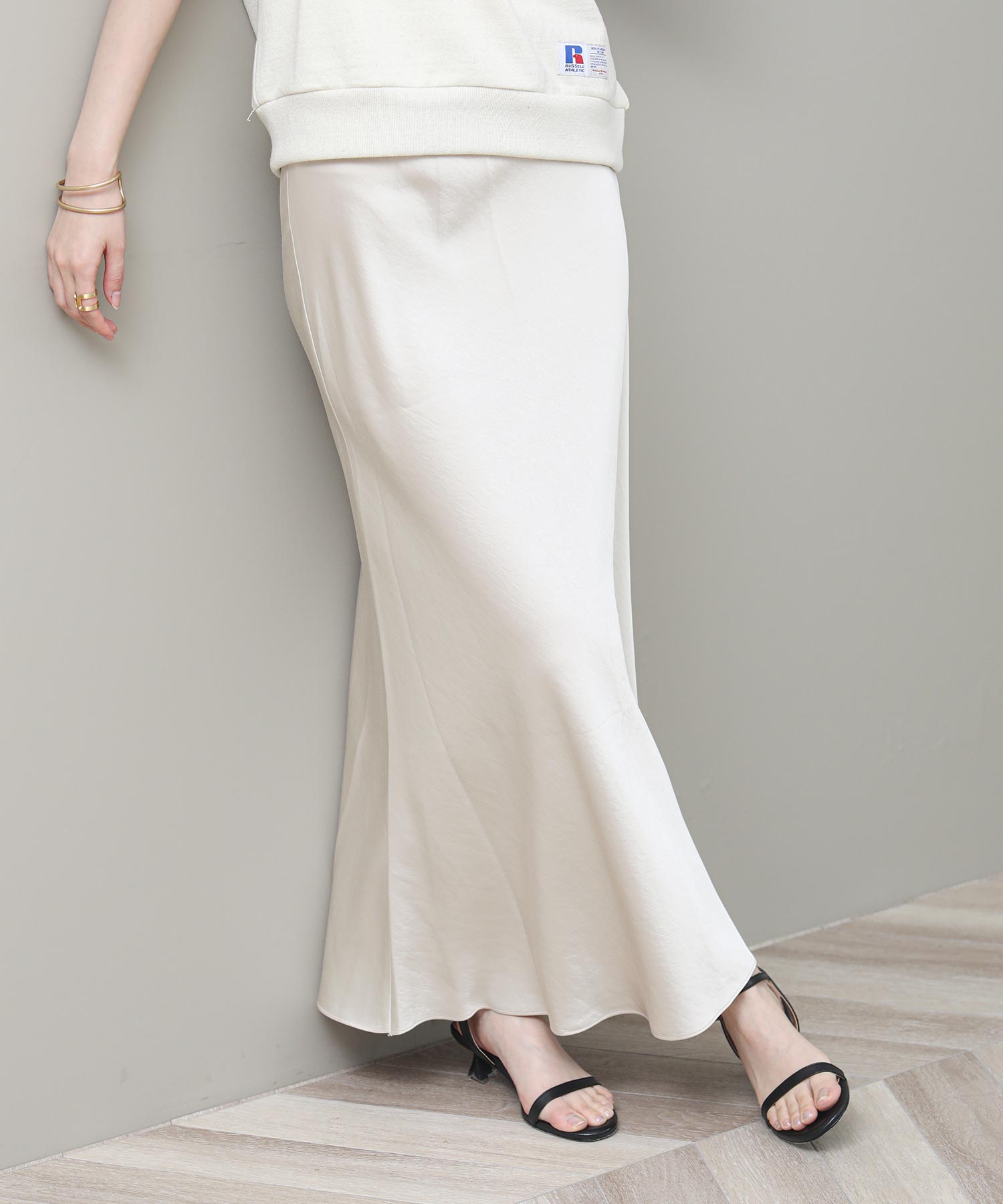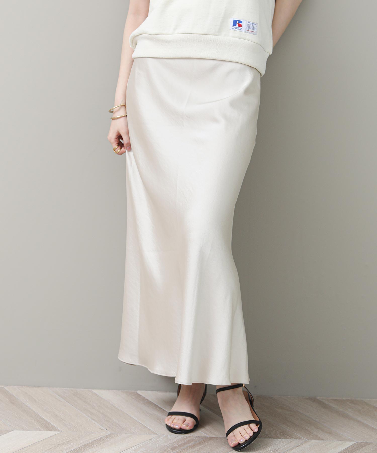 品のある光沢感が魅力のナロースカート。