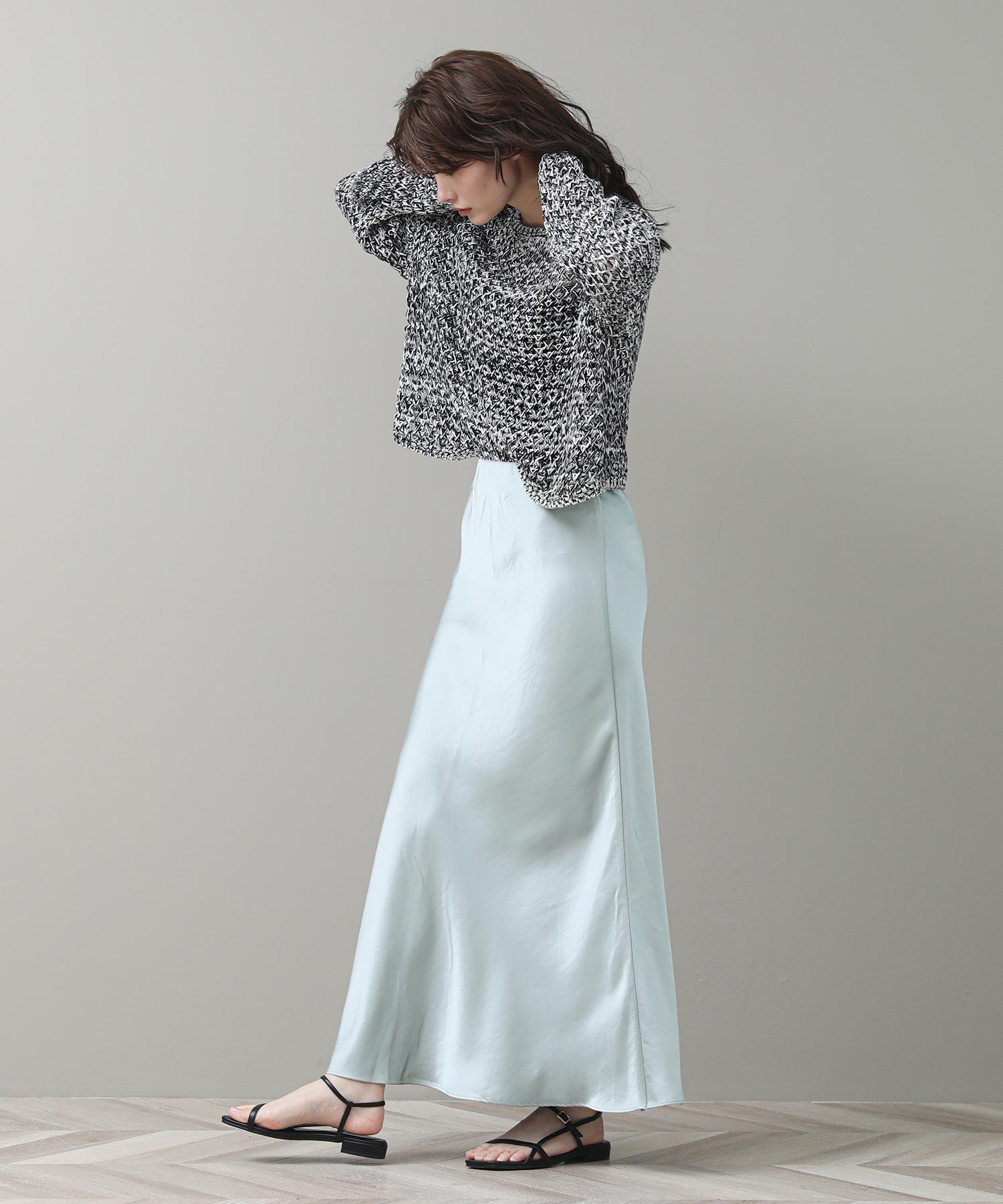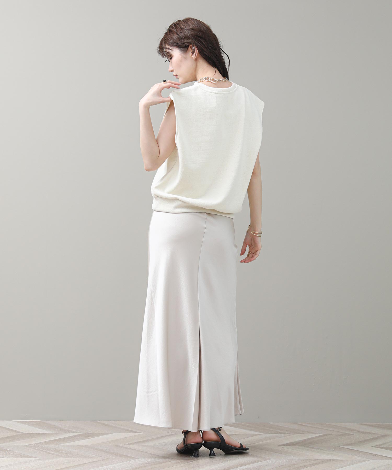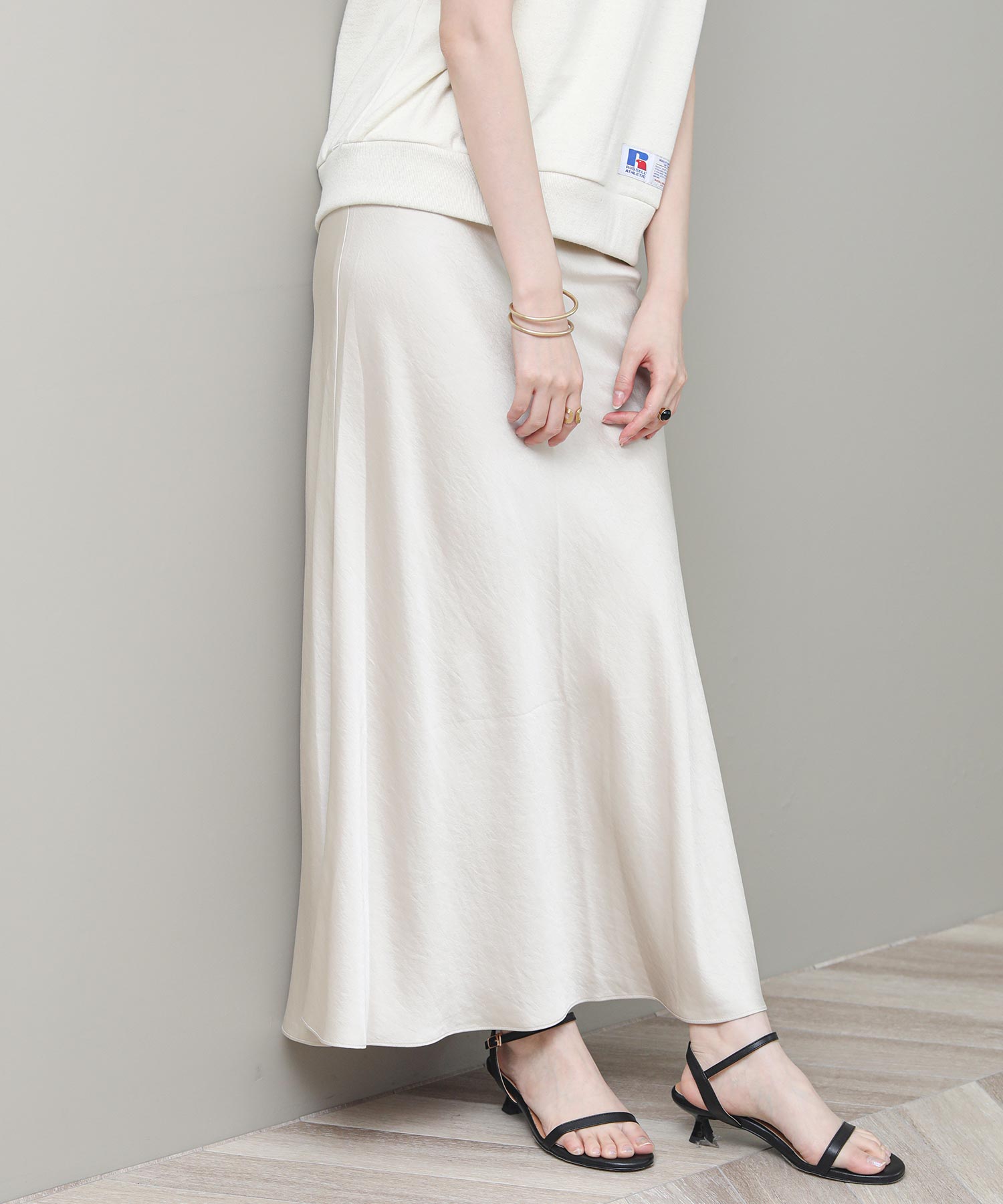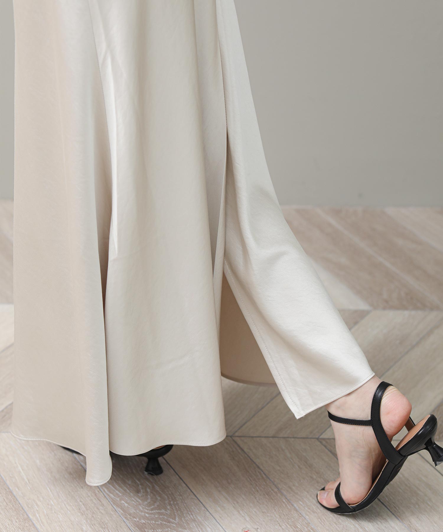 品のある光沢感が魅力のナロースカート。