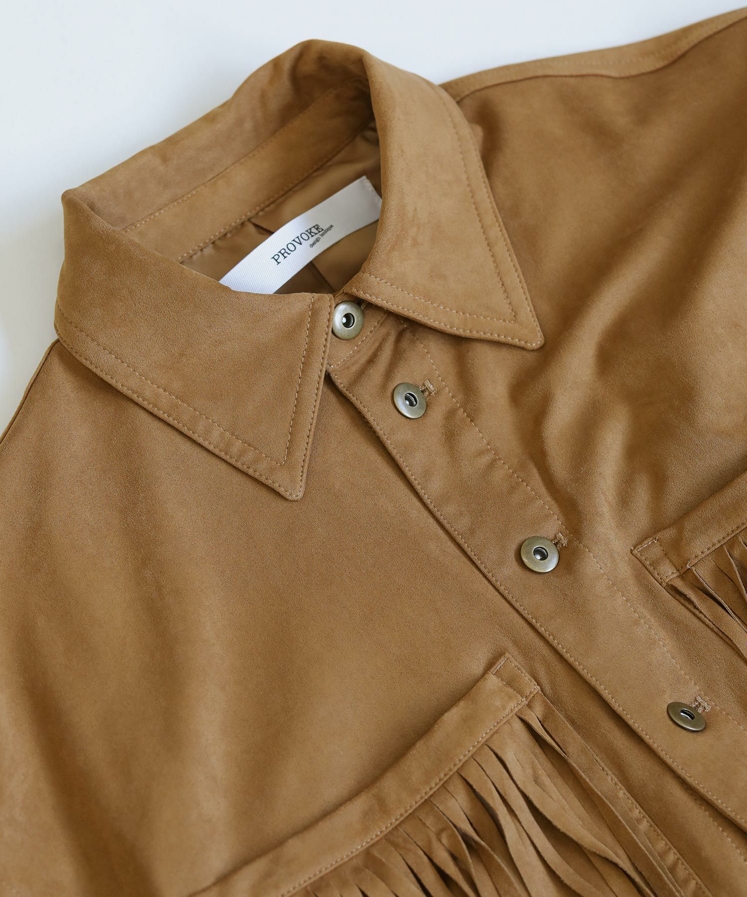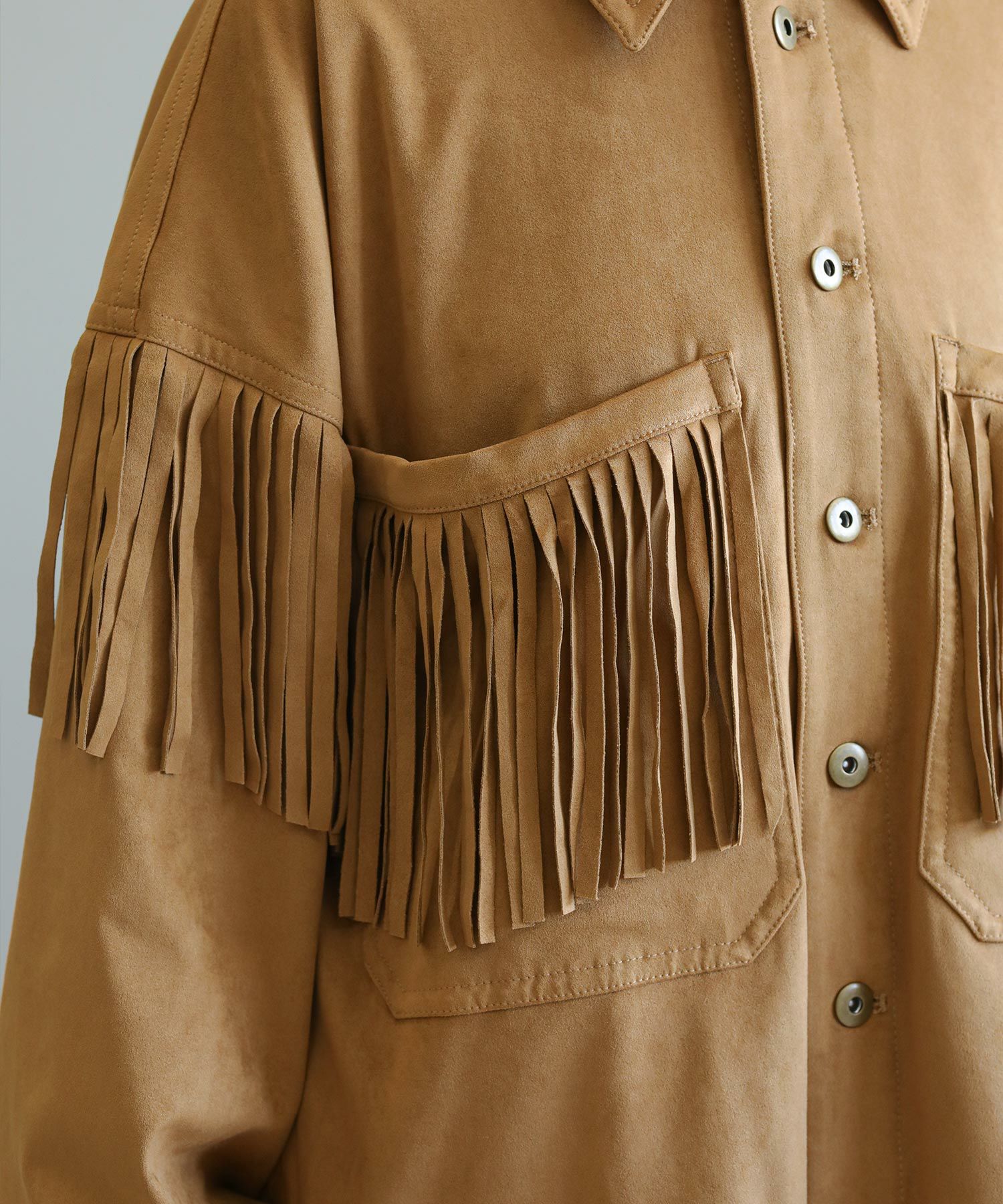 フリンジがアクセントになったスエードライクなシャツジャケット。