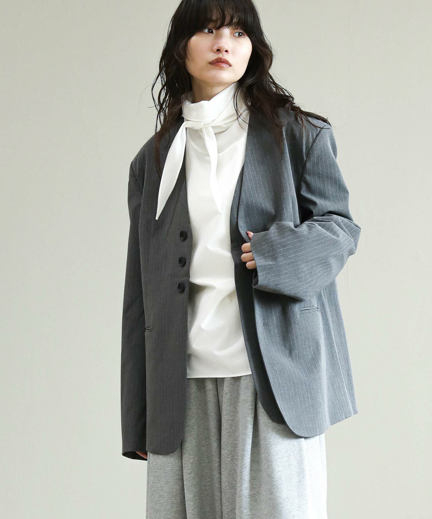 しわになりにくい、肌触りの良い素材です。左身のフロントを2枚重ねたディテールがポイント。前を閉じるとボタンが見えず、ポケット口は細めの両玉縁ポケットでスッキリと仕上げています。ミニマルなデザインながら、重なったフロントデザインがスタイリングのアクセントに。薄手の肩パット入りのかちっとしたシルエットがスマートな印象。トレンドスタイルを楽しめるオーバーシルエットです。