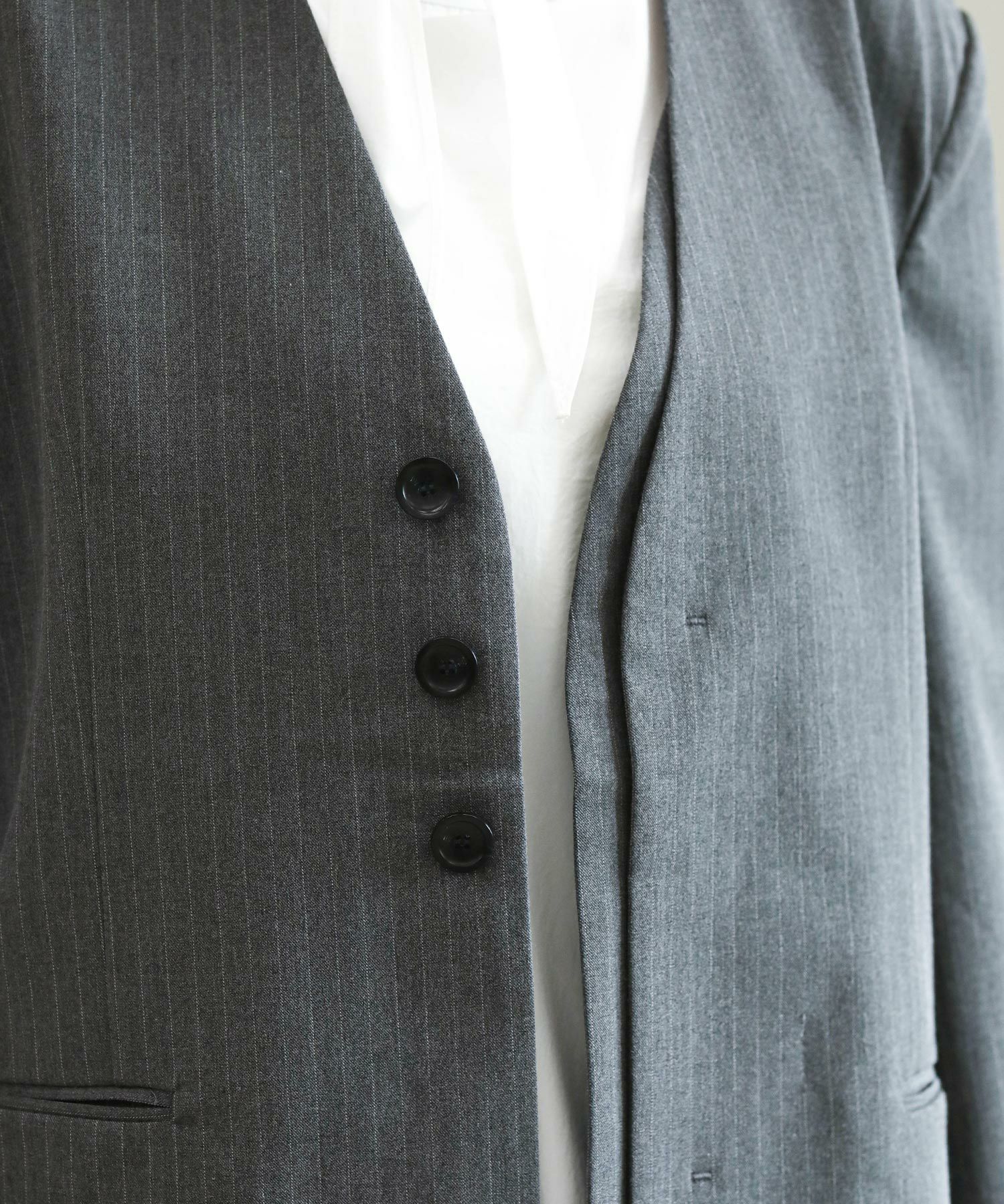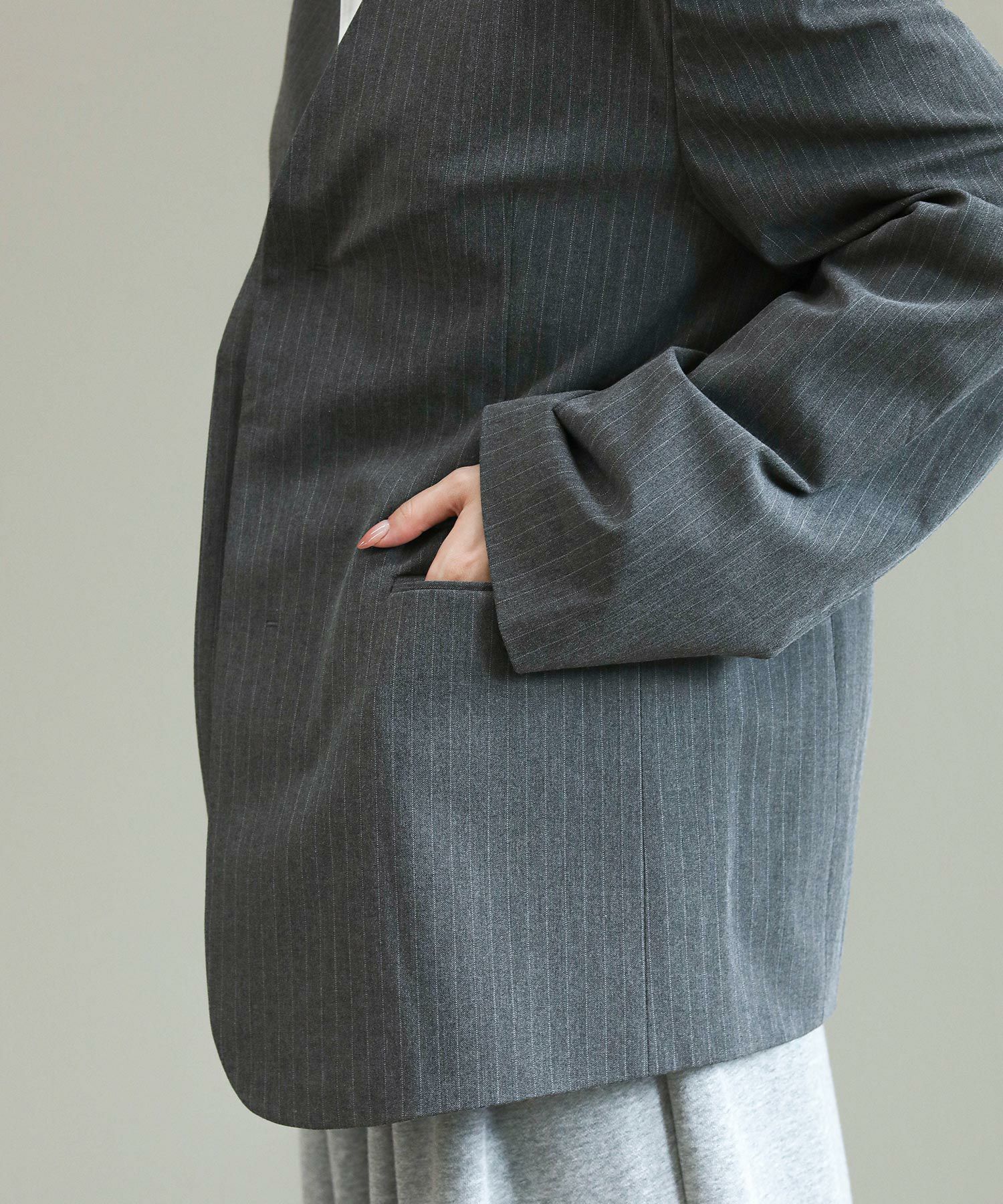 ストレッチ性のある平織りの杢調素材で仕上げたノーカラージャケット。