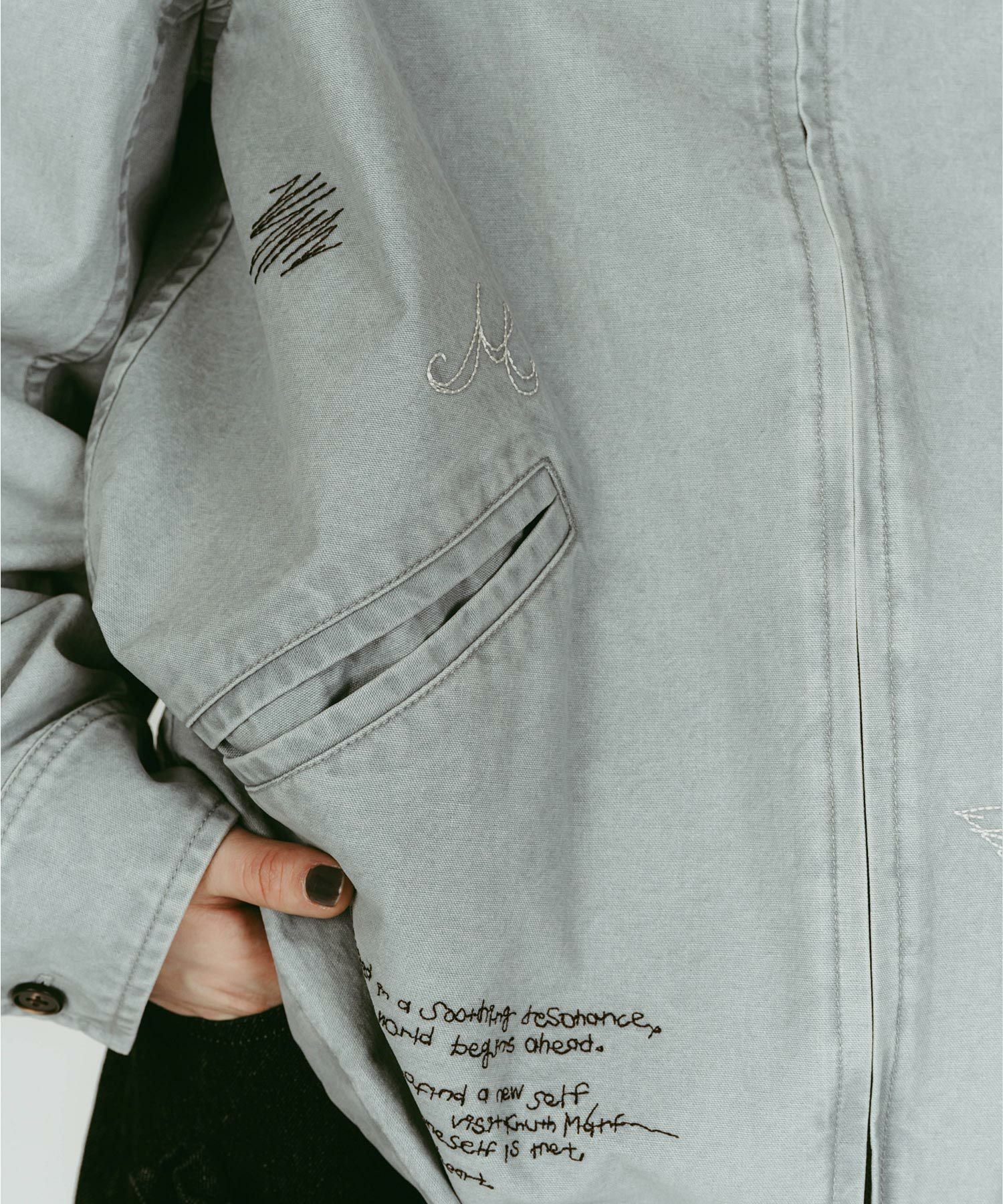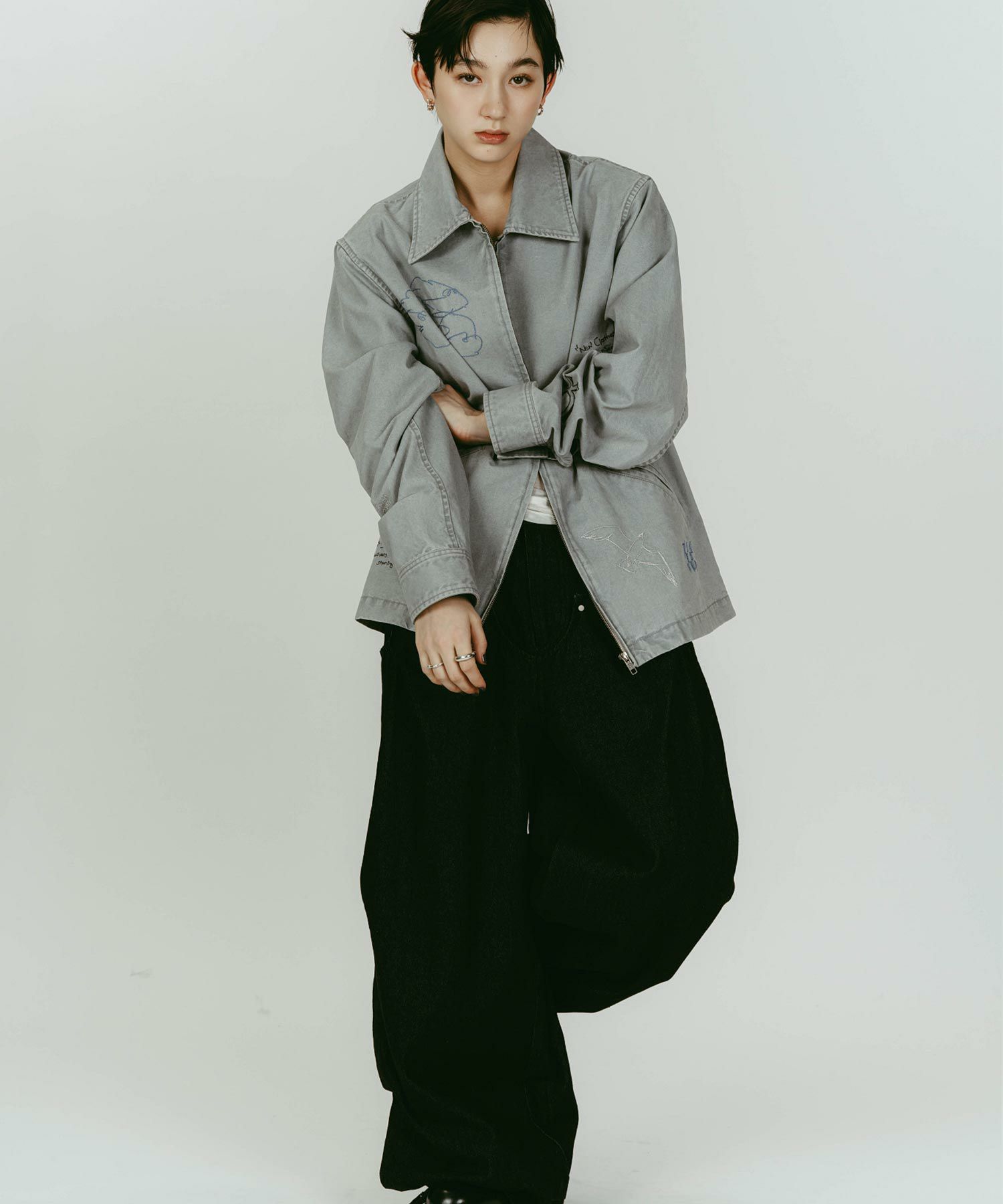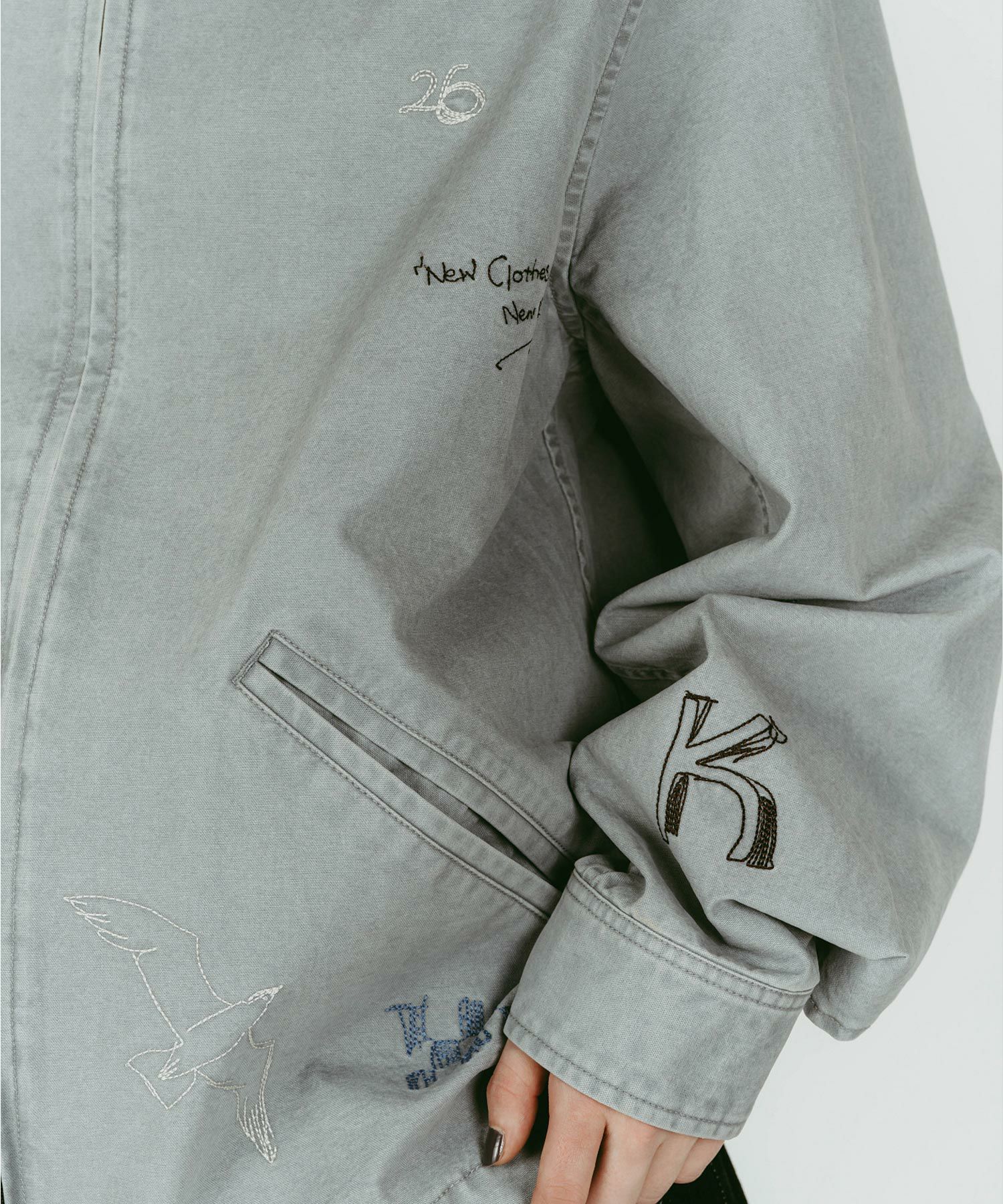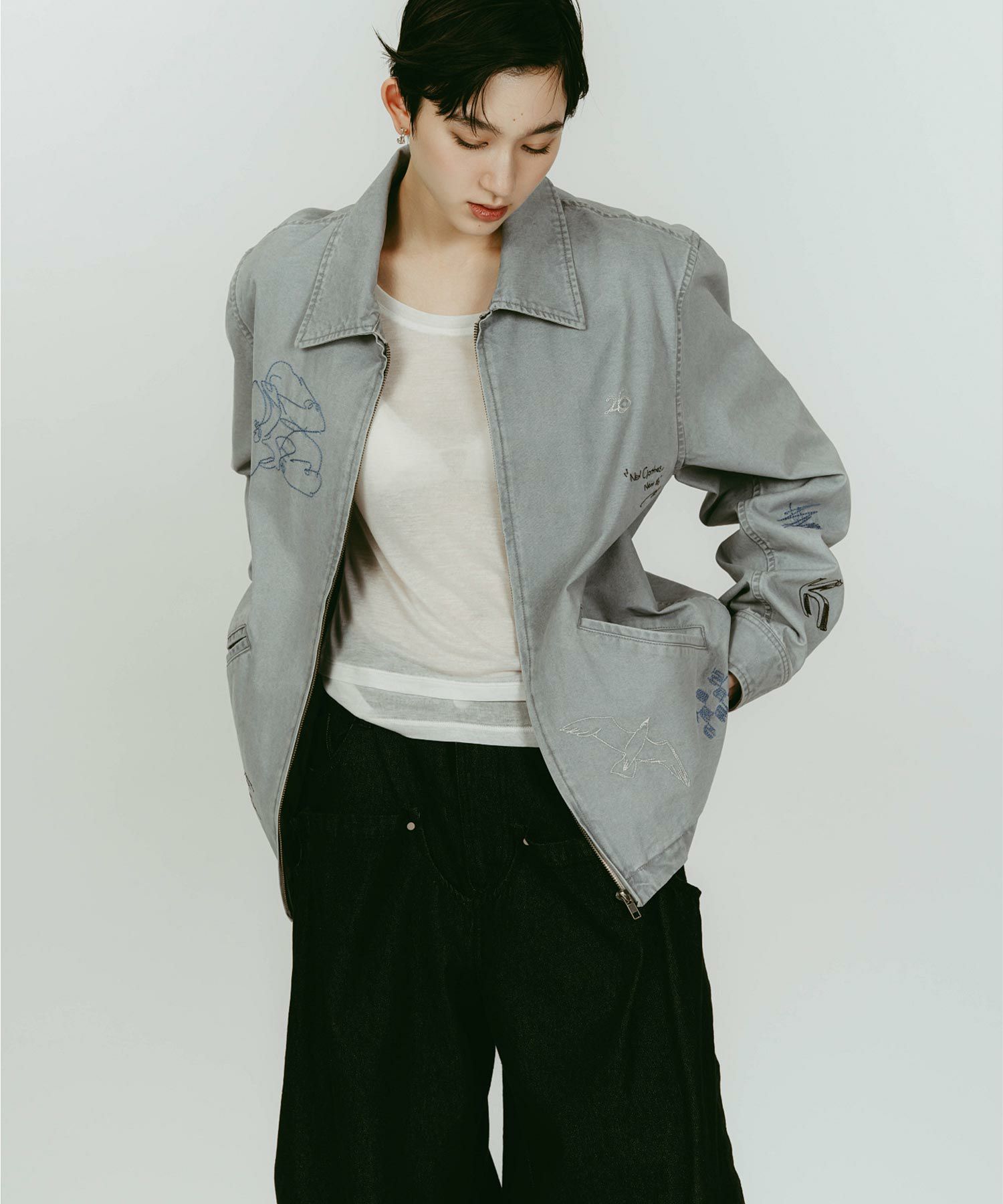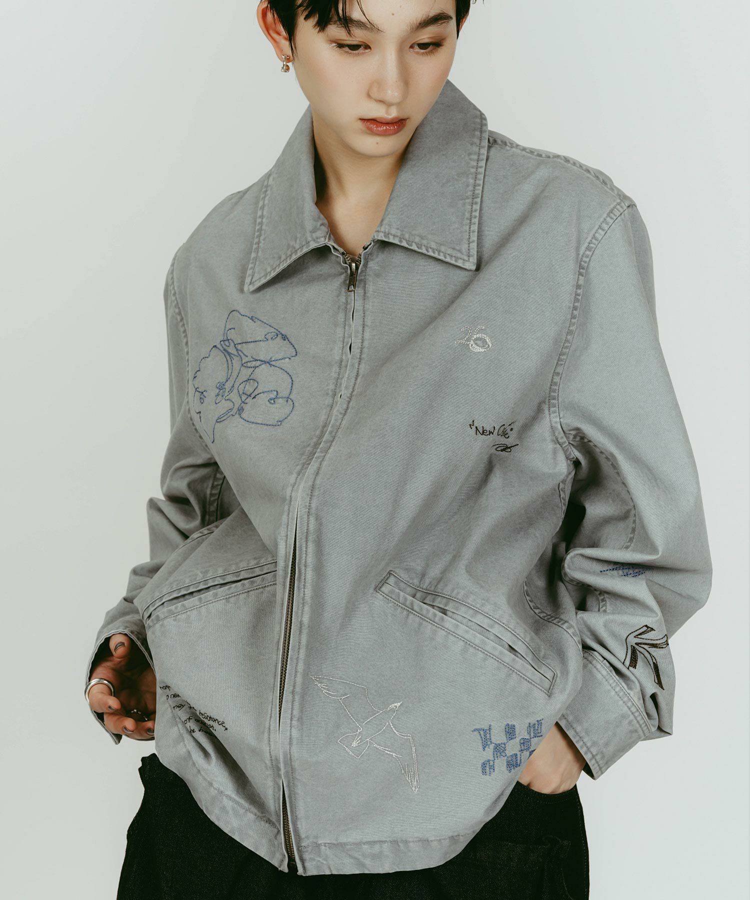 軽やかなライトジャケットに、落書きのように施された丁寧な刺繍が目を惹きます。