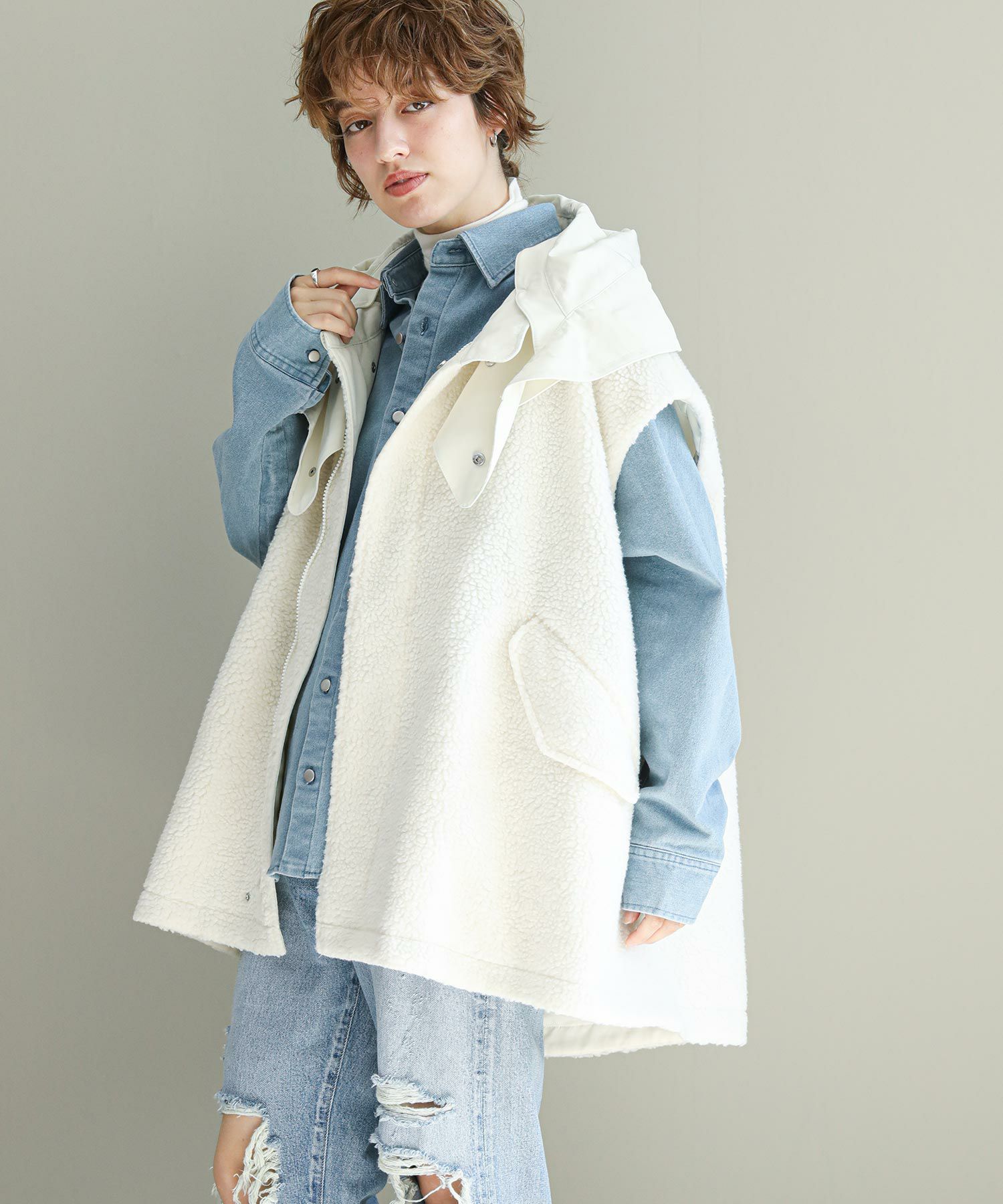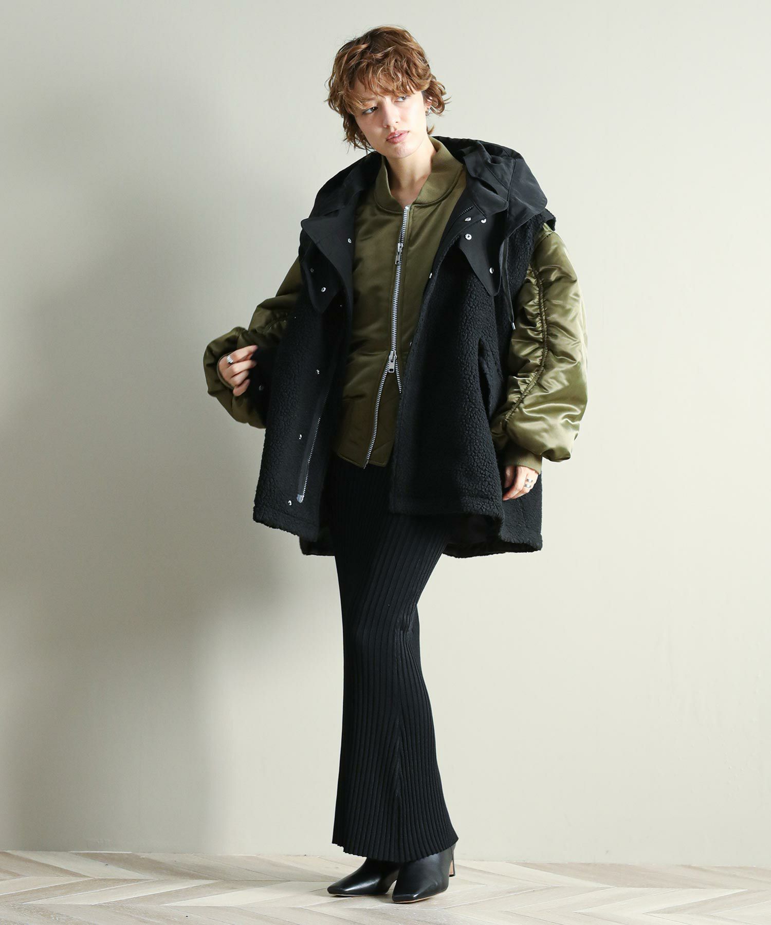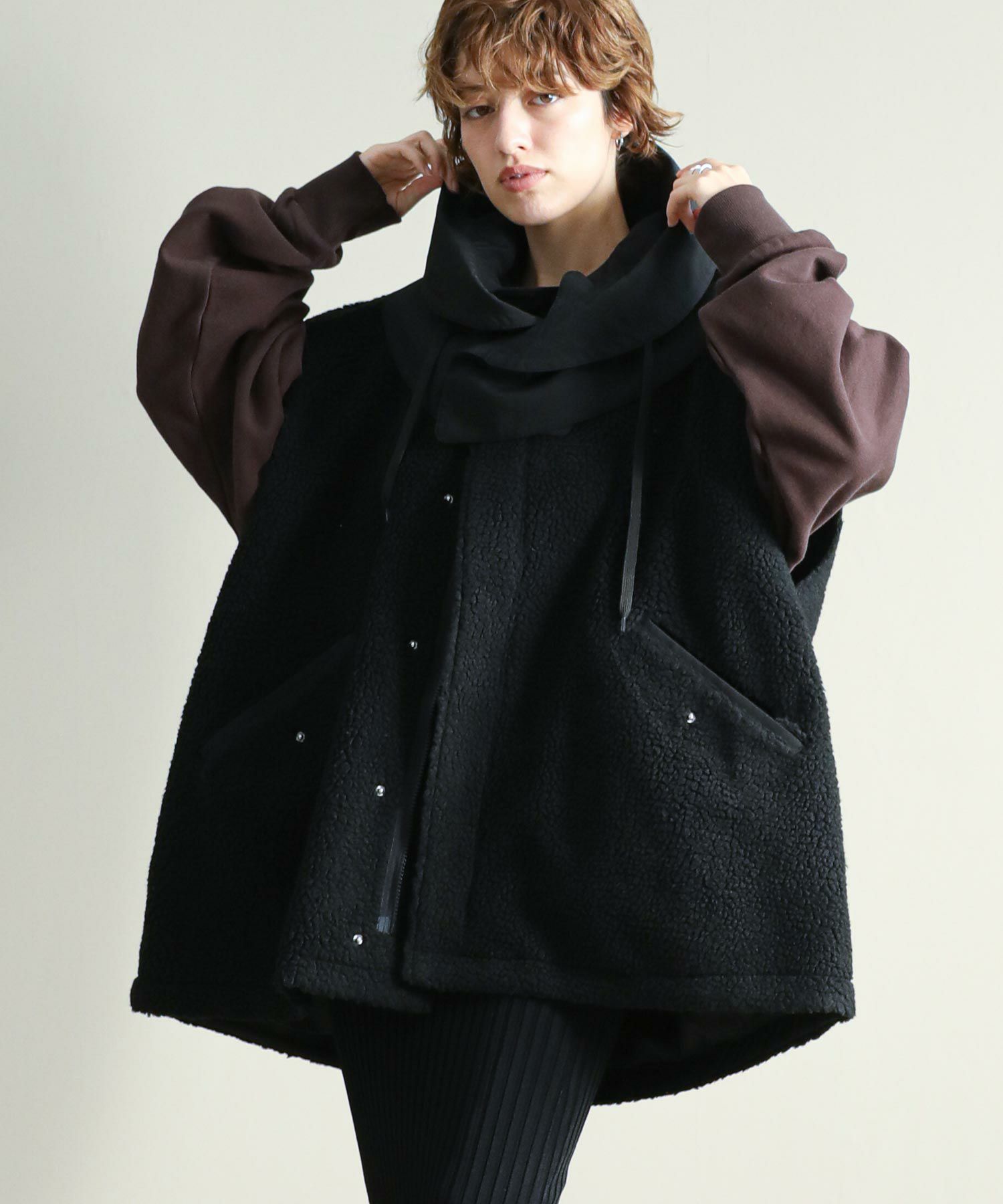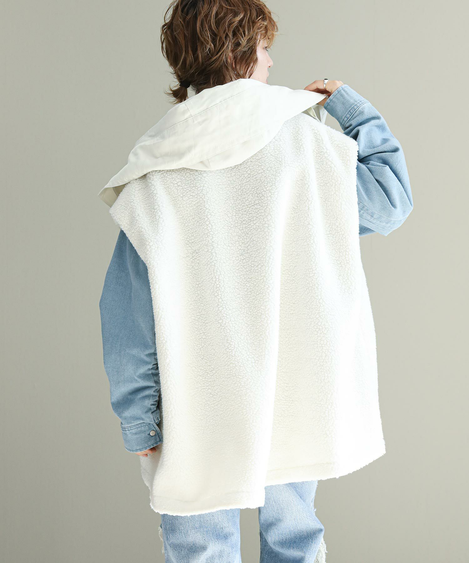 ゆったりとしたサイズ感で厚手のニットやスウェットはもちろん、アウターの上からでも羽織れるデザイン。M65の外付けフードをデザインソースに、しっかり立つ首回りとフードの大きさにこだわり、小顔効果も◎ハリ感のある素材できれいなシルエットを作ります。テーラードジャケットやMA-1の上から羽織るとこなれ感も出ておすすめです。ボアとタフタを同トーンでまとめワーク感が出すぎないようにしています。