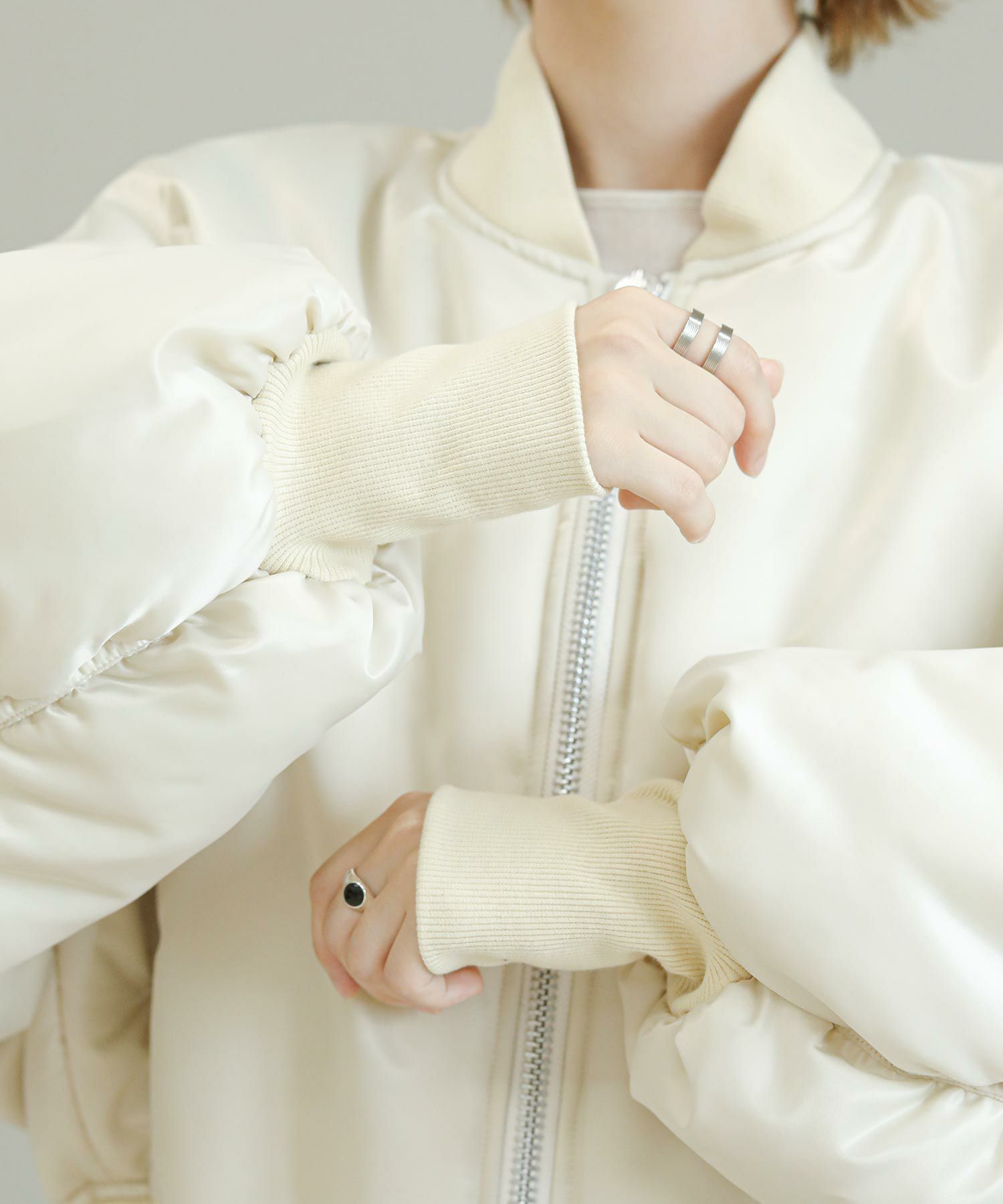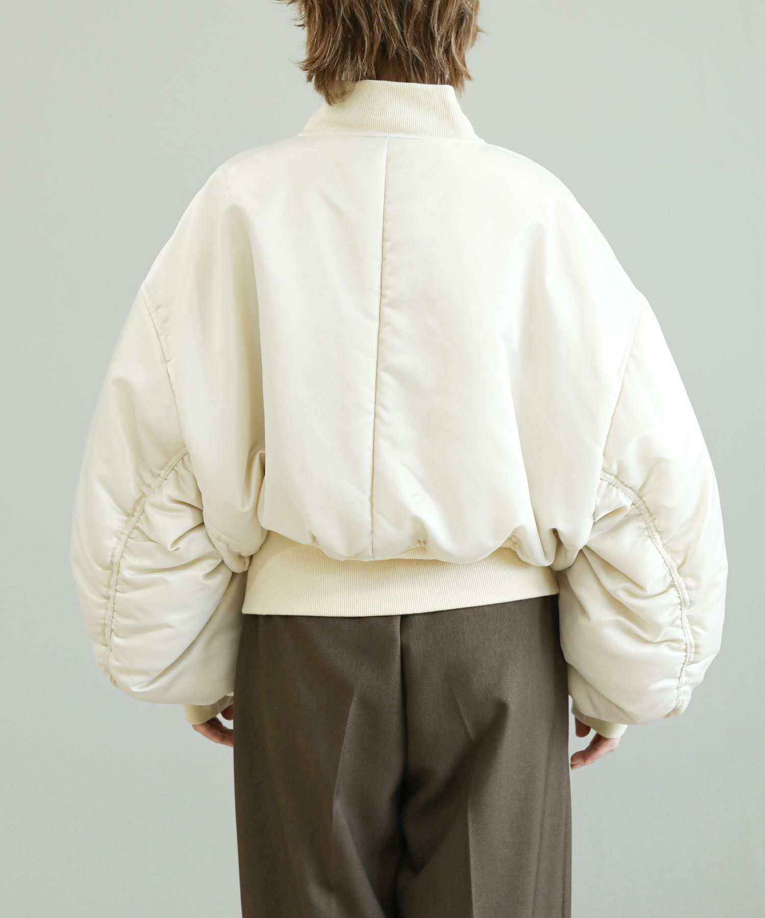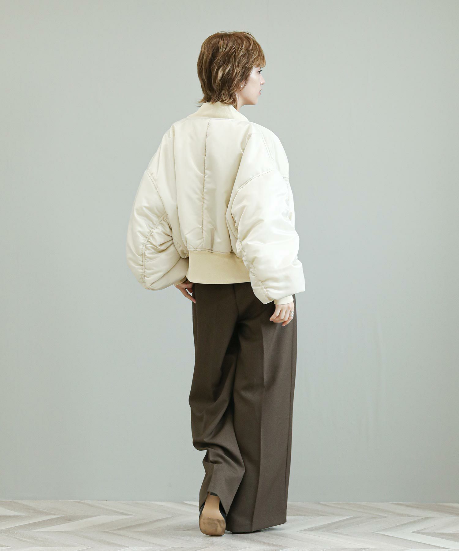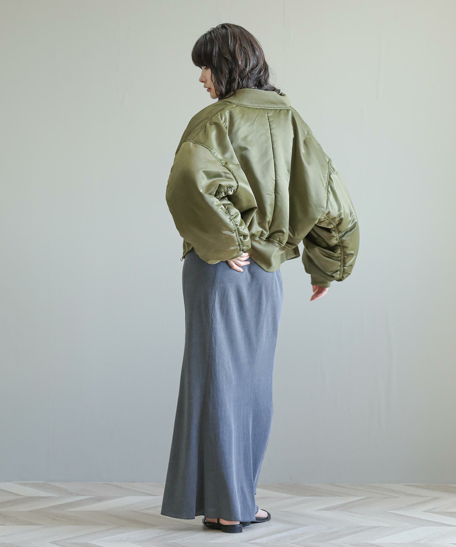 着丈と袖のバランスがポイント。さっと羽織るだけでスタイルが決まります。重厚感のあるファスナーやヘビーなリブなどMA-1らしさに拘りながらも女性らしいスタイルにマッチするシルエットです。今シーズンはライトベージュとカーキの2色。重くなりがちな秋冬スタイルを軽やかに仕上げてくれます。