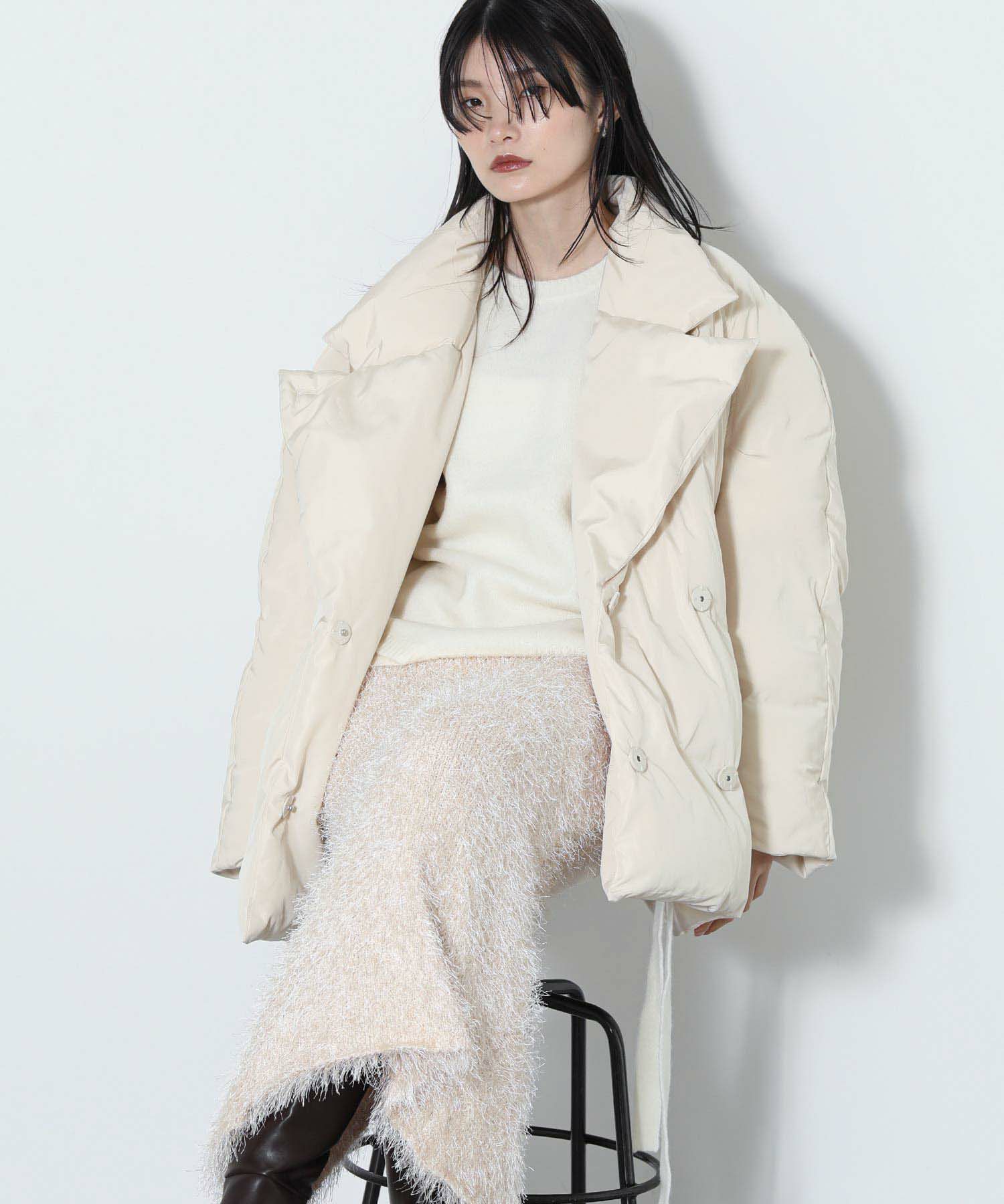 カジュアルに見えがちな中綿ジャケットをテーラードシルエットできれいめな印象に仕上げました。