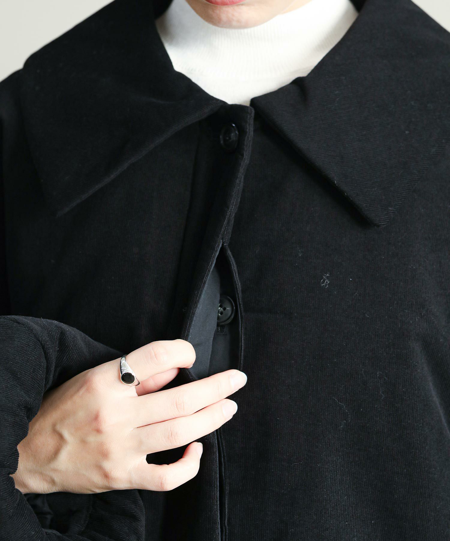 細畝のコーデュロイ素材を使用した中綿入りのショートコート。