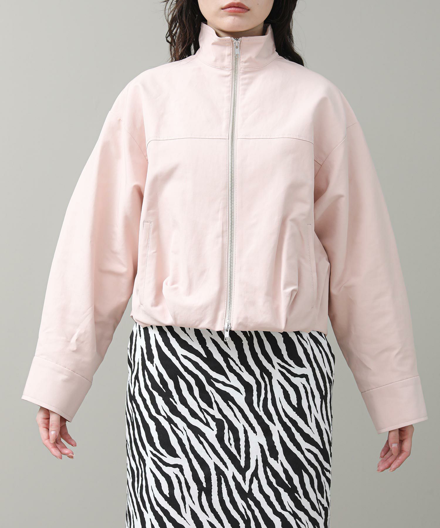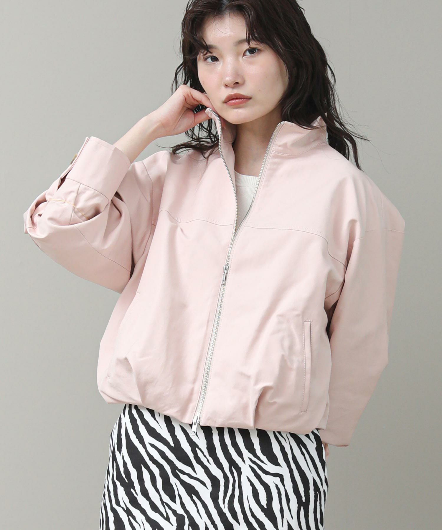 シワになりにくいマットなコットンツイル二重織り素材を使用。ショート丈にバルーンシルエットを掛け合わせ、太めの袖幅にスタンドカラーでモードなニュアンスをプラス。ダブルジップ仕様でレイヤードしやすく、シルバーのファスナーがシャープなアクセントに。華やかなピンクが春のスタイリングを明るく仕上げます。ショート丈なのでフレアスカートやワイドパンツともバランスがとりやすく好相性。