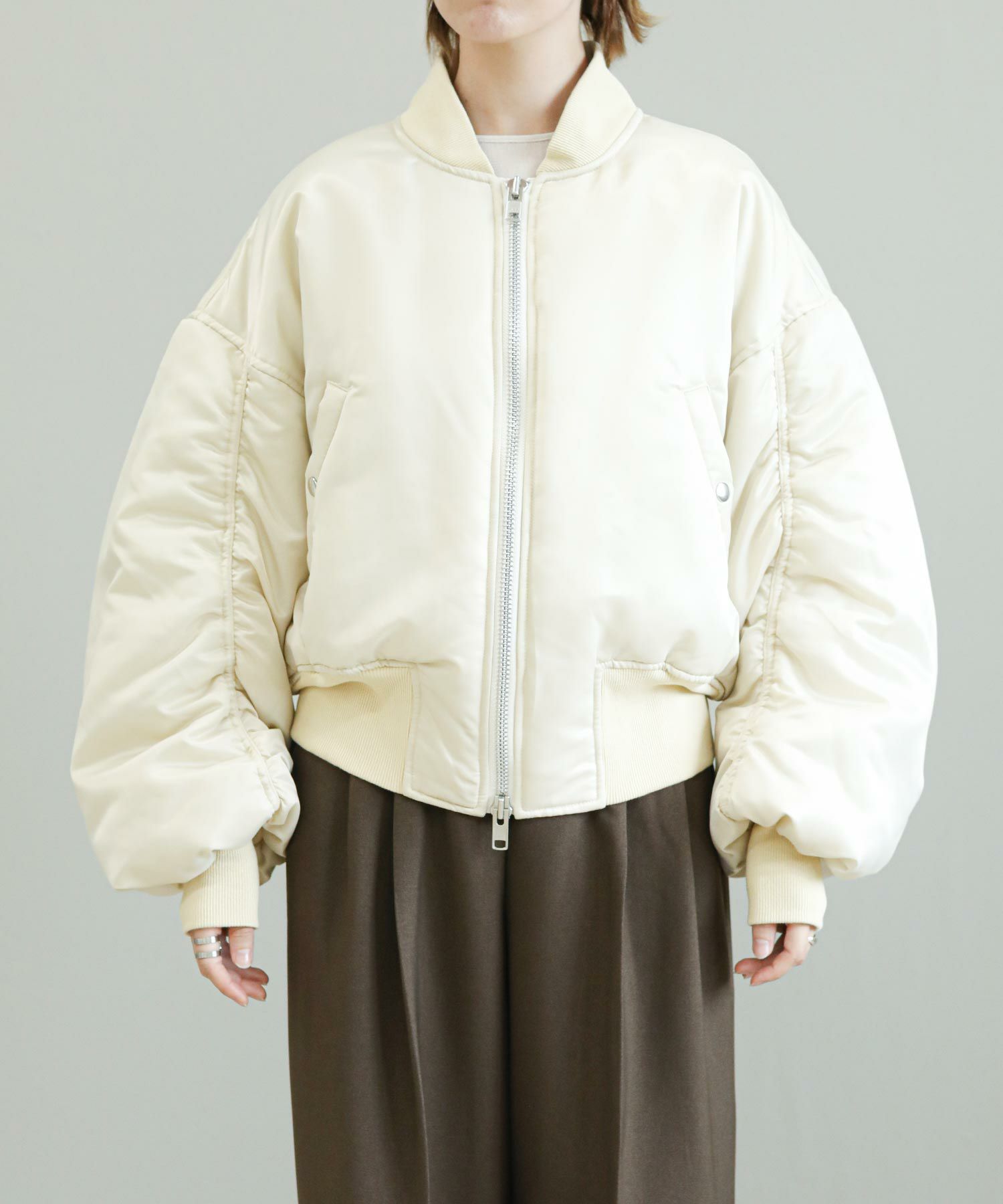 着丈と袖のバランスがポイント。さっと羽織るだけでスタイルが決まります。重厚感のあるファスナーやヘビーなリブなどMA-1らしさに拘りながらも女性らしいスタイルにマッチするシルエットです。今シーズンはライトベージュとカーキの2色。重くなりがちな秋冬スタイルを軽やかに仕上げてくれます。