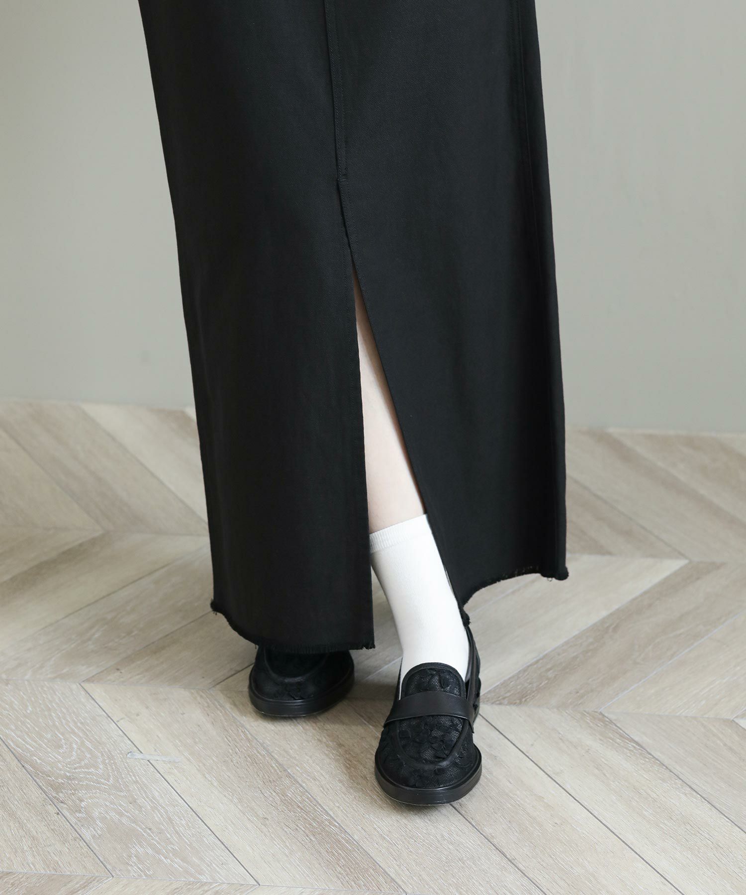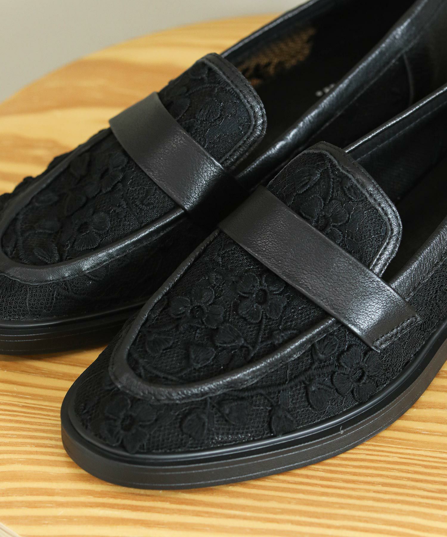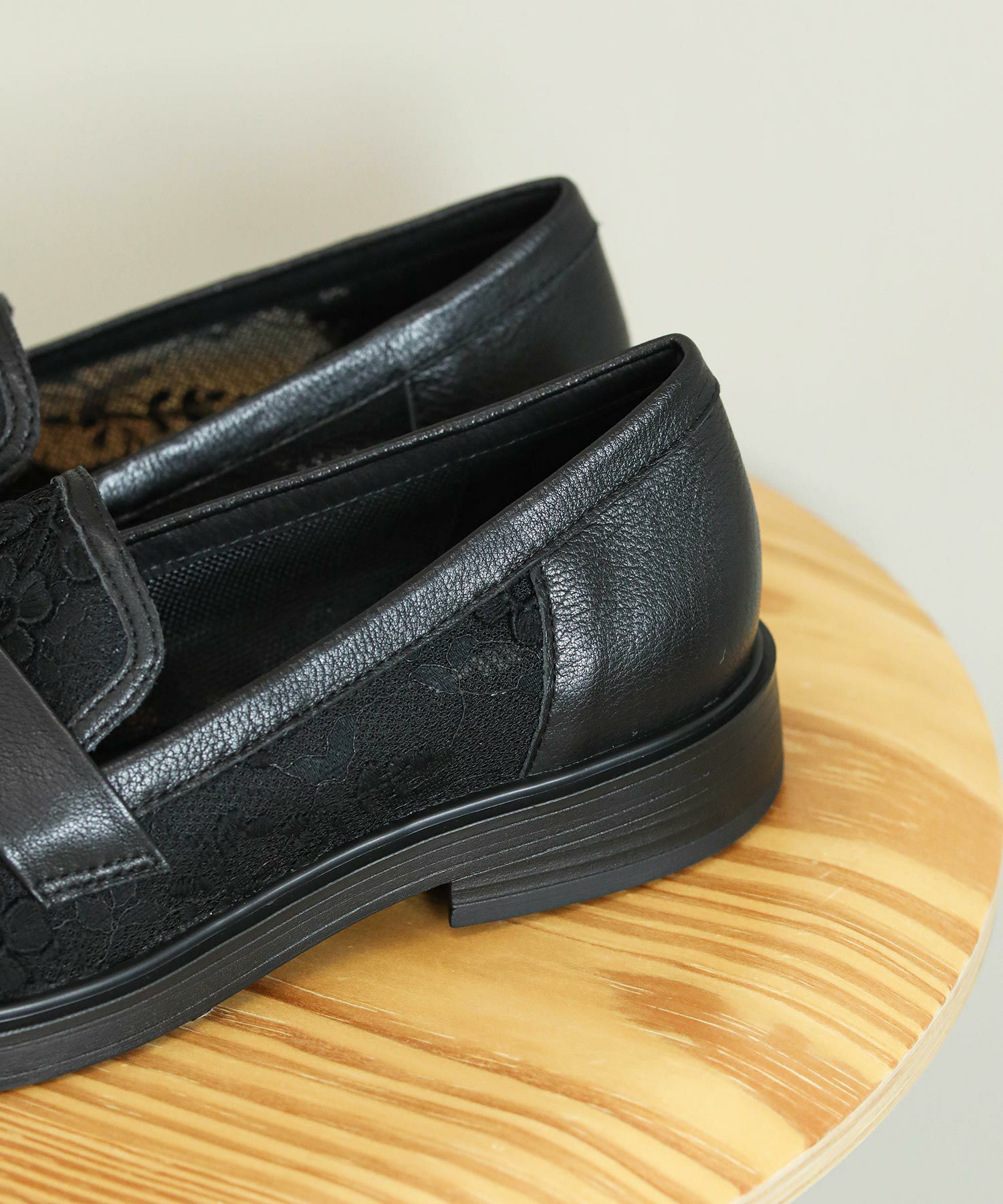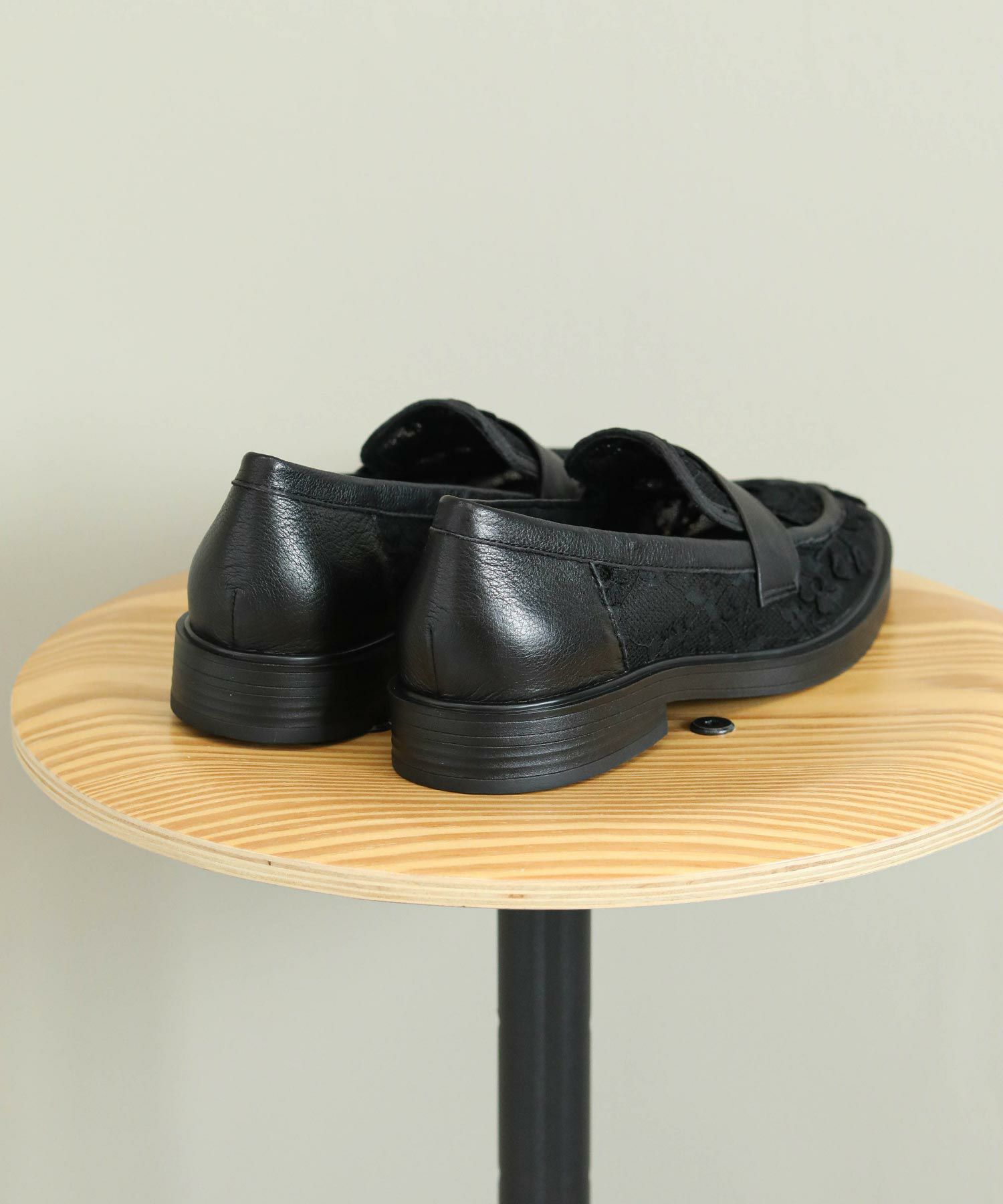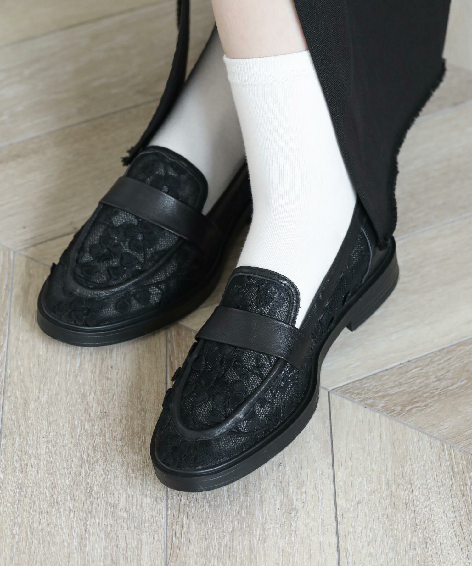 黒を基調としたメッシュ素材の透け感がレースの甘さを抑えモードな印象。甲部分にあしらわれたレザーディテールがアクセントを添えます。靴下を合わせて色の変化を楽しむのがおすすめ。いつものデイリースタイルに合わせるだけで、洗練された雰囲気に。