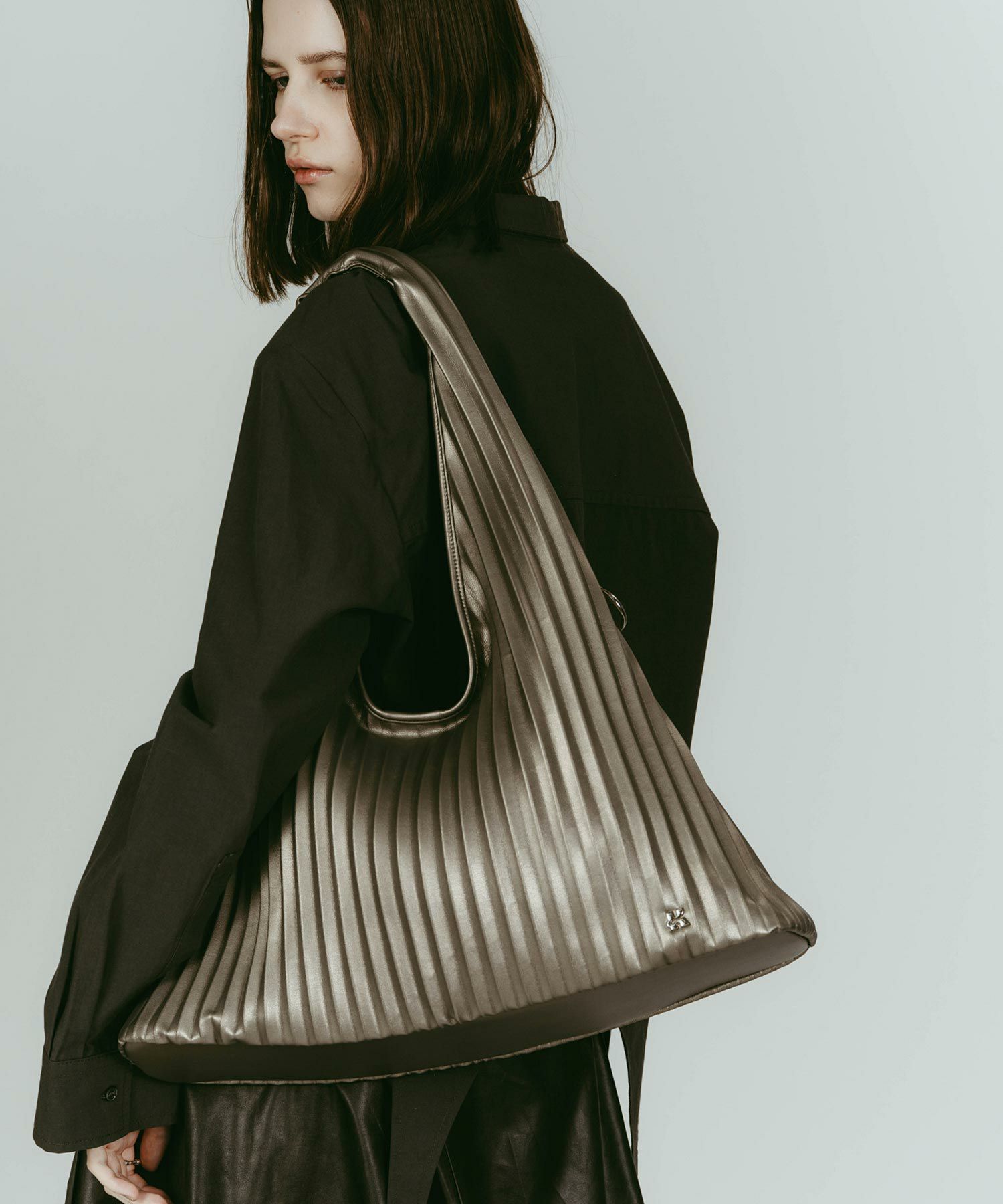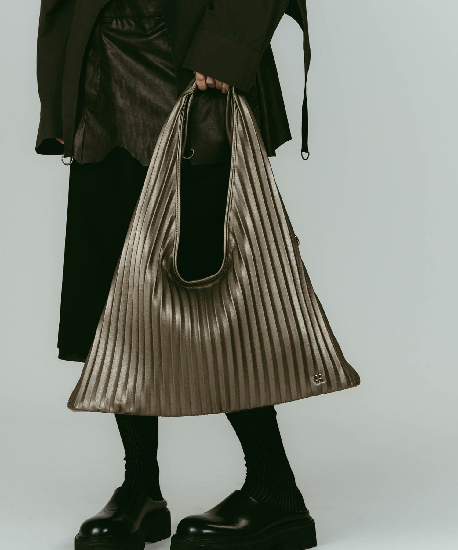 収納力を目的としたサイズ感でありながら、その存在感は実用にとどまらず、スタイリングの一部として機能するボリューム感。直線と曲線が交差するプリーツ構造が、持つたびに表情を変えます。装飾はあえてシンプルに、Kモチーフとキーリングのみで、幅広いスタイルに合わせやすいのも魅力です。自立するよう底部分は硬く仕上げているので、通勤、通学、デイリー使い、幅広いシーンで着用できます。