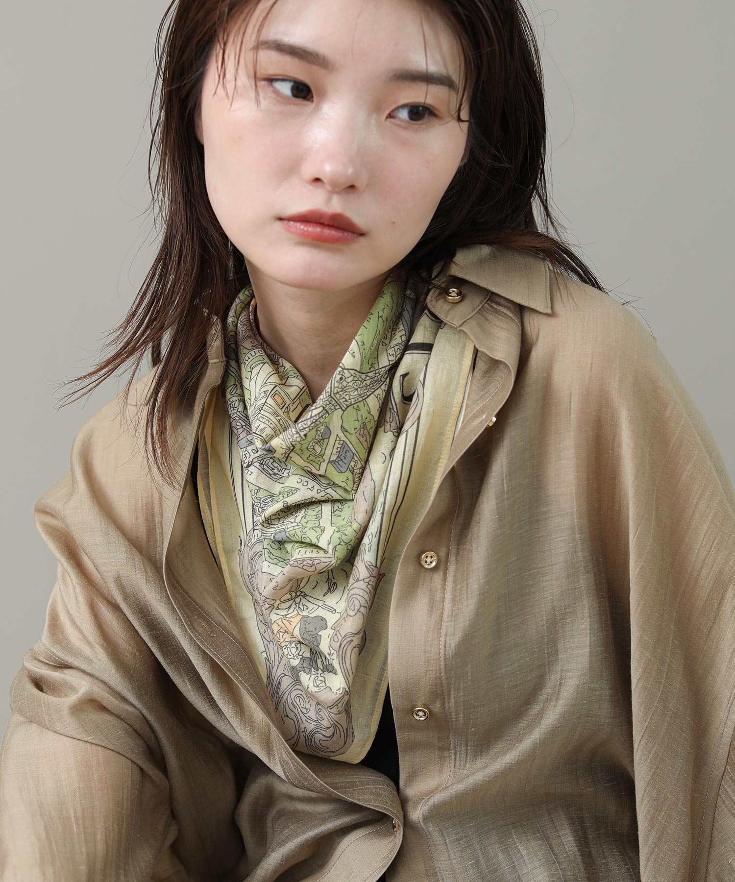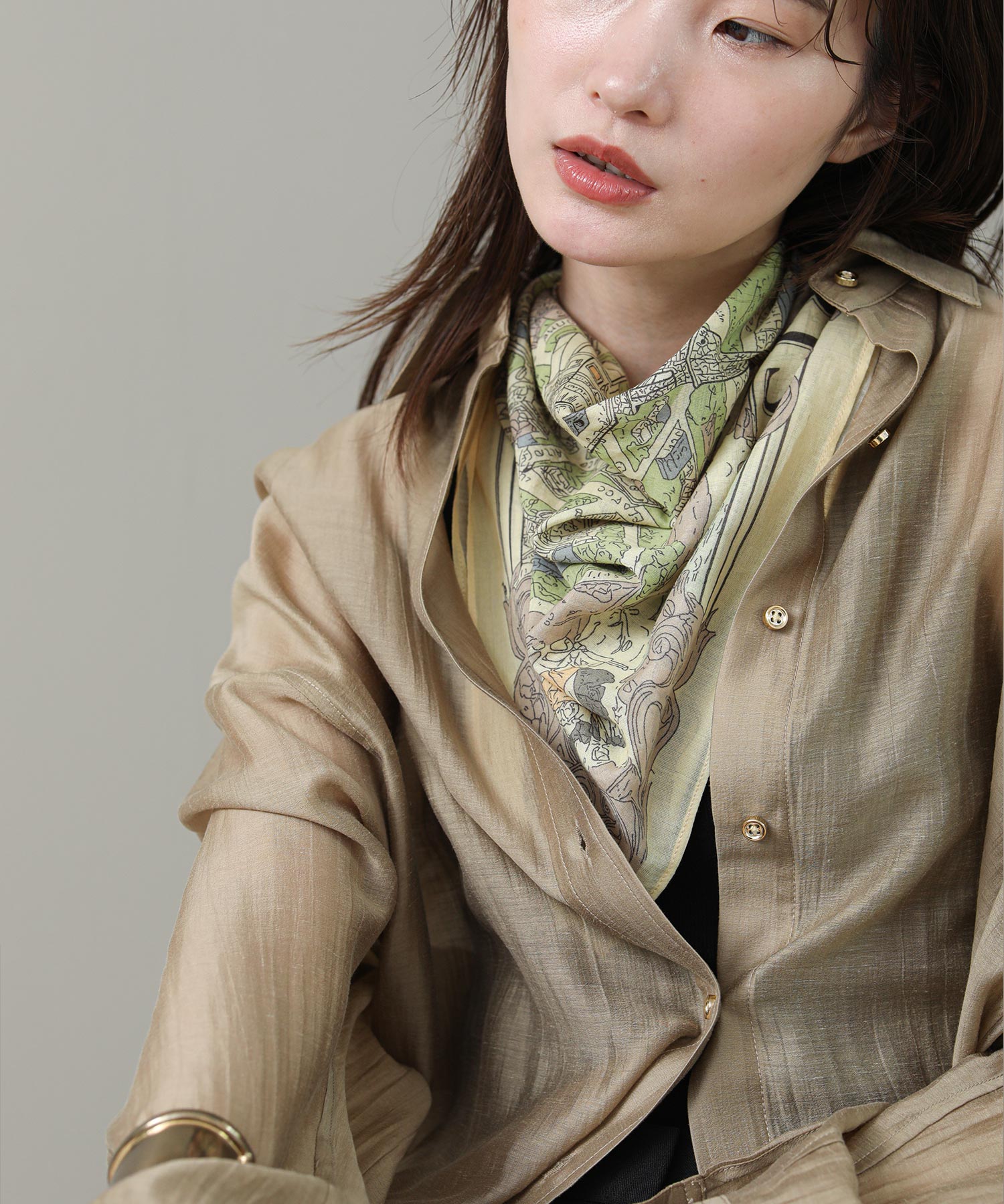 細やかなタッチで描かれた街並みや建物、川の流れまで丁寧に表現されたデザインは、広げるたびに新しい発見があるような楽しさ。シンプルなコーディネートにさりげないアクセントをプラスしてくれます。柔らかくあ肌触りが良いので首元にもストレスなく巻いていただけます。
