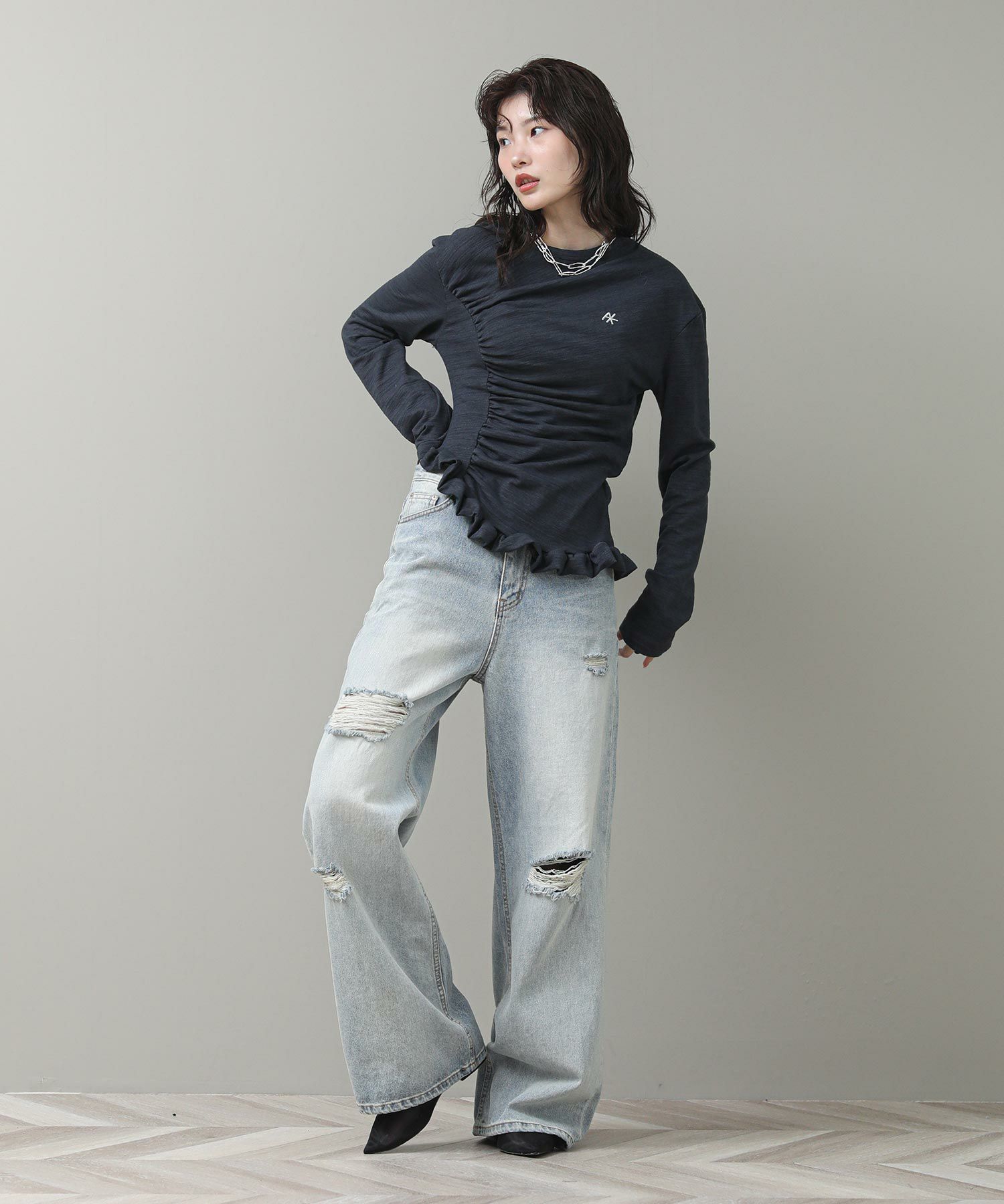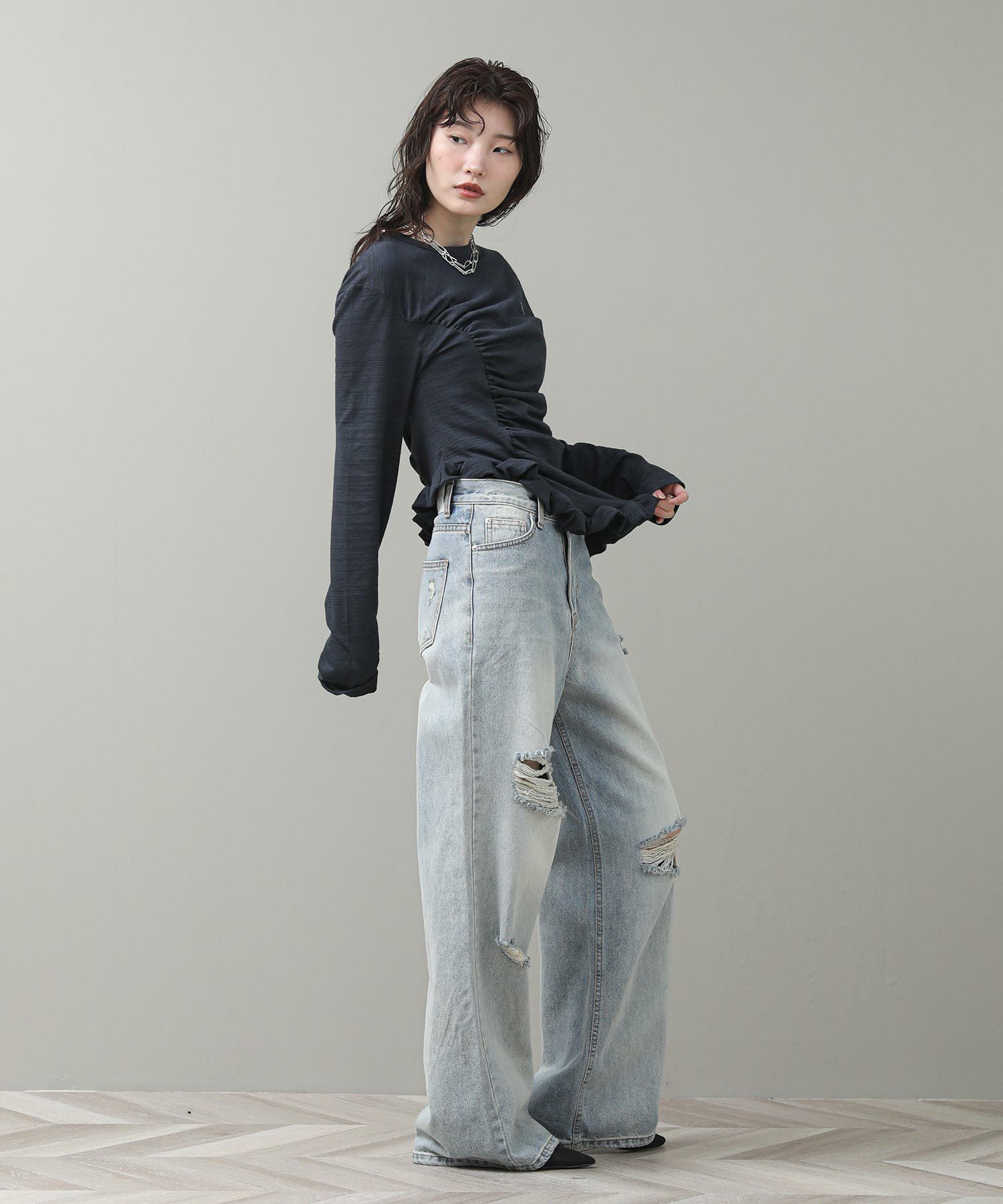 カットソーやスウェットなど日常的なアイテムにエッジの効いたデザインを加え、着心地の良さとデザイン性を両立させたアイテムが魅力のブランド。1枚で着映えるデザイントップス。デニムやスラックスなどベーシックなボトムと合わせてもモードな印象にまとまります。