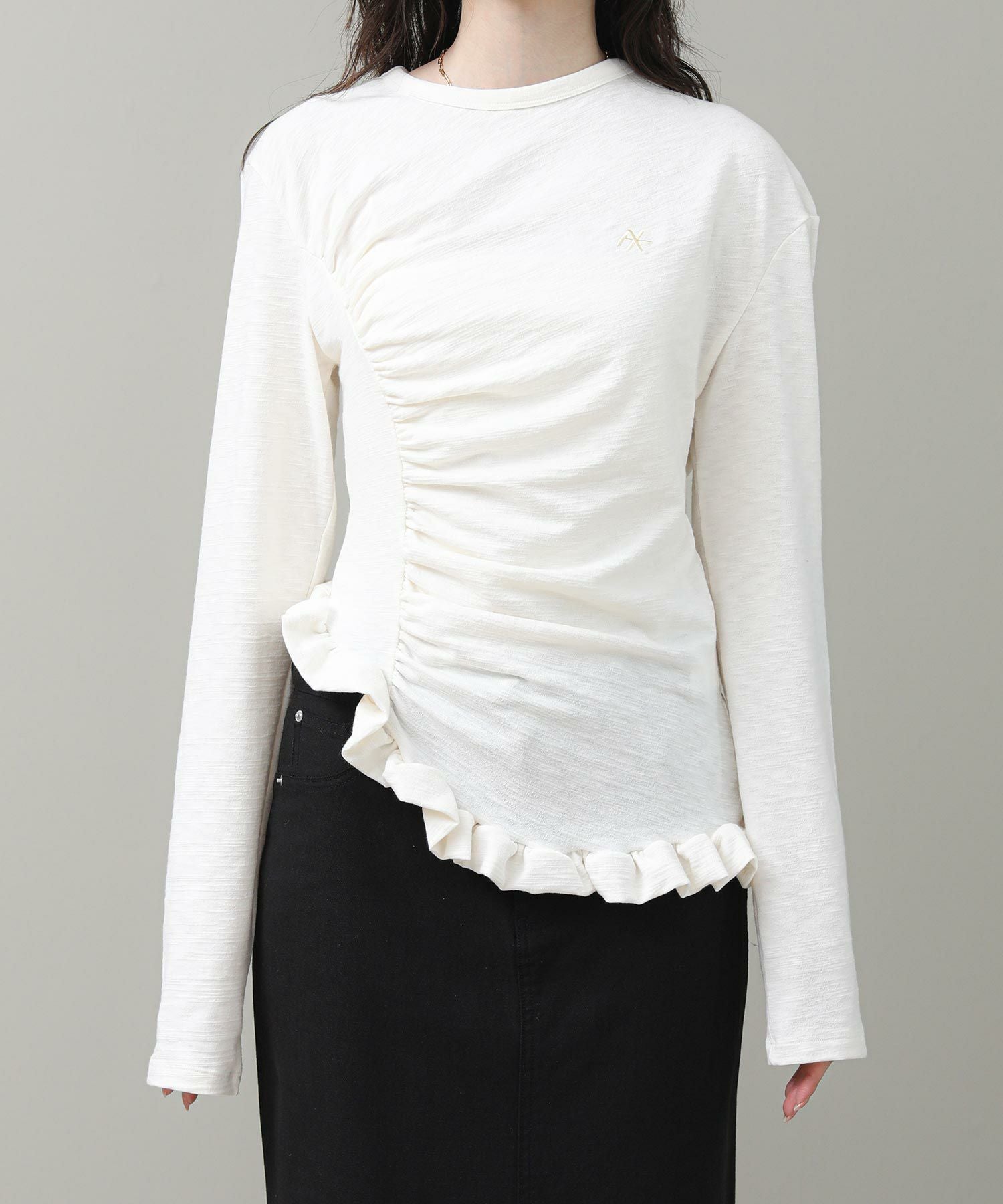 カットソーやスウェットなど日常的なアイテムにエッジの効いたデザインを加え、着心地の良さとデザイン性を両立させたアイテムが魅力のブランド。1枚で着映えるデザイントップス。デニムやスラックスなどベーシックなボトムと合わせてもモードな印象にまとまります。