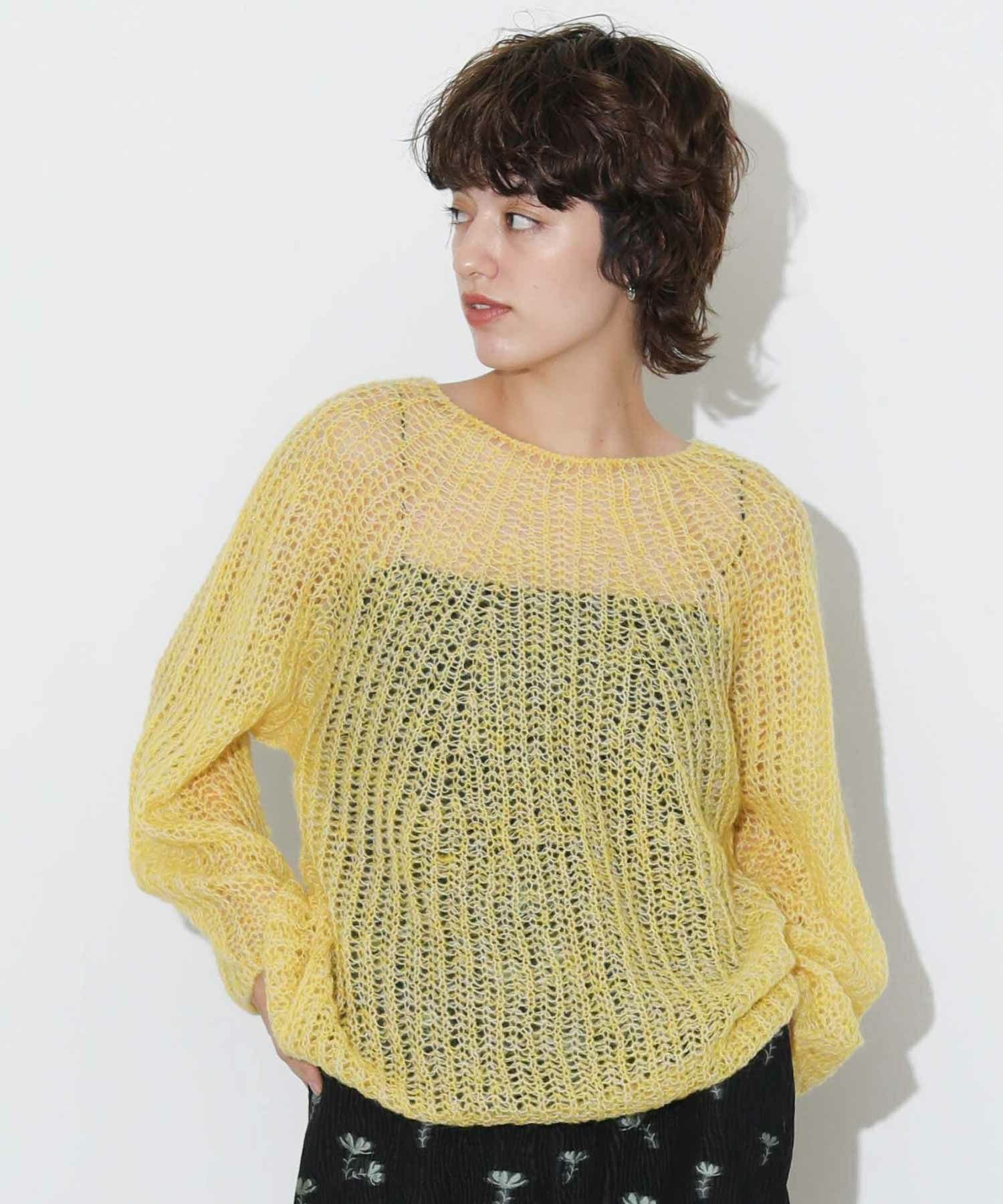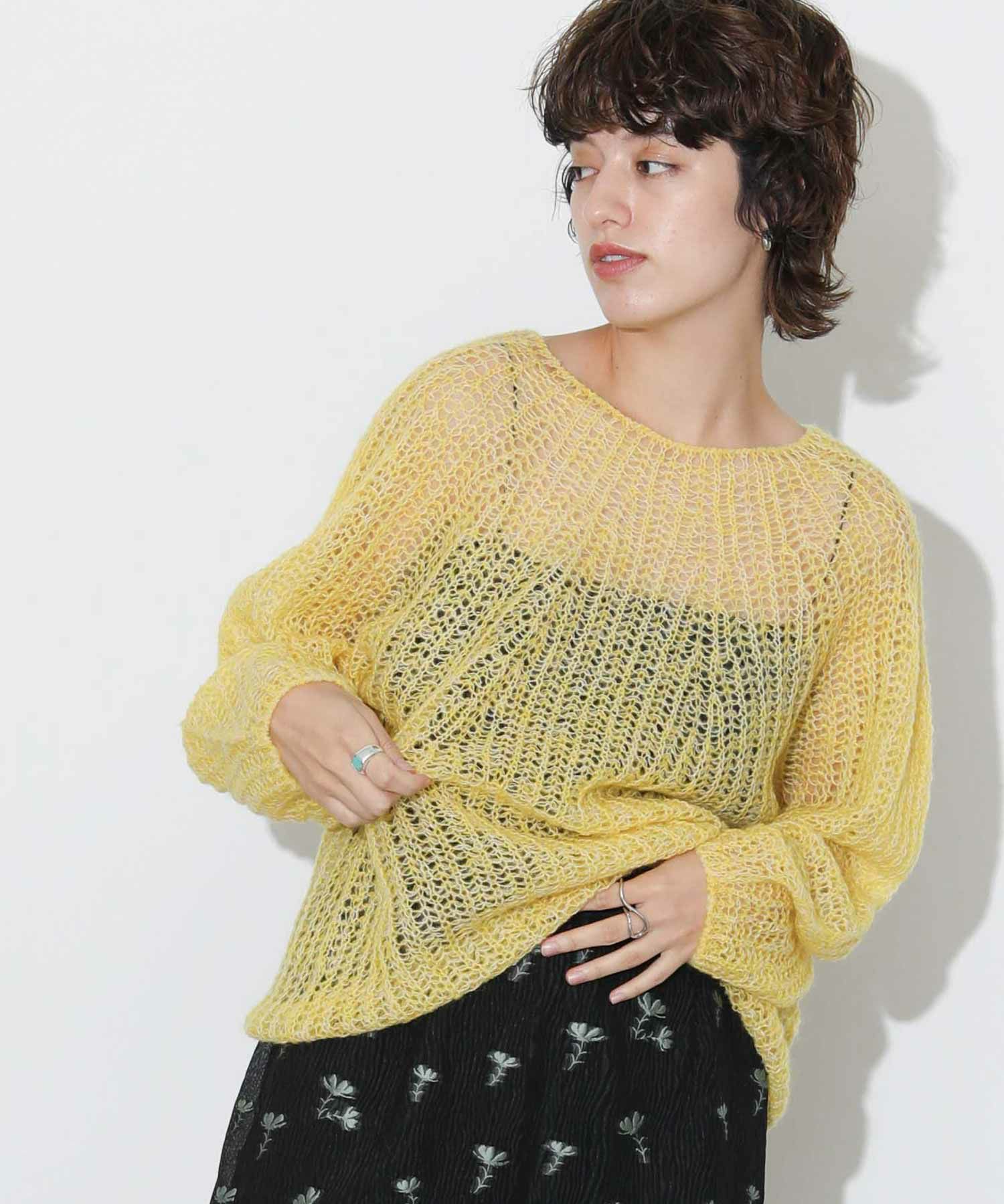 スカシ編のローゲージニットは柔らかい落ち感があり、女性らしい雰囲気に。程よくルーズなサイズ感で、レイヤードスタイルにもおすすめ。合わせるインナー次第で自分だけの着こなしが楽しめます。やや長めの丈は、ボトムスにタックインしてバランスを変化させるのもおすすめです。