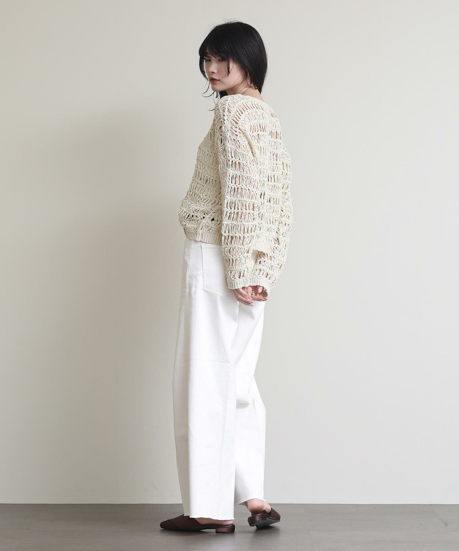 機械編みのパーツを、かぎ針編みで繋ぎ合わせる手の込んだ透かし柄で、ボヘミアンムード漂うニットプルオーバーです。 クラフト感を引き立たせるコットンスラブヤーンを使用し、表情のある編地が特徴です。 こなれ感のある短すぎないショート丈で、インにリブタンクトップを合わせて裾から覗かせるスタイルもオススメです。 裾にはポイントでYENNロゴチャーム付きです。