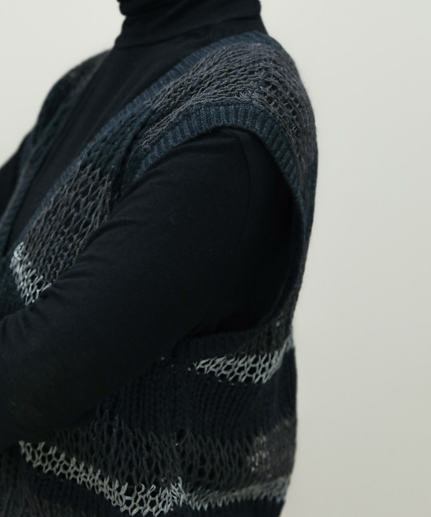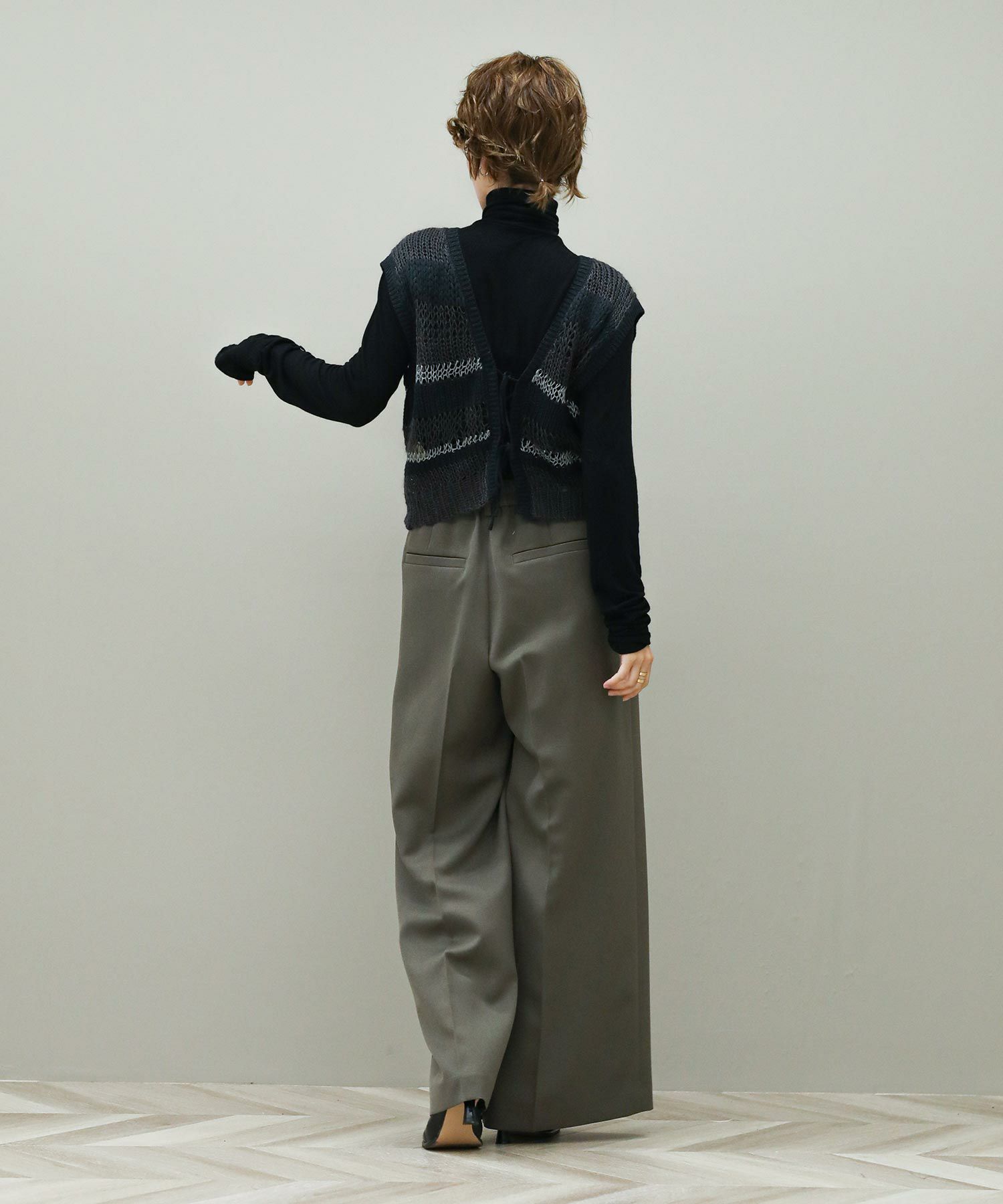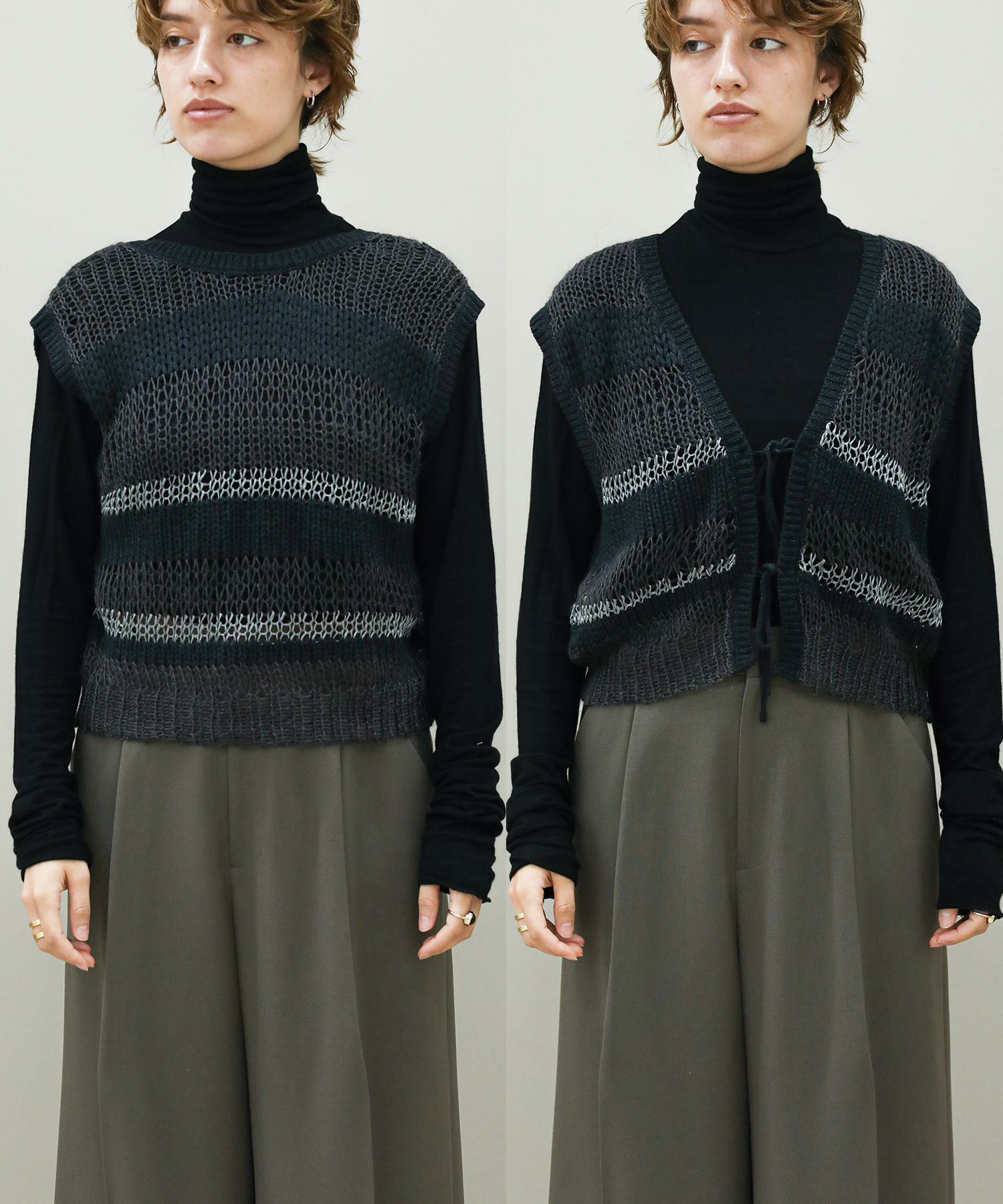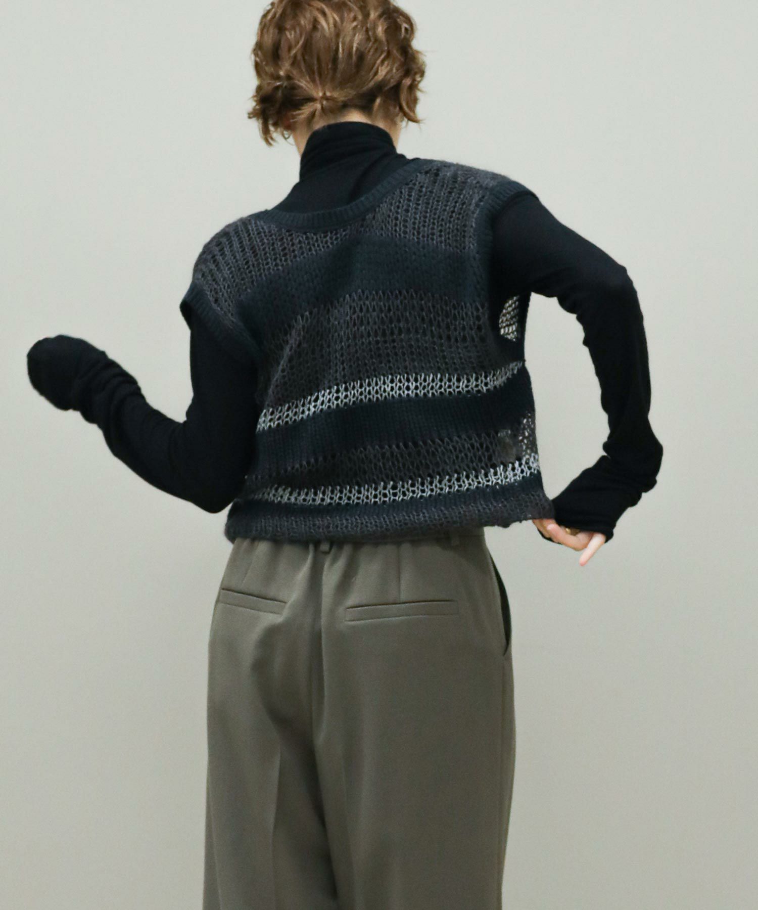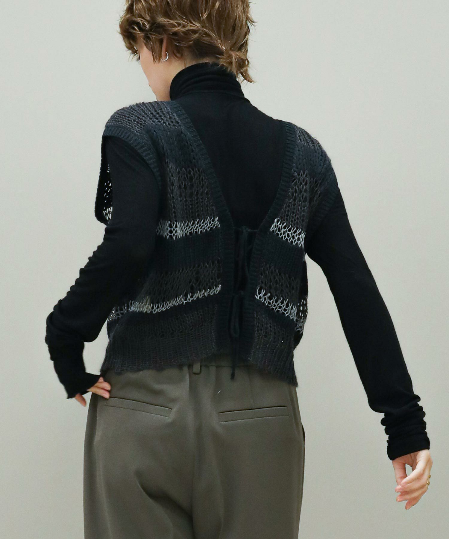 透けている部分とそうでない部分とで編み地に差をつけたボーダー柄。同じ糸を使用した部分も、絶妙に編み方を変化させています。一枚でノースリーブトップスとしてはもちろん、コンパクトな長袖トップスなどとレイヤードして、晩夏から秋冬まで長く着まわしていただけます。深めのVネックとリボン使いがコーディネートに映えるバックスタイルもポイント。Vネック側を前にして、前後2WAYで着用可能です。