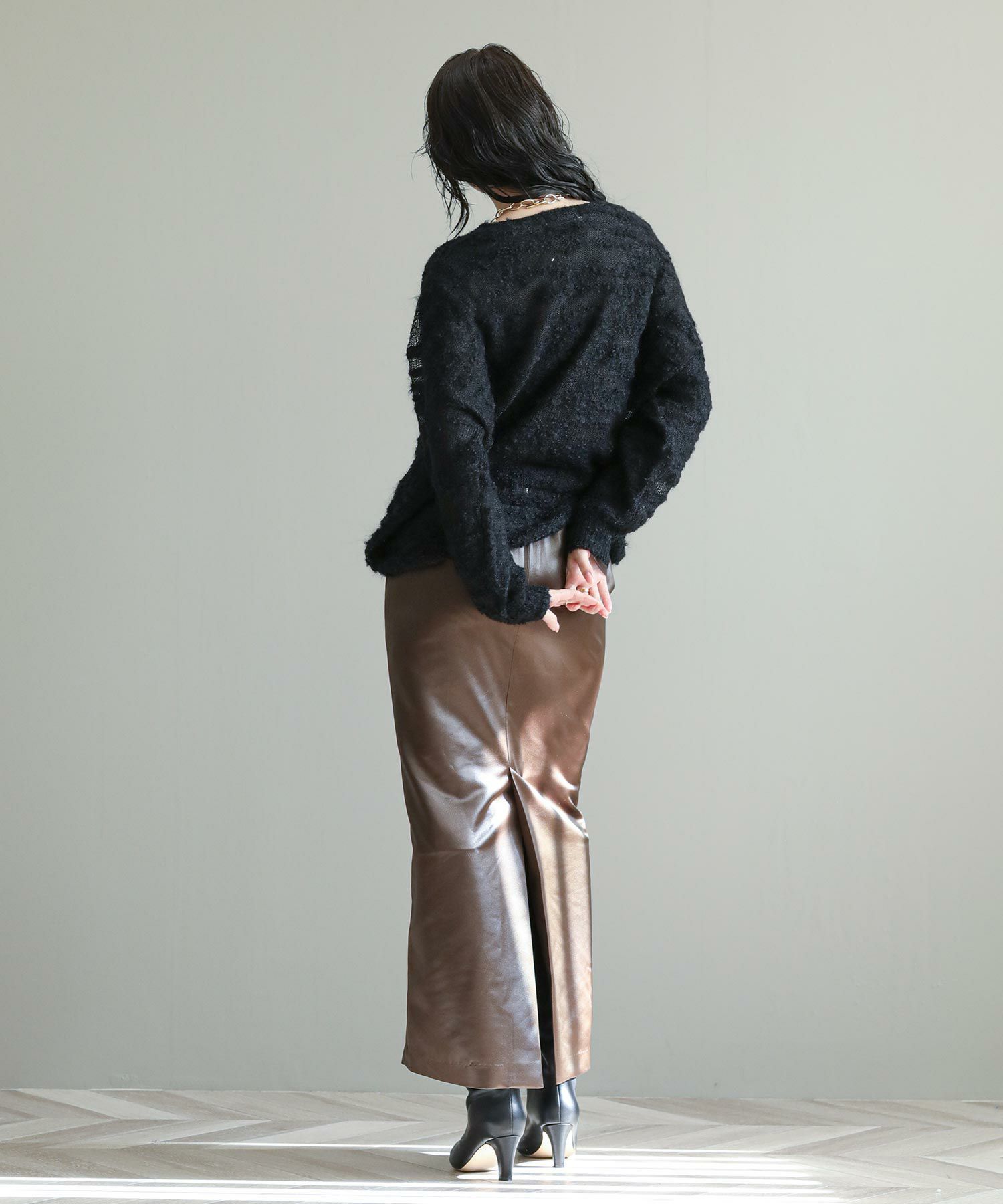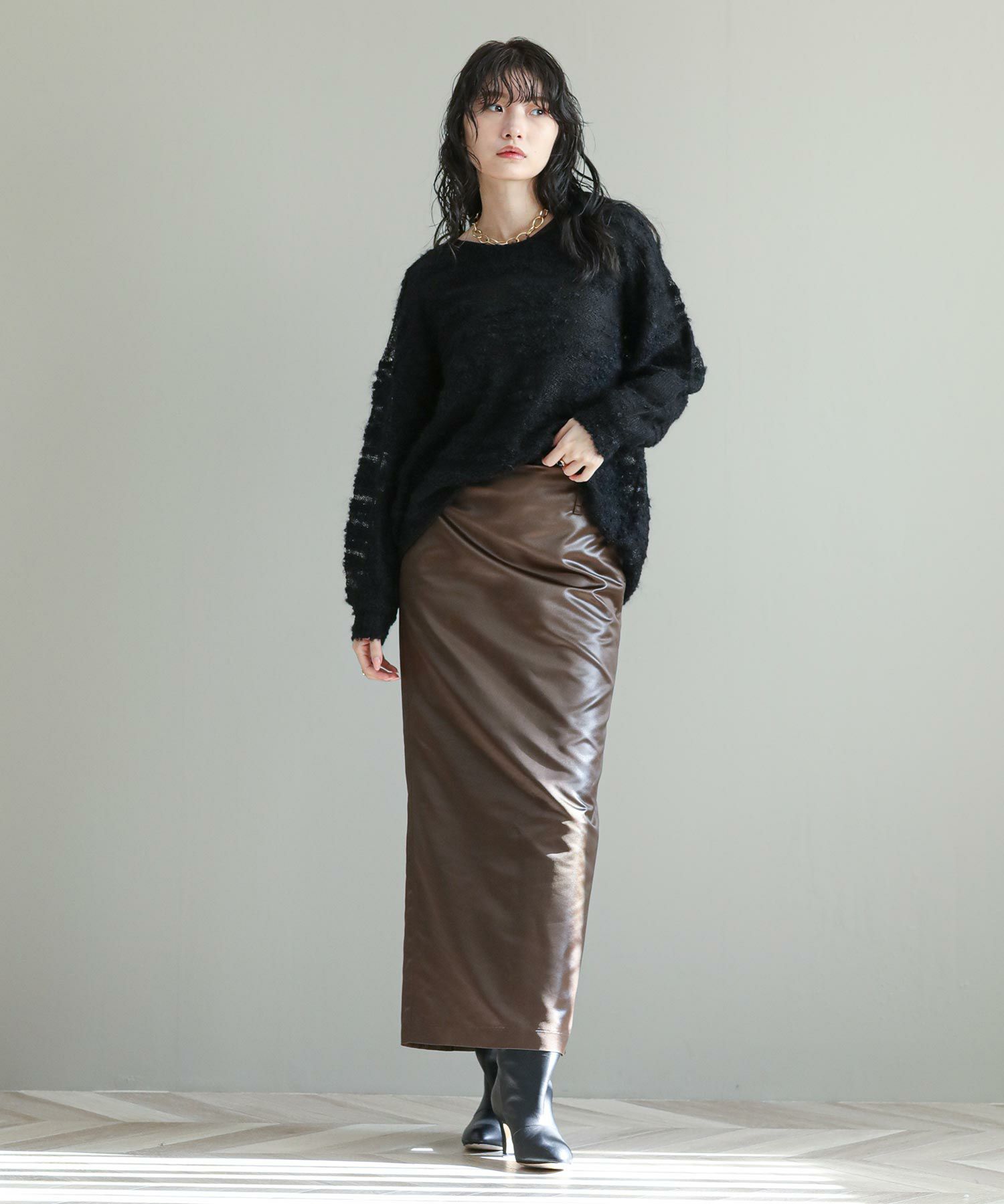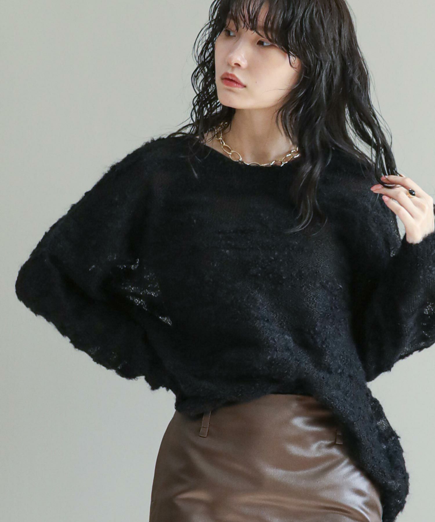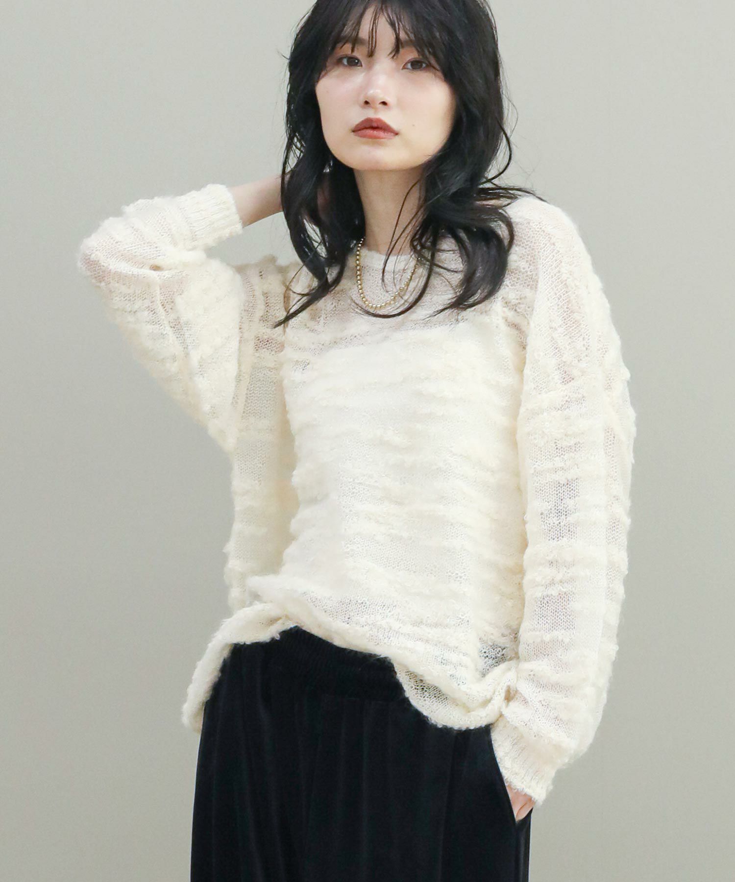 糸の繊細さやループ感を引き立てるためにざっくりとシアー感のある編地に仕上げています。ゆったりとしたサイジングに仕上げているので、シアー感を活かしたレイヤードスタイルを楽しんでいただけます。