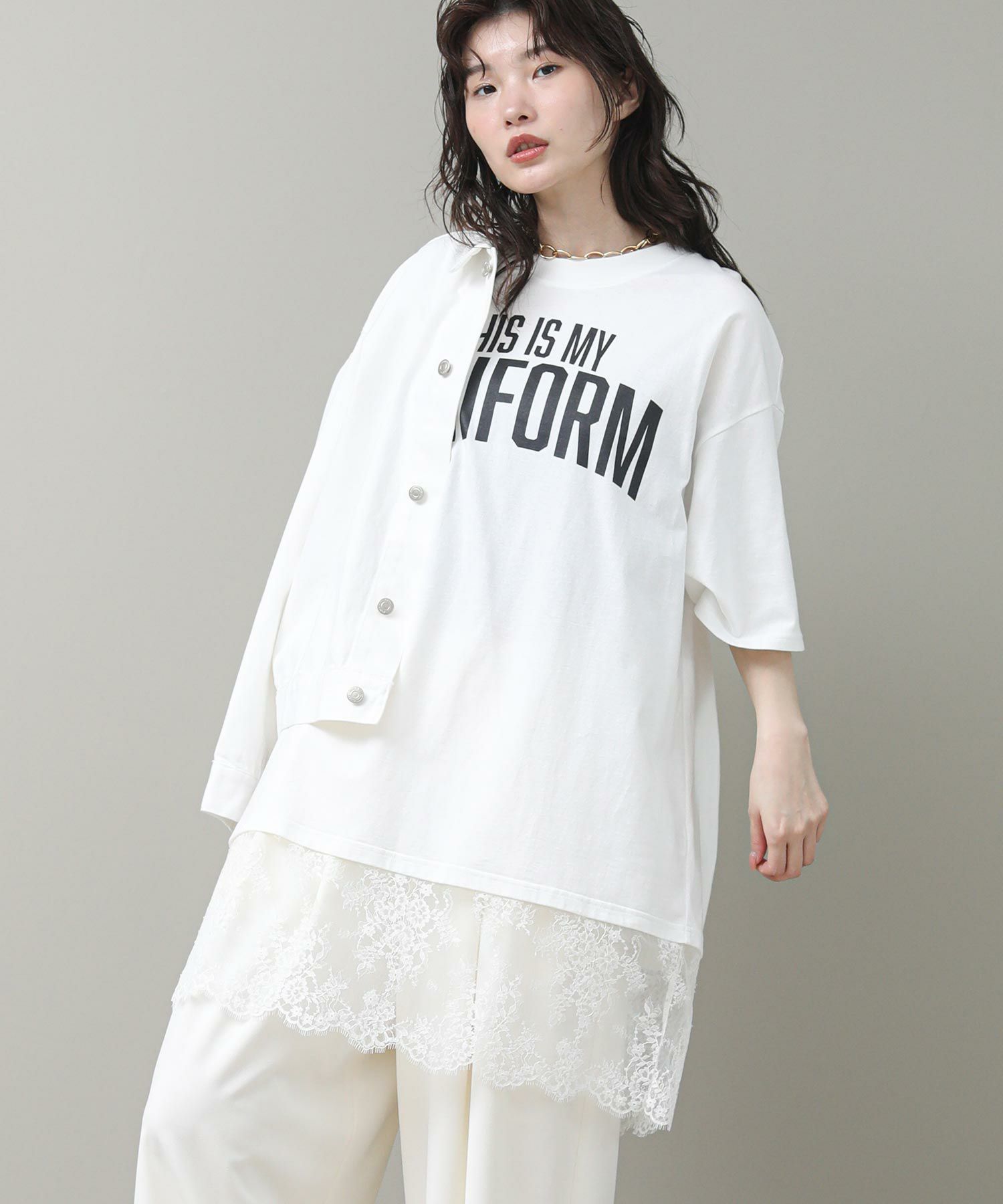 す。甘くなりがちなレースを大人の女性が着てもかっこよく着られるアイテムです。前後のロゴでバックスタイルも決まります。