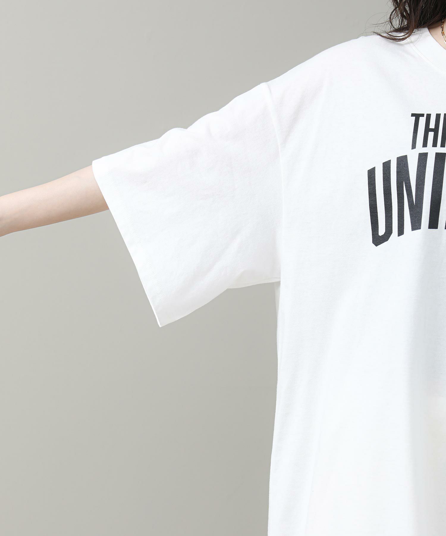 ゆったりとした身頃と袖丈で体が泳ぐシルエットで